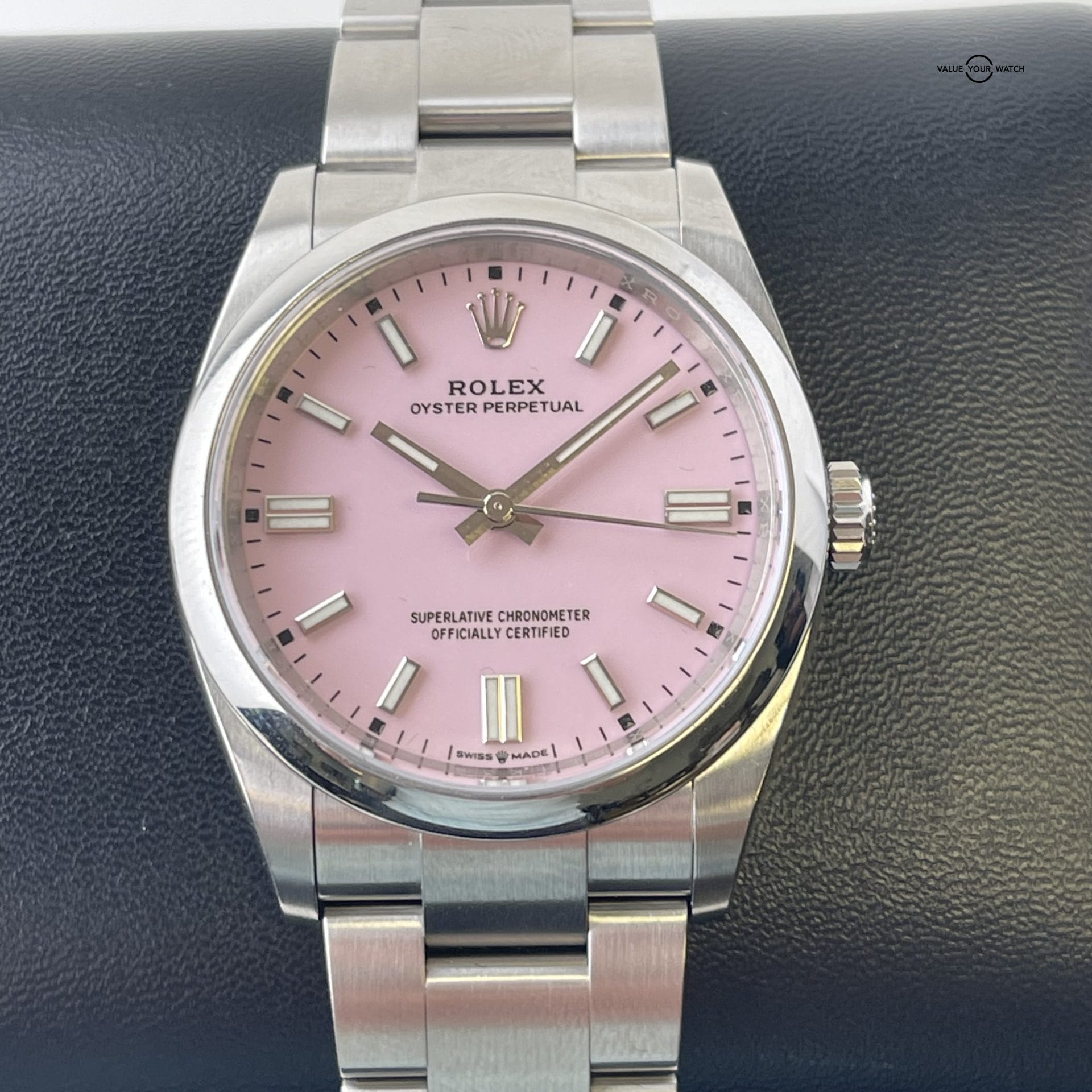 This Rolex Oyster Perpetual wristwatch features a stunning pink dial with baton indexes and a smooth, fixed silver bezel. The watch is made of stainless steel and has a folding Oysterclasp closure. It is water-resistant up to 100 meters and has a self-winding movement with 31 jewels, a chronometer, and a seconds hand.