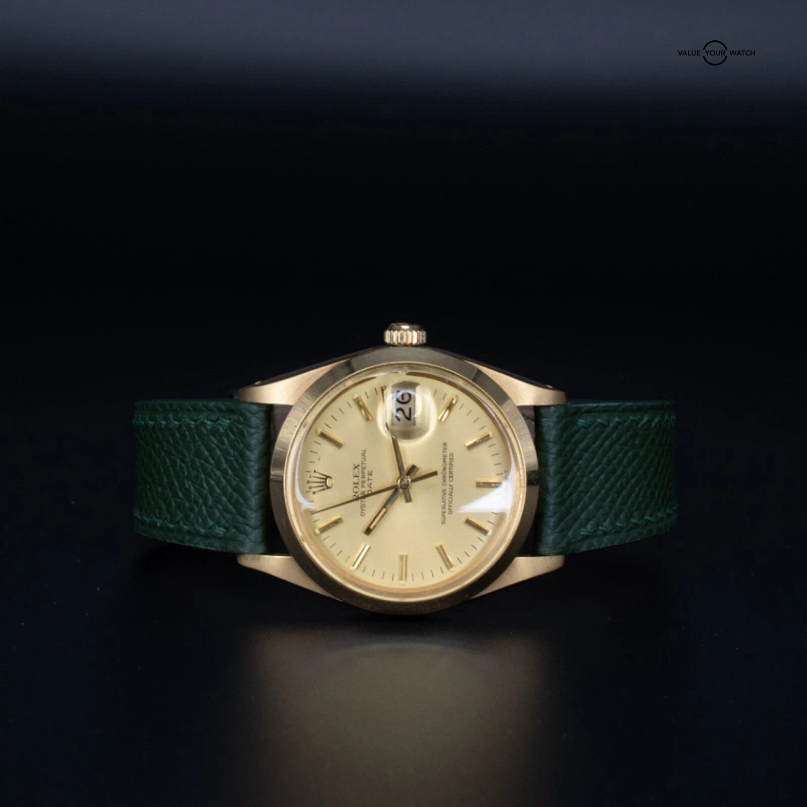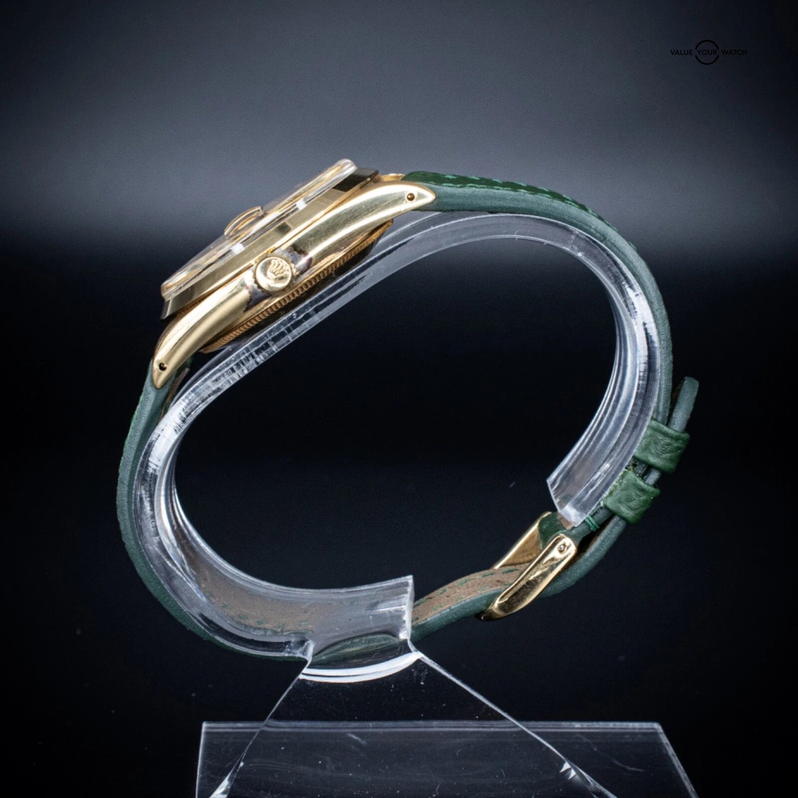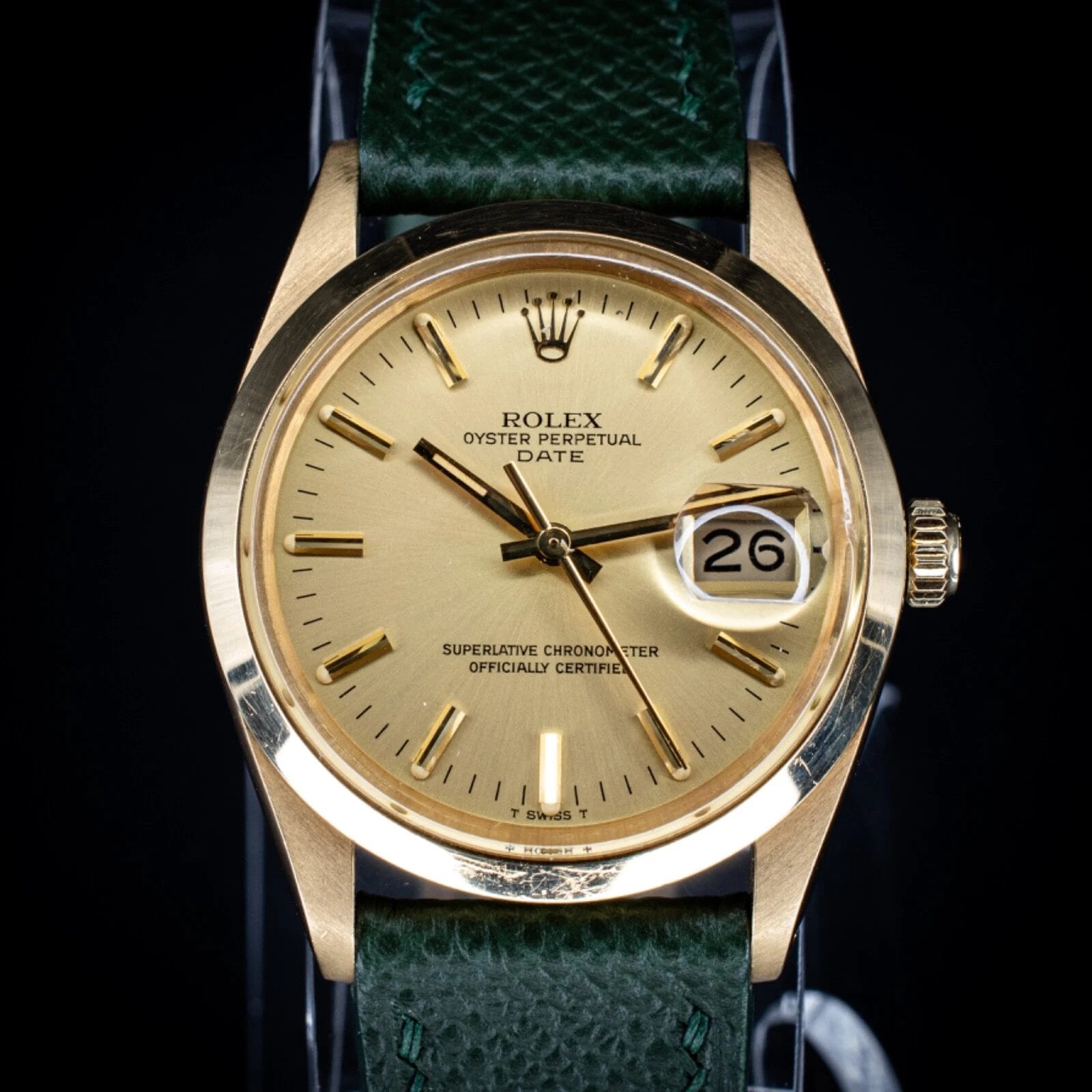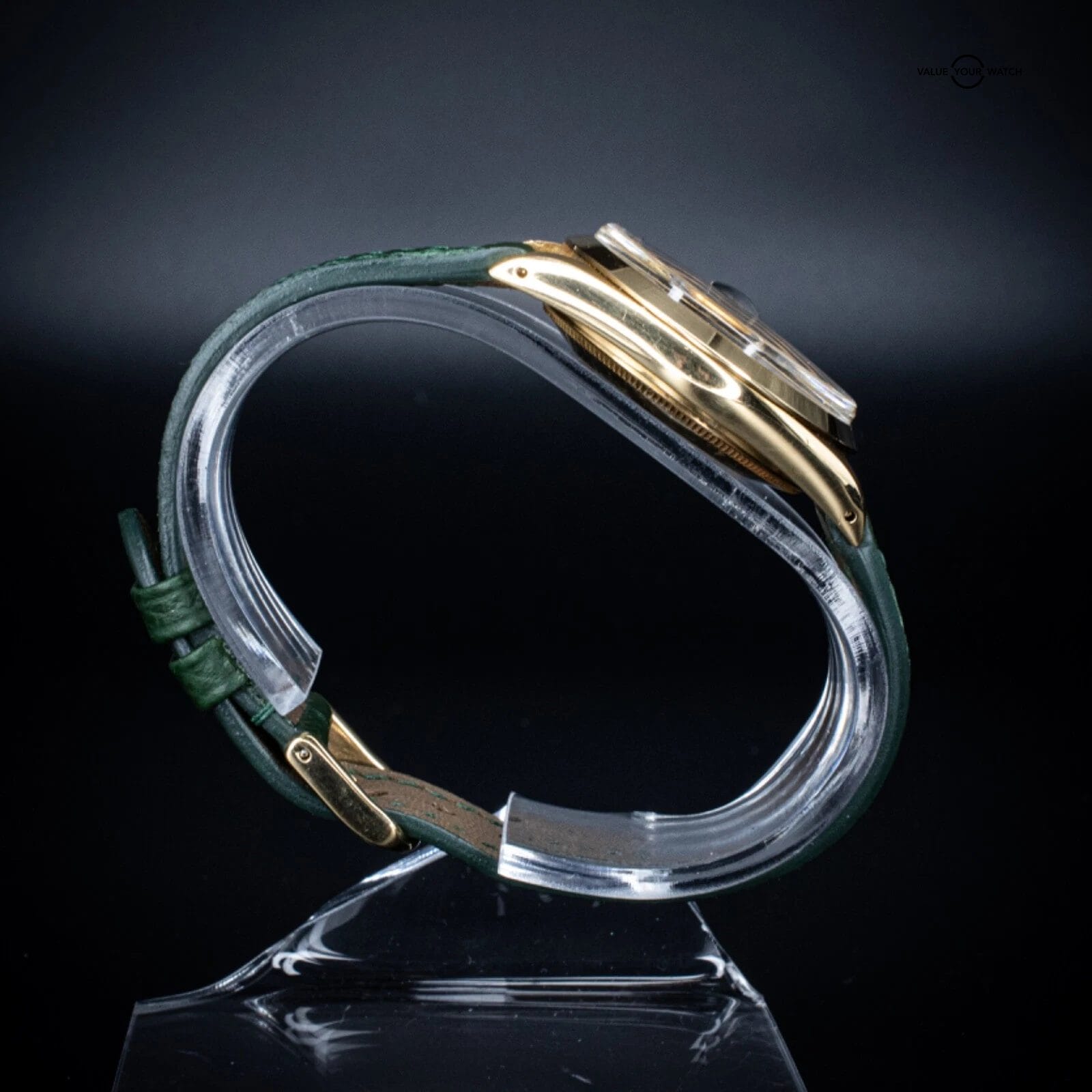 This pre-owned Rolex 15008 offers a seamless blend of understated elegance and classic design. Featuring a robust 34mm 18k yellow gold case and a stunning champagne dial with gold-tone indices, this timepiece exudes timeless sophistication. Powered by Rolex’s reliable automatic movement, it ensures precision and longevity. Complemented by an aftermarket green leather strap, this watch is perfect for both formal occasions and daily wear. Recently serviced and in very good condition, it is a standout choice for collectors and enthusiasts alike.