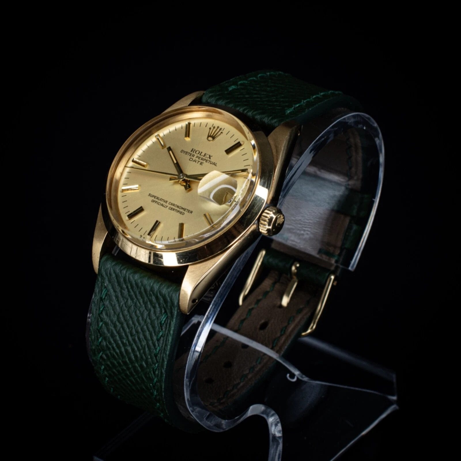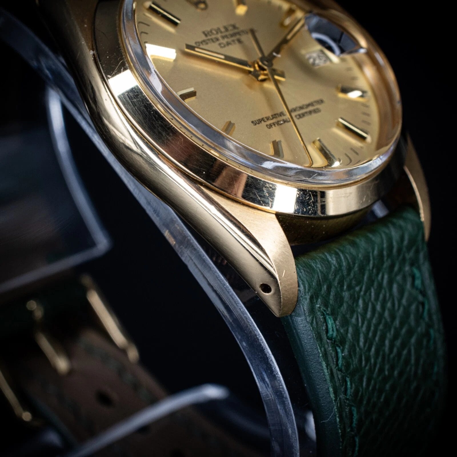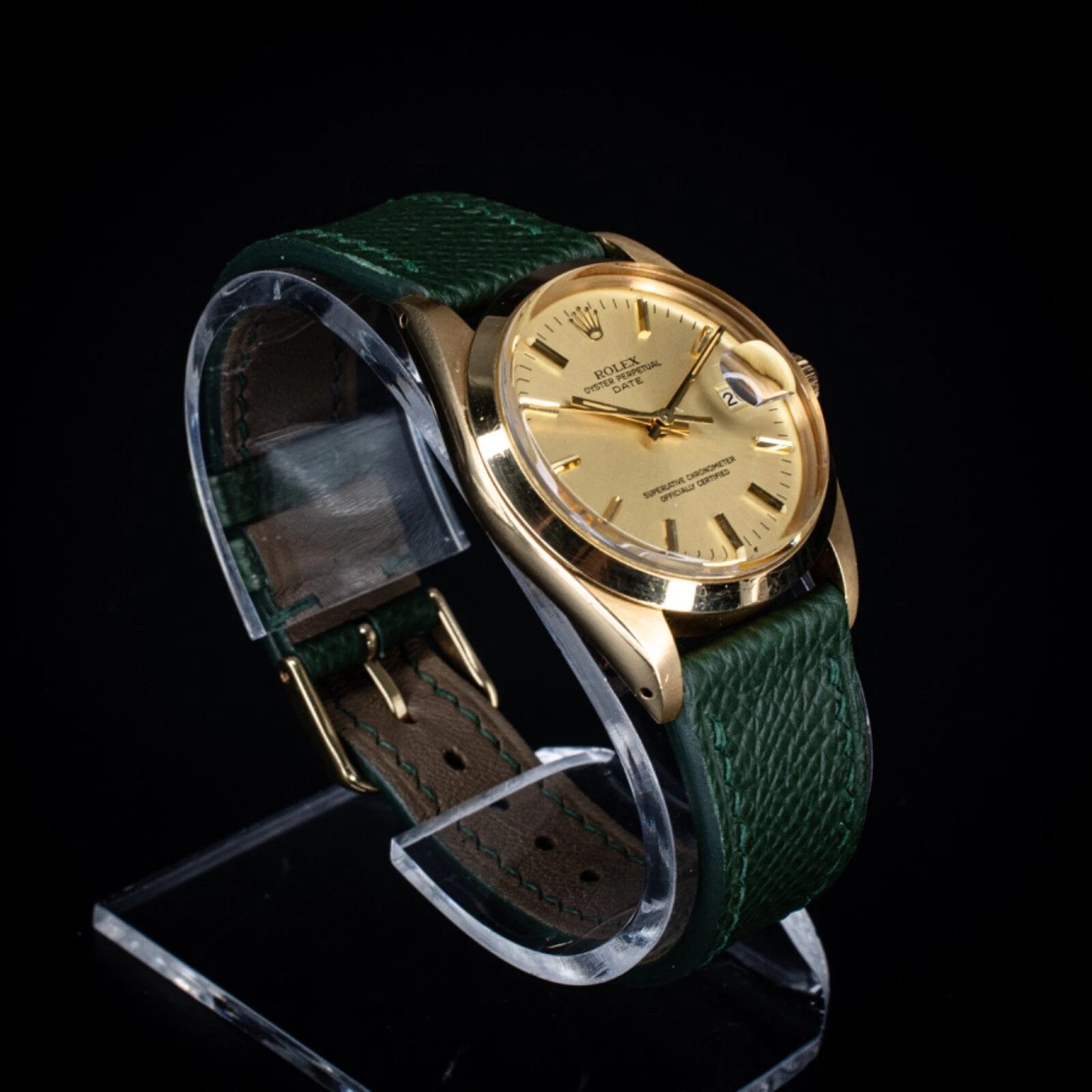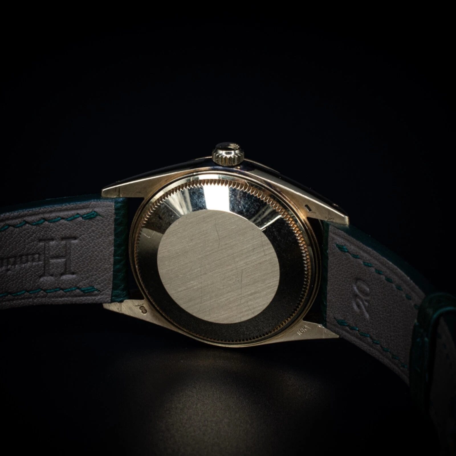 This pre-owned Rolex 15008 offers a seamless blend of understated elegance and classic design. Featuring a robust 34mm 18k yellow gold case and a stunning champagne dial with gold-tone indices, this timepiece exudes timeless sophistication. Powered by Rolex’s reliable automatic movement, it ensures precision and longevity. Complemented by an aftermarket green leather strap, this watch is perfect for both formal occasions and daily wear. Recently serviced and in very good condition, it is a standout choice for collectors and enthusiasts alike.