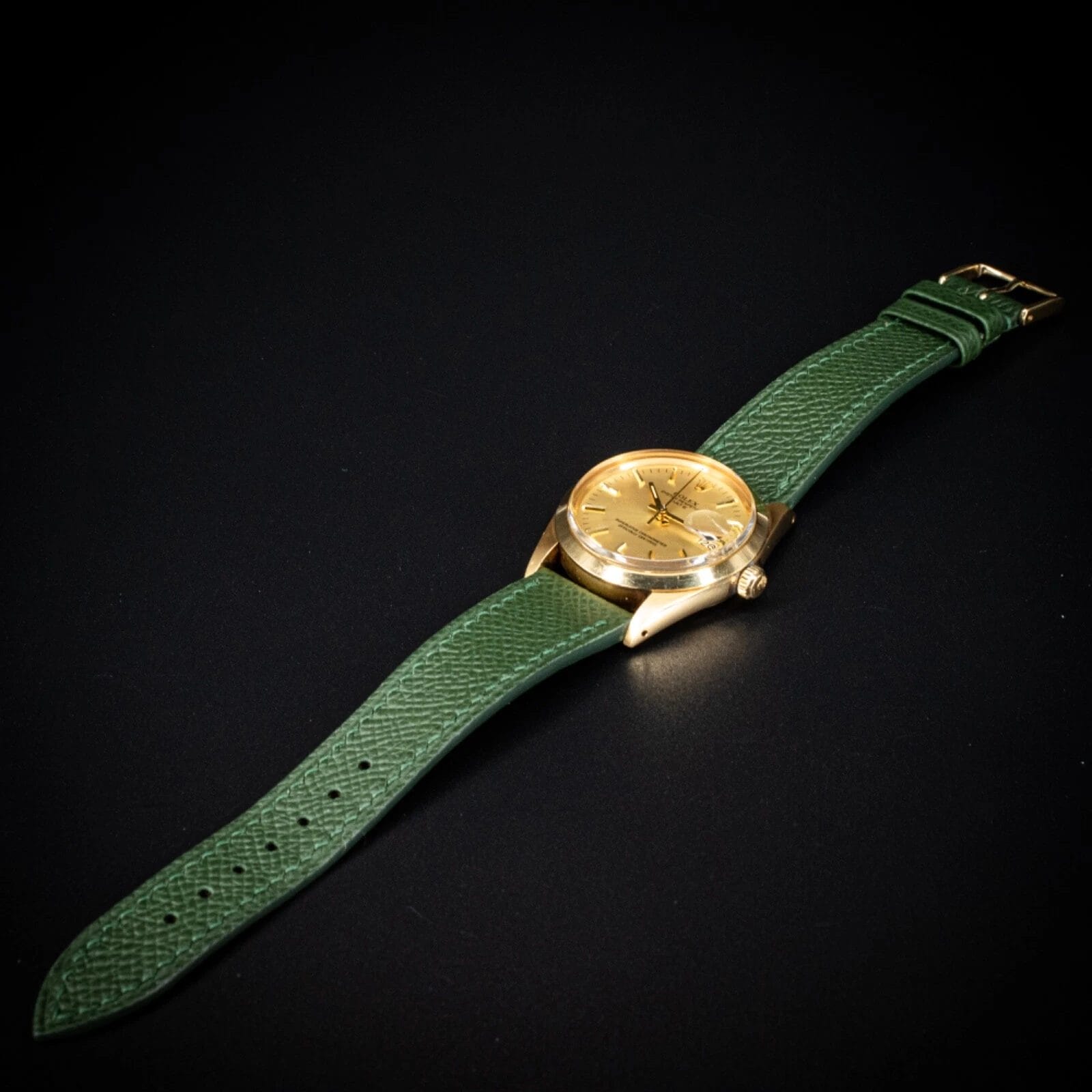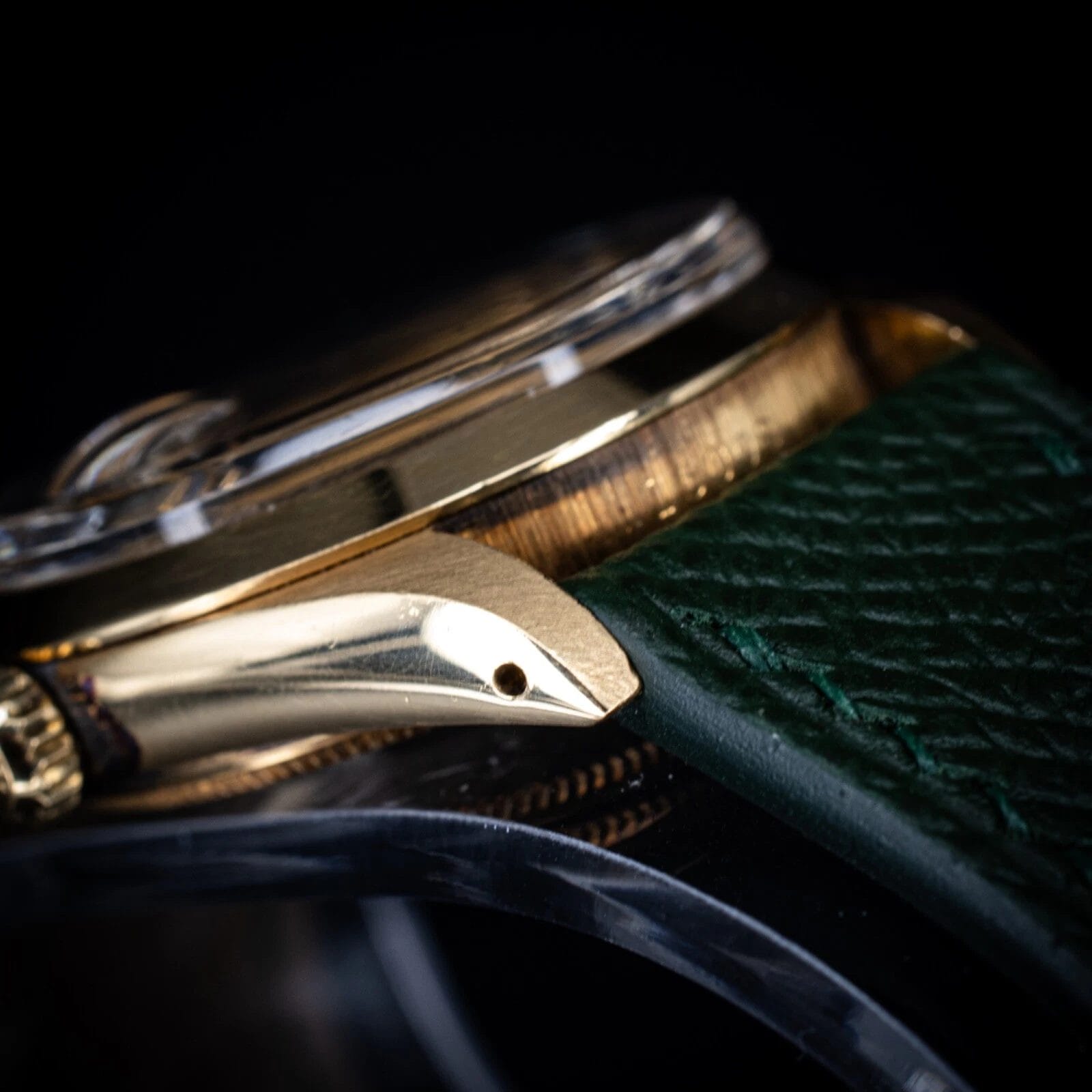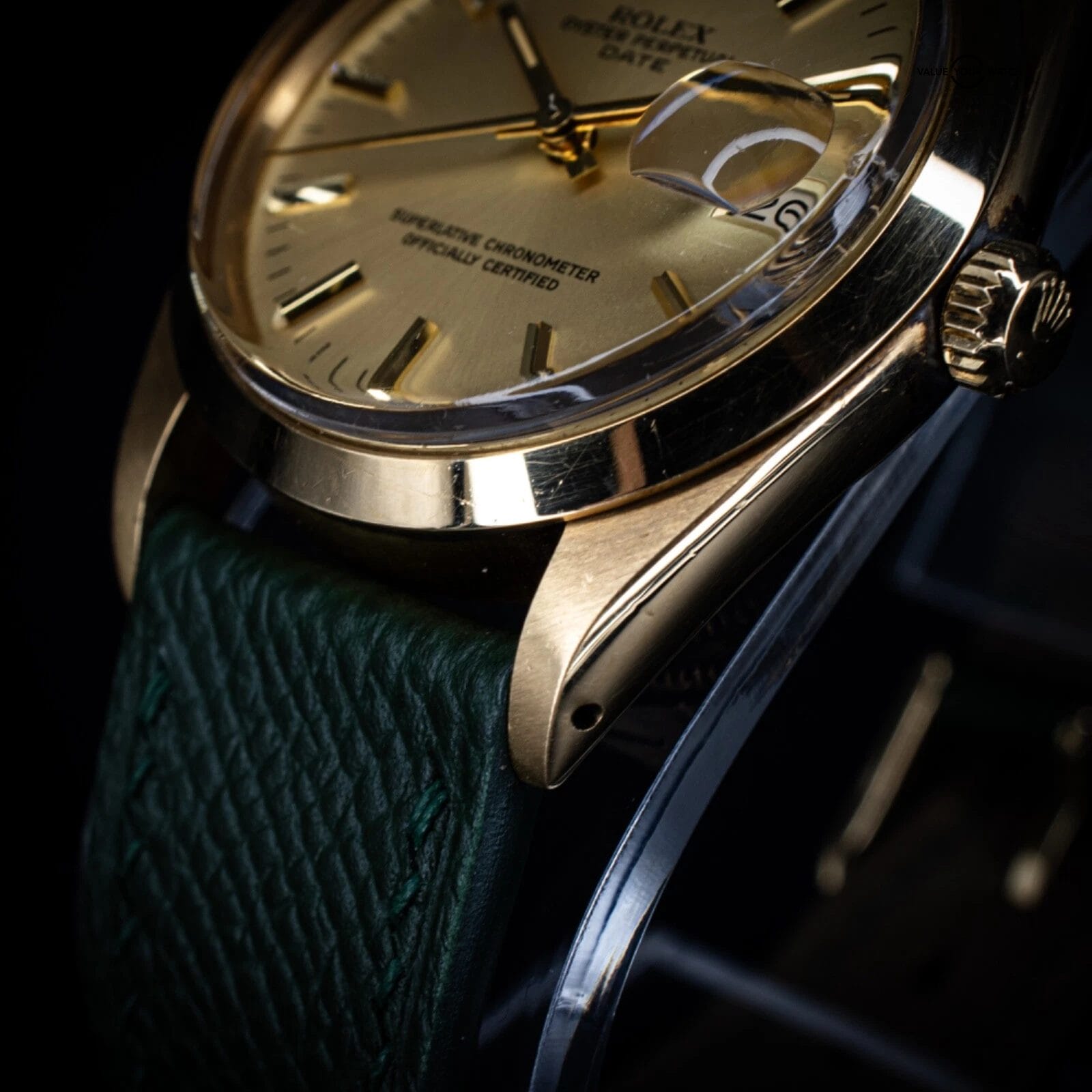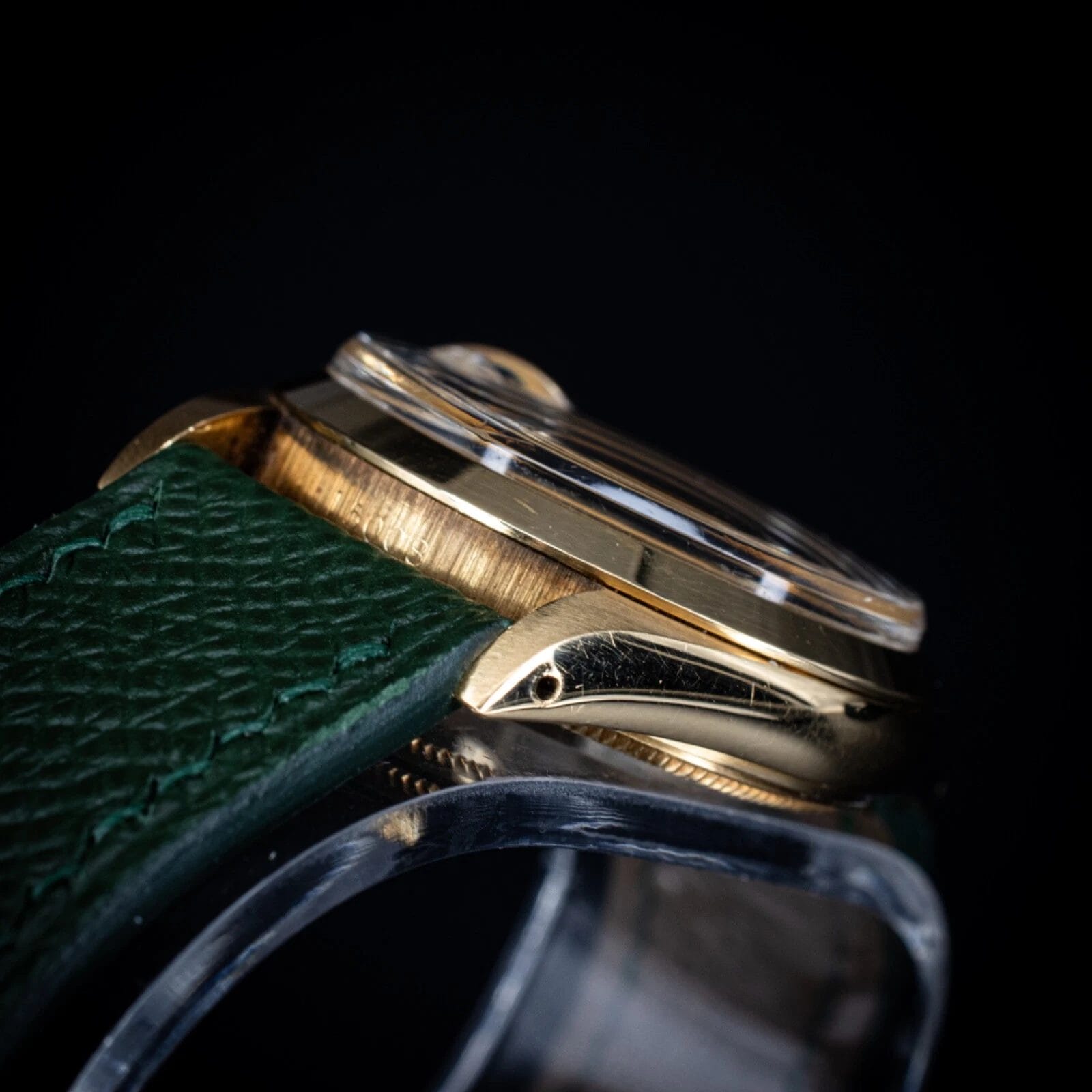 This pre-owned Rolex 15008 offers a seamless blend of understated elegance and classic design. Featuring a robust 34mm 18k yellow gold case and a stunning champagne dial with gold-tone indices, this timepiece exudes timeless sophistication. Powered by Rolex’s reliable automatic movement, it ensures precision and longevity. Complemented by an aftermarket green leather strap, this watch is perfect for both formal occasions and daily wear. Recently serviced and in very good condition, it is a standout choice for collectors and enthusiasts alike.
