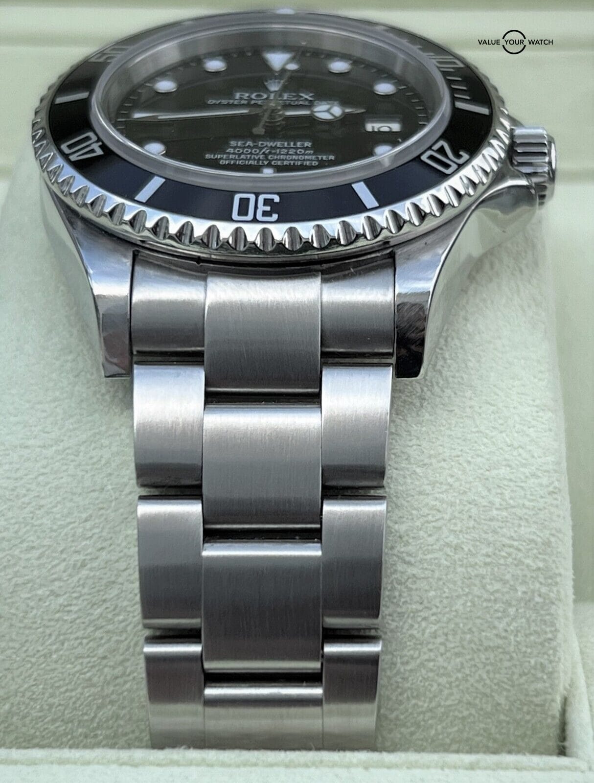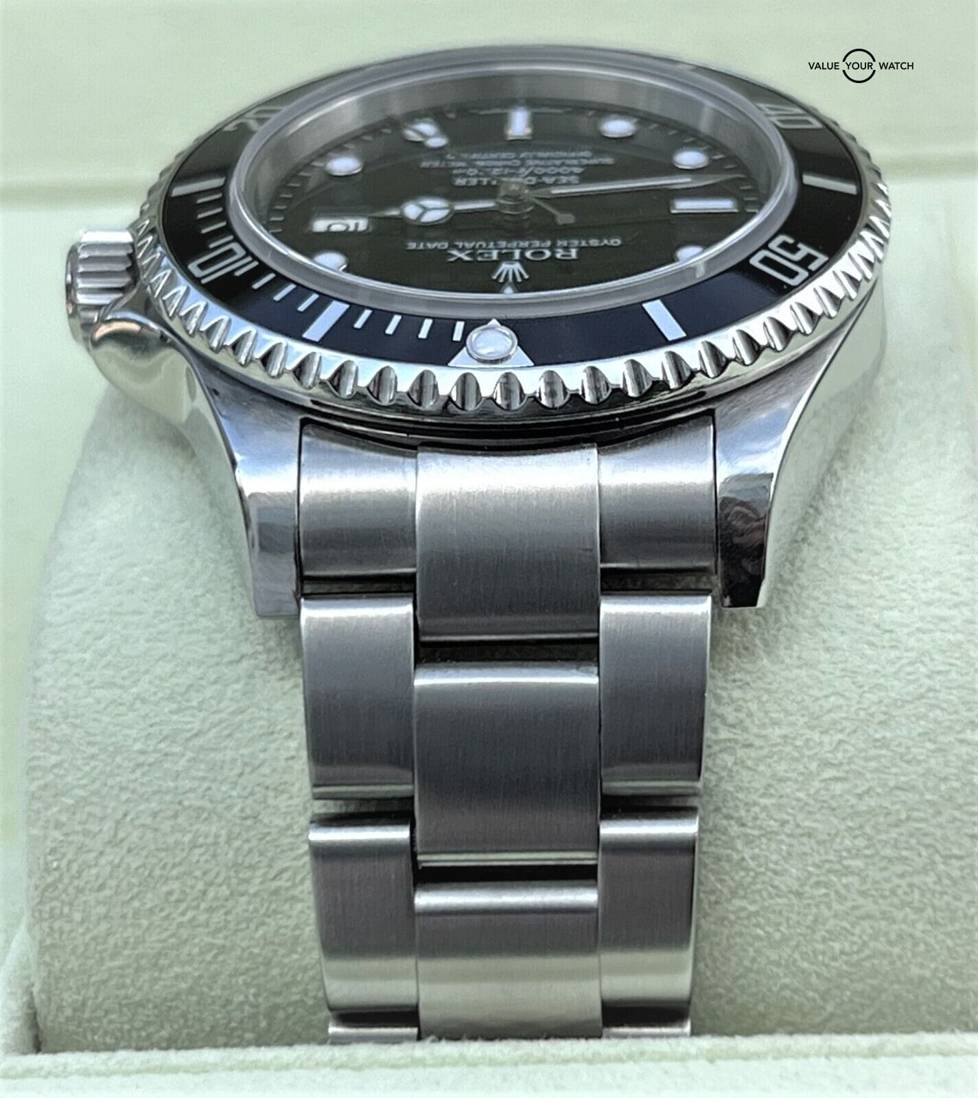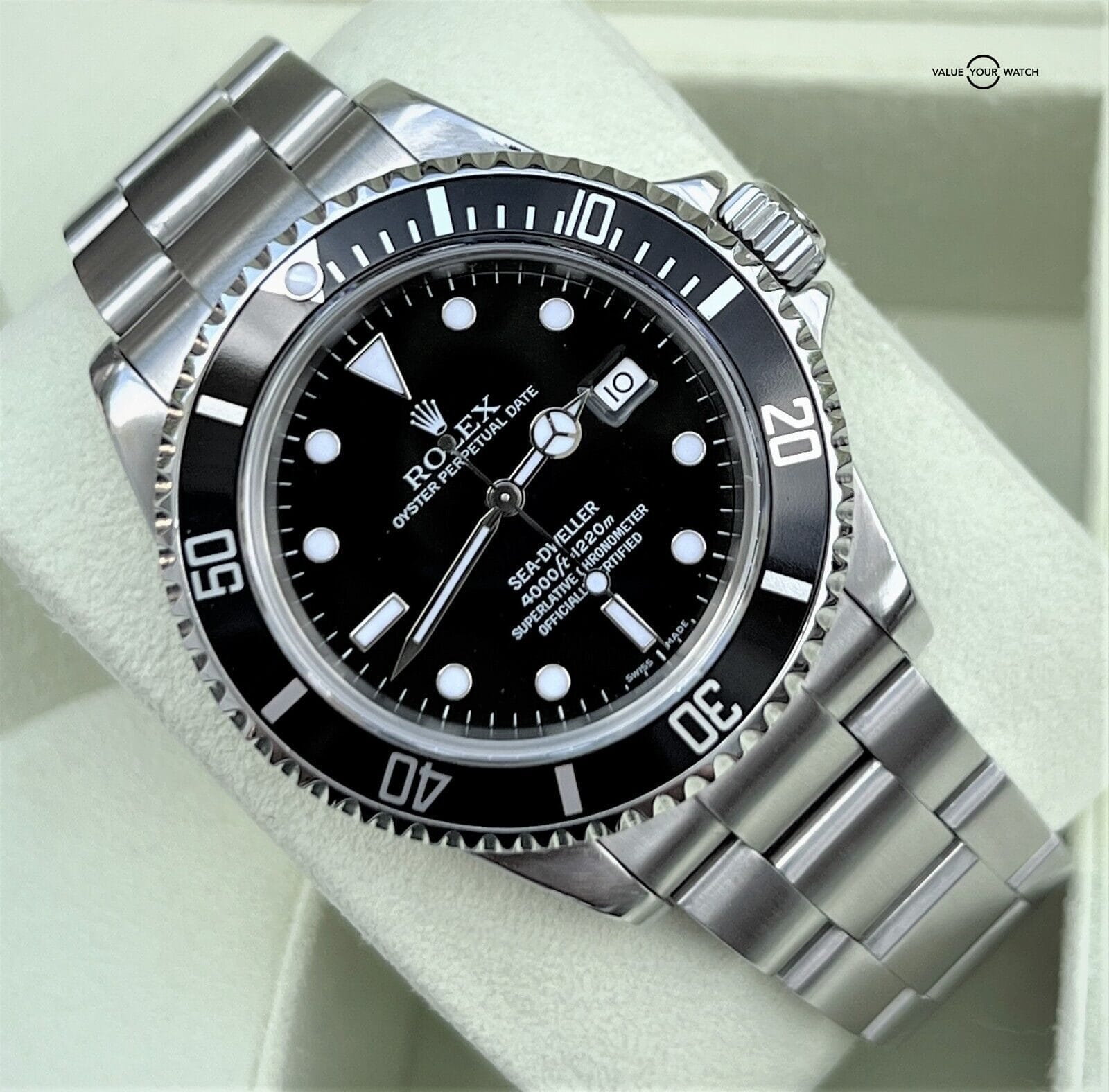 Rolex Sea-Dweller 16600 40mm Black Dial Stainless Steel BOXES,TAGS,BOOKLETS! This beautiful, timeless timepiece comes with an outer marble box, inner green box, instruction manuals, dive card, anchor, screwdriver tool, both hangtags, cloth, both diver extensions and BOBS watches warranty card. The timepiece is in nice pre-owned condition with just minor cosmetic wear throughout. The nice no holes case is still very fat with sharp lugs. The sapphire crystal is clean with no nicks or scratches. The bracelet will accommodate just under an 8” wrist. Everything Is functioning as it should. Serial numbers and names are blurred in photos only for privacy reasons. I am happy to answer all questions about the watch. Just reach out to me via messages. I have many references in the watch world and am happy to provide as many as needed. Feel free to search my username “thegolferguy” in the Rolex Forums under the “Who’s Who” section and see ample feedback.