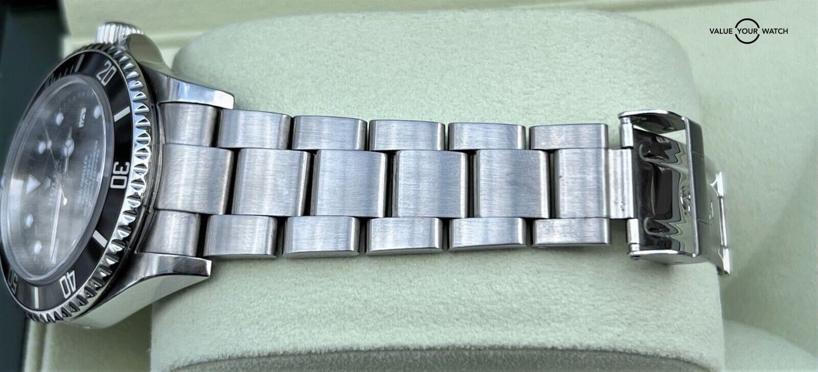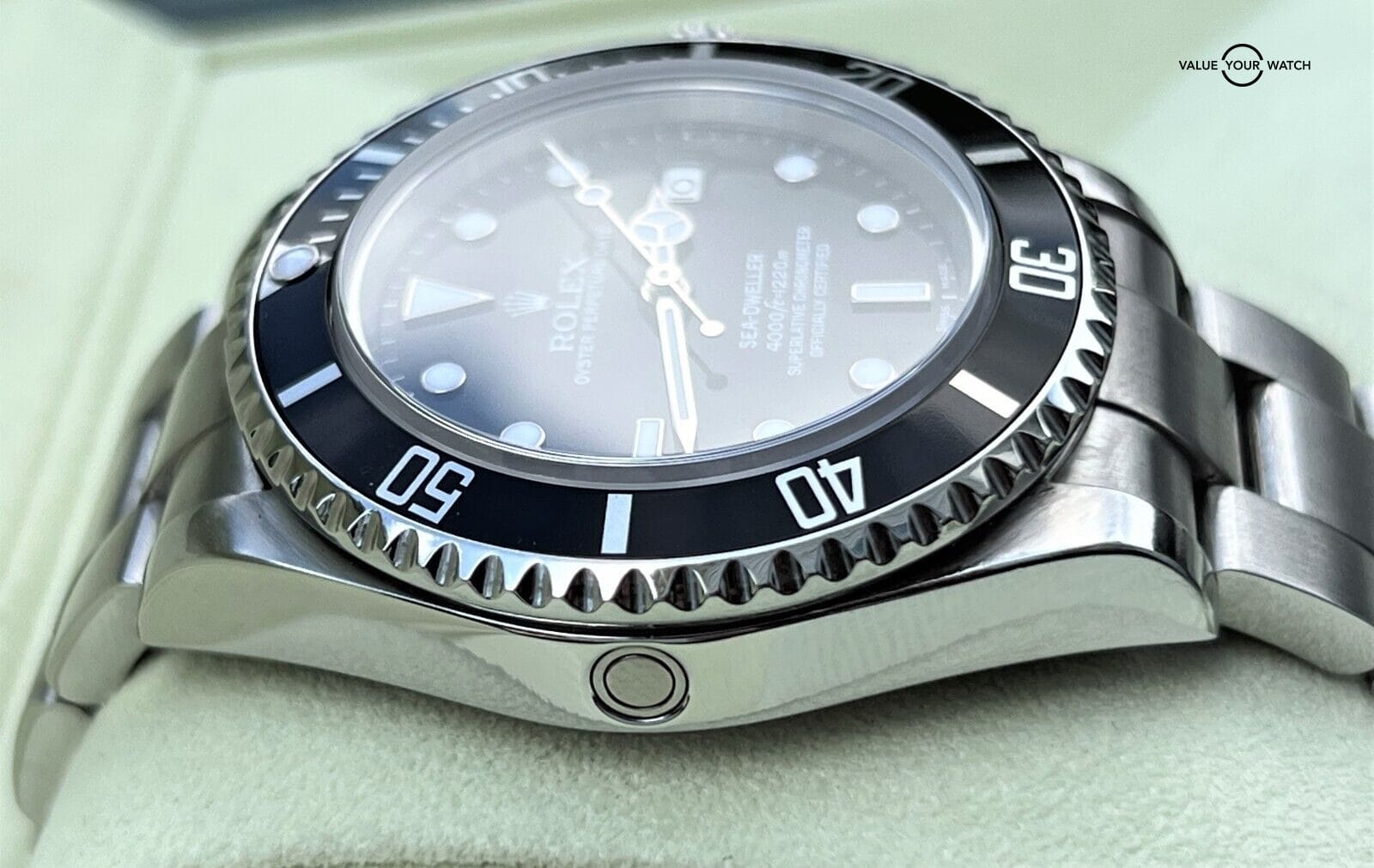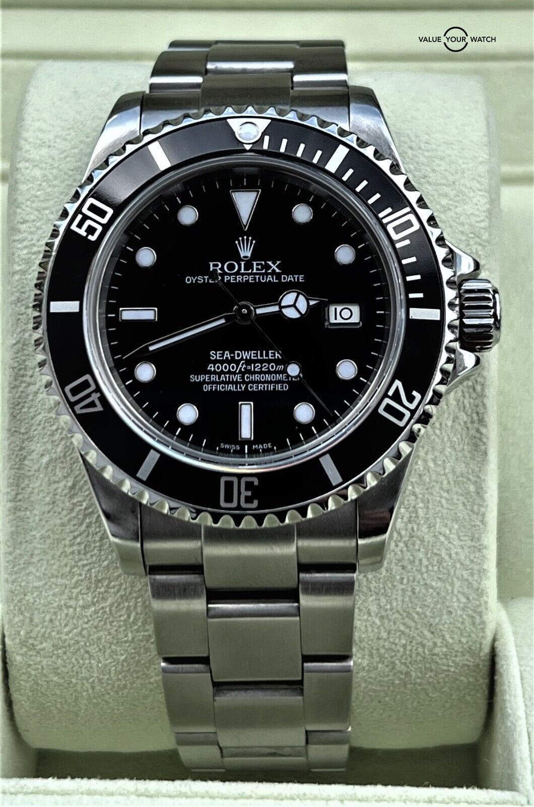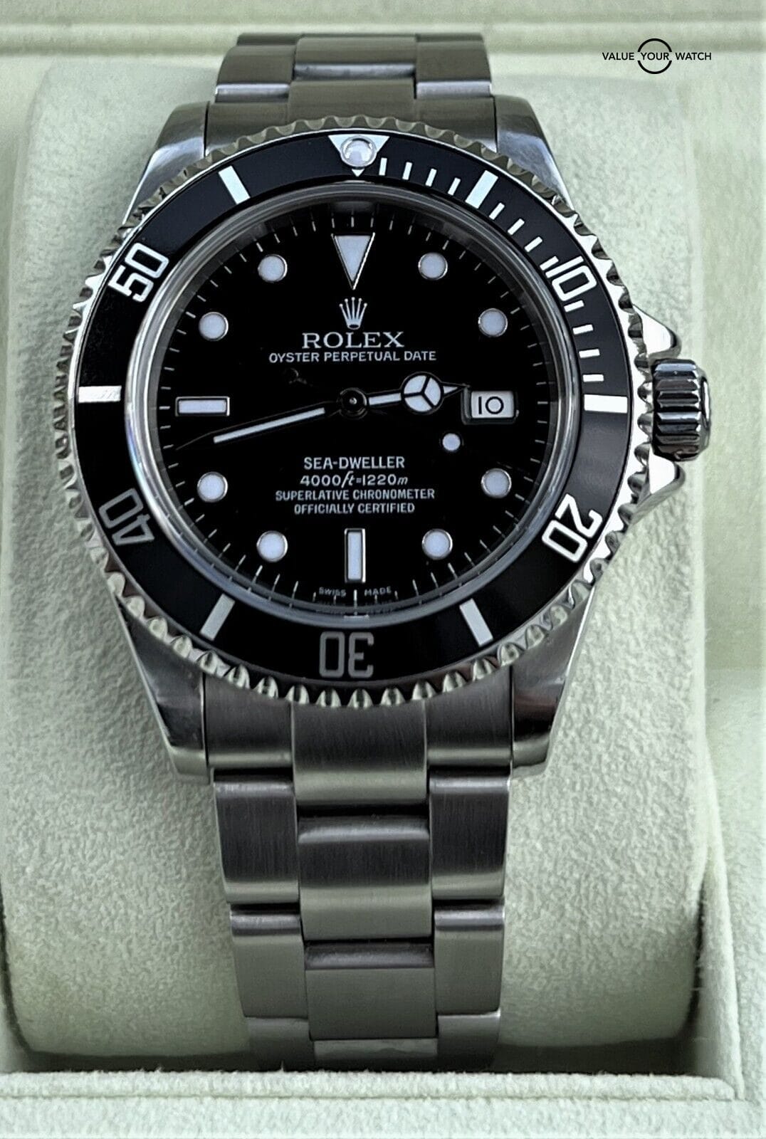Rolex Sea-Dweller 16600 40mm Black Dial Stainless Steel BOXES,TAGS,BOOKLETS! This beautiful, timeless timepiece comes with an outer marble box, inner green box, instruction manuals, dive card, anchor, screwdriver tool, both hangtags, cloth, both diver extensions and BOBS watches warranty card. The timepiece is in nice pre-owned condition with just minor cosmetic wear throughout. The nice no holes case is still very fat with sharp lugs. The sapphire crystal is clean with no nicks or scratches. The bracelet will accommodate just under an 8” wrist. Everything Is functioning as it should. Serial numbers and names are blurred in photos only for privacy reasons. I am happy to answer all questions about the watch. Just reach out to me via messages. I have many references in the watch world and am happy to provide as many as needed. Feel free to search my username “thegolferguy” in the Rolex Forums under the “Who’s Who” section and see ample feedback.