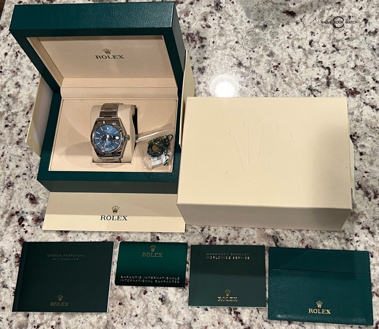Rolex Sky-Dweller 326934 Blue Dial Stainless Steel 42mm Boxes/Papers/2021! This beautiful timepiece comes complete with the outer cream box, inner green box, both hangtags, all links, and original warranty card (Dated February 2021). The Watch is in excellent pre-owned condition. The bracelet is nice and will accommodate just over a 7.75” wrist. Mechanically the watch is functioning as it should. Serial numbers & names are blurred in photos only for privacy reasons. I am happy to answer all questions about the watch. Just reach out to me via messages. I have many references in the watch world and am happy to provide as many as needed. Feel free to search my username “thegolferguy” in the Rolex Forums under the “Who’s Who” section and see ample feedback.