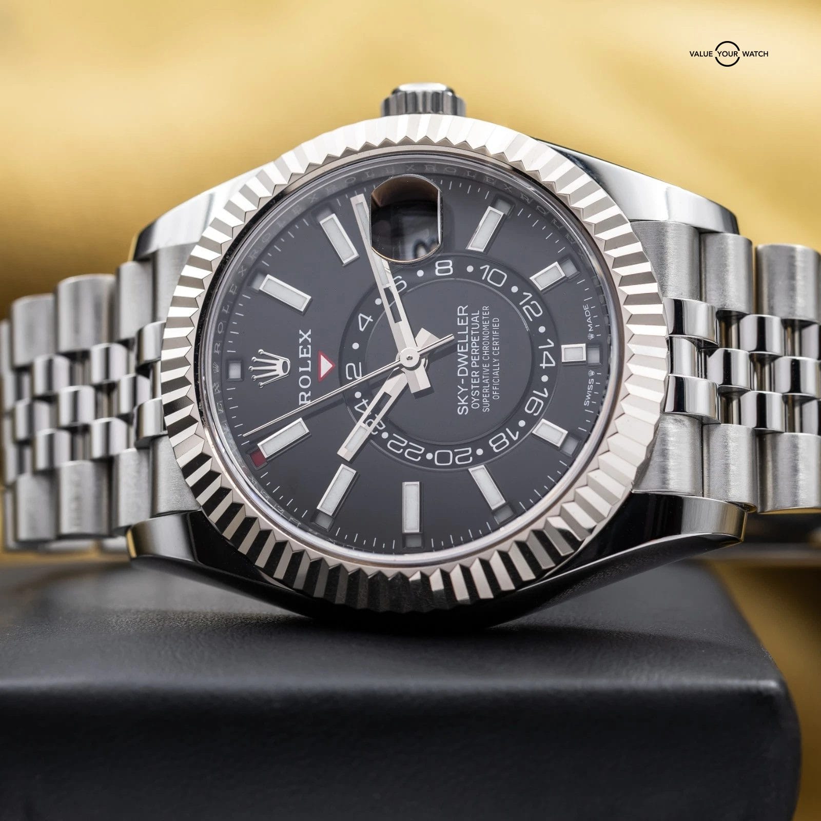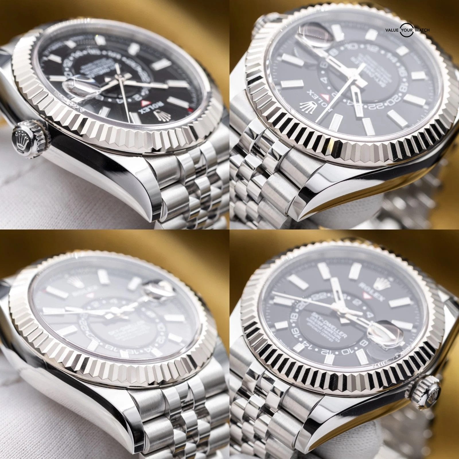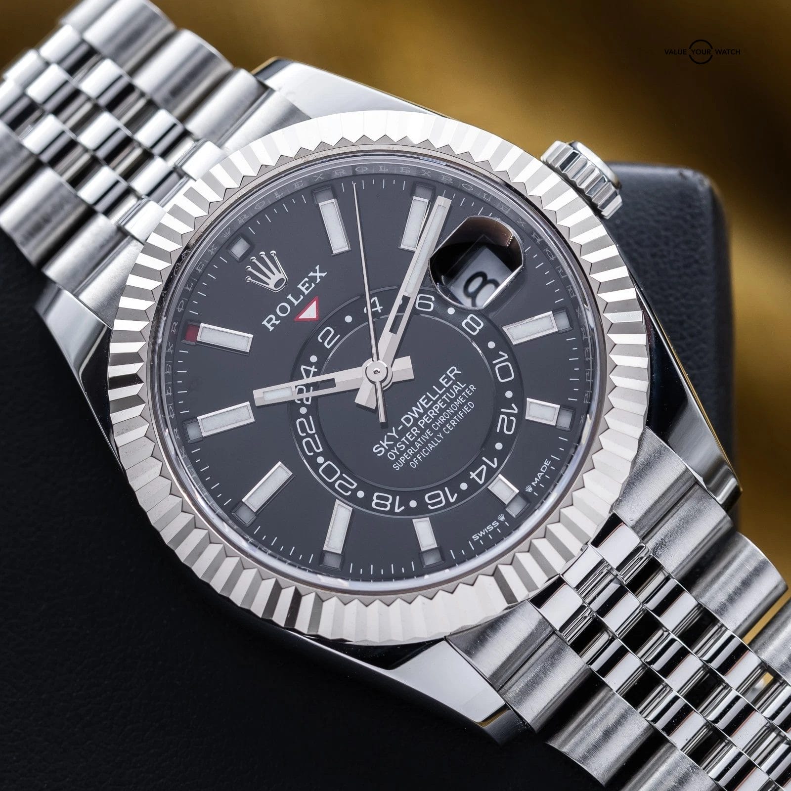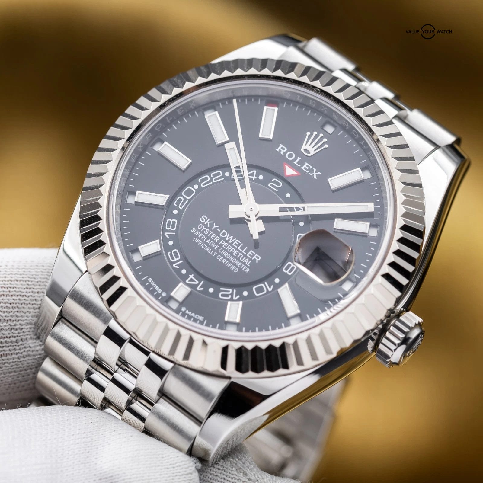 This Sky-Dweller in stainless steel with the white gold fluted bezel and black dial is Rolex’s idea of a first-class travel companion. At 42mm, it’s bold without being over the top, and that crisp white gold bezel catches the light beautifully. The dial houses the impressive layout – dual time zones displayed with an off-center 24-hour ring, plus an annual calendar that automatically adjusts for months with 30 or 31 days. All of it is run by Rolex’s in-house calibre 9001, one of their most complex and capable movements. It’s sporty enough to wear with a polo, but polished enough to sit under a suit cuff – making it a true “go anywhere, do anything” piece.