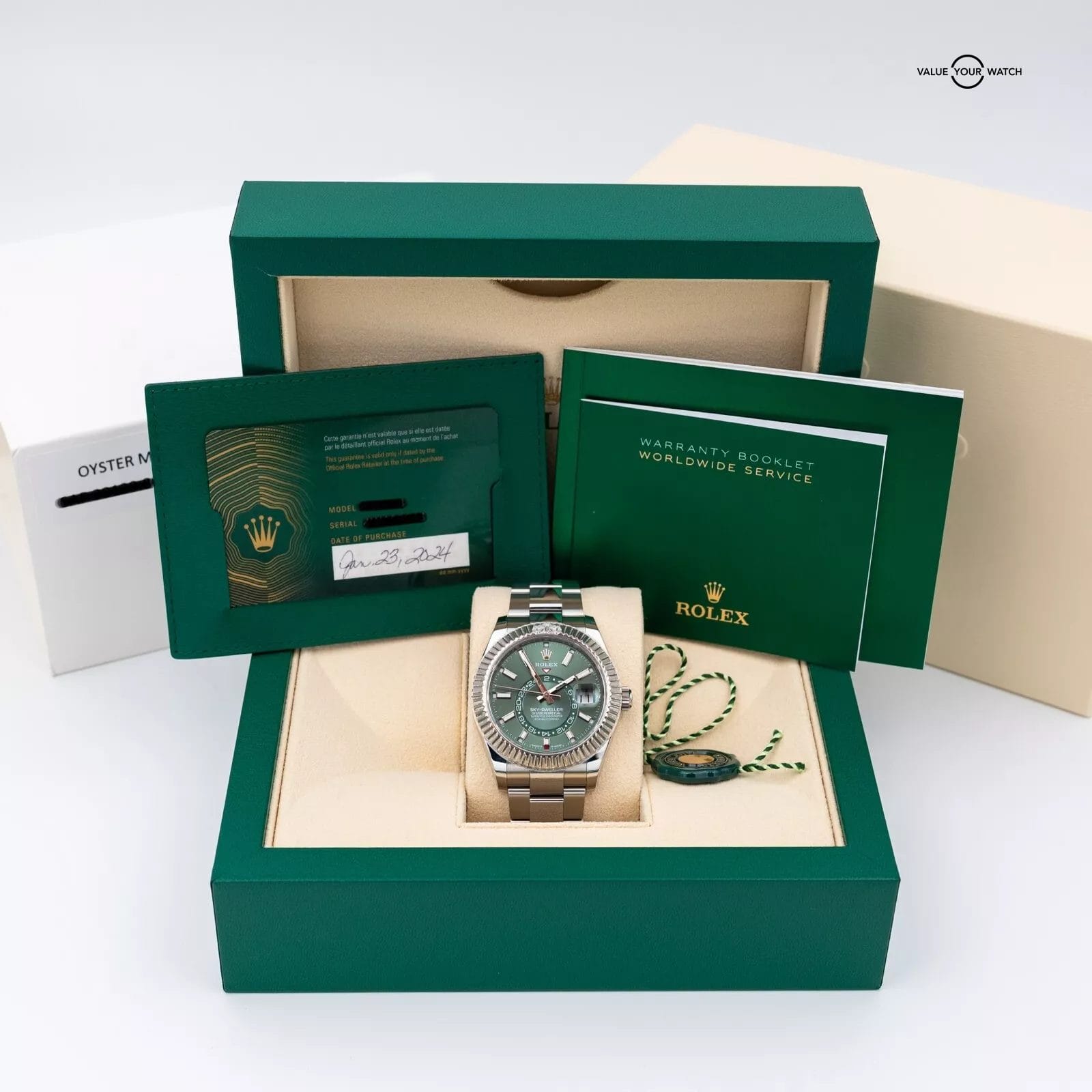 The watch is in mint condition with factory stickers and includes both boxes, green tag, booklets, card holder, and warranty card (papers).