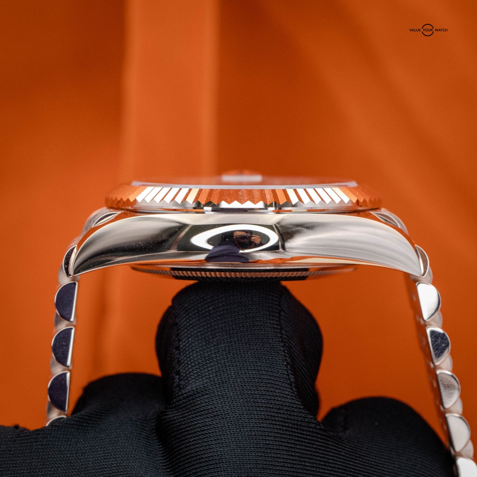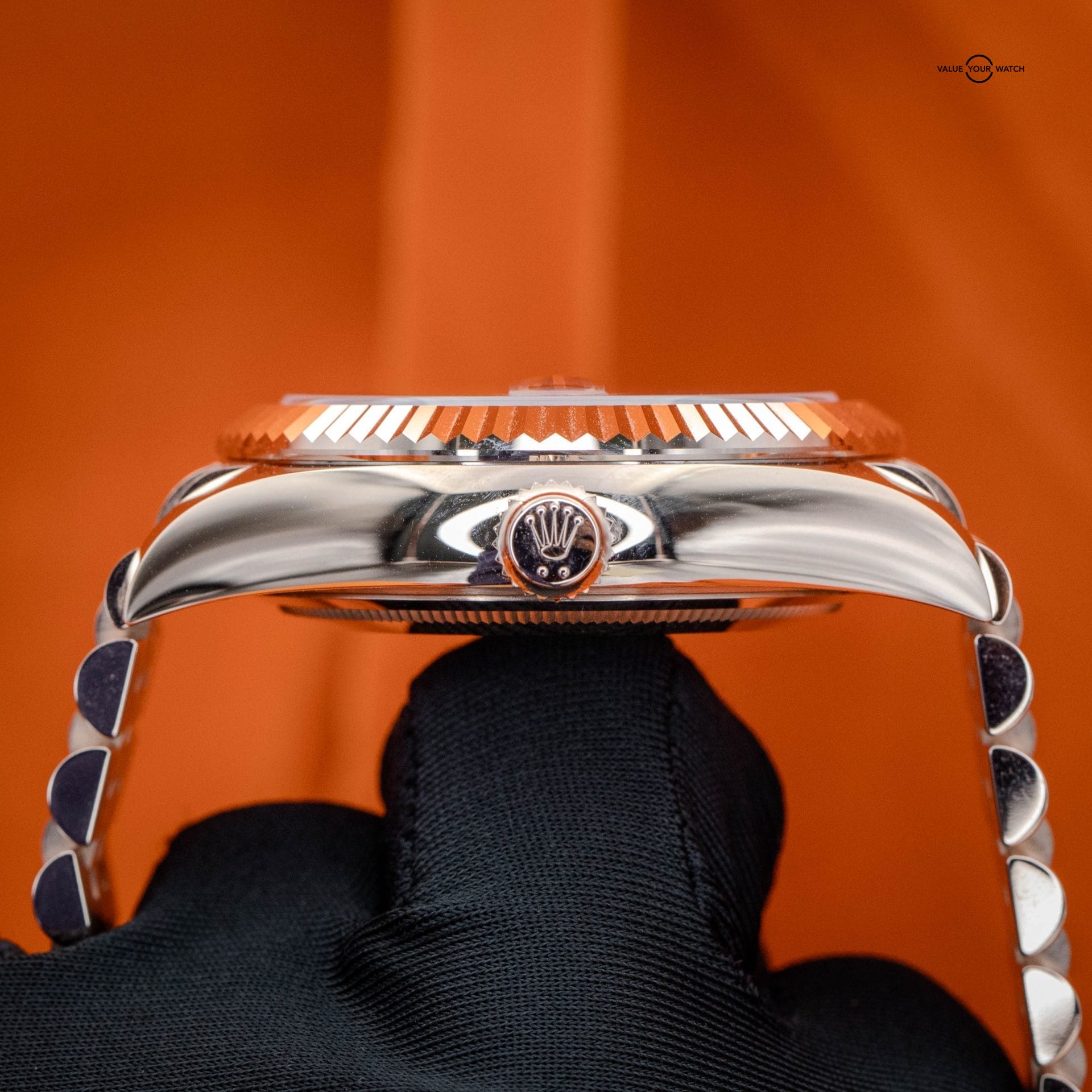 This highly desirable model showcases a stunning 18k Everose gold case and bracelet paired with the signature fluted bezel and dual time zone functionality, making it one of Rolex’s most elegant yet complex modern watches. Don’t miss your chance to own one of the most luxurious Sky-Dwellers available today.