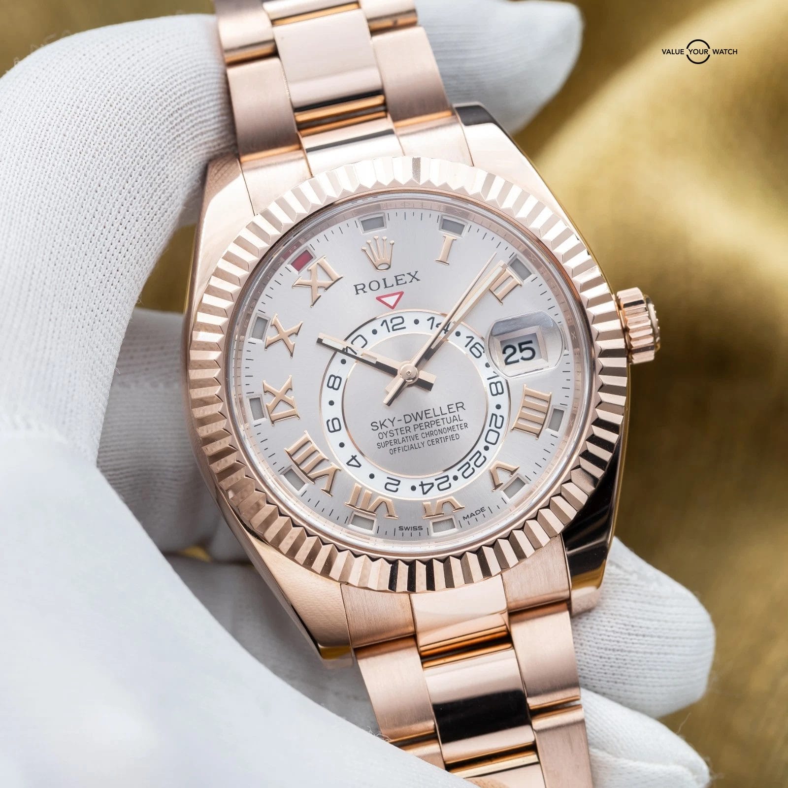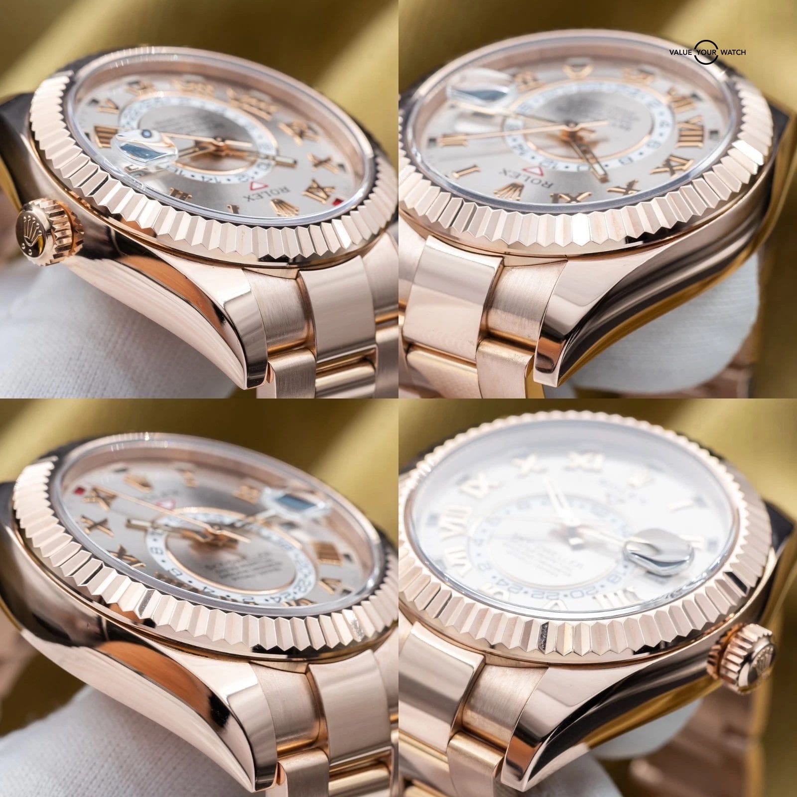The Rolex Sky-Dweller Sundust dial is where serious functionality meets full-blown luxury. Made from Rolex’s signature Everose gold, this 42 mm travel-ready masterpiece packs brains and beauty in equal measure. The star of the show is that stunning Sundust dial—a soft, elegant pink-champagne tone that shifts in the light and gives the watch a refined yet standout personality. Beneath the surface, you’ve got the powerhouse Caliber 9001 running the show, delivering dual time zones and an annual calendar with effortless precision. This is a watch that’s as practical for the jet-set life as it is jaw-dropping at dinner. Make it yours today!