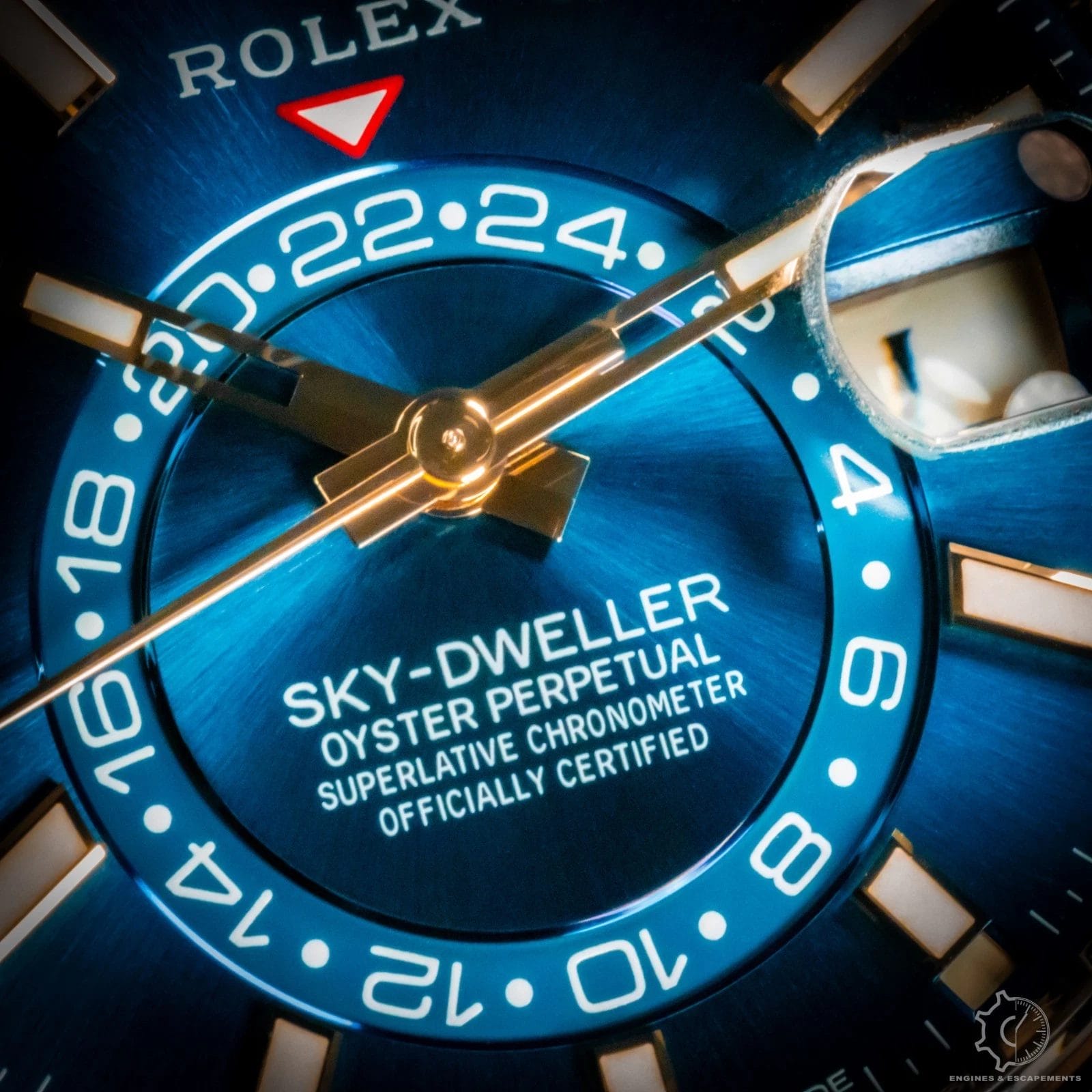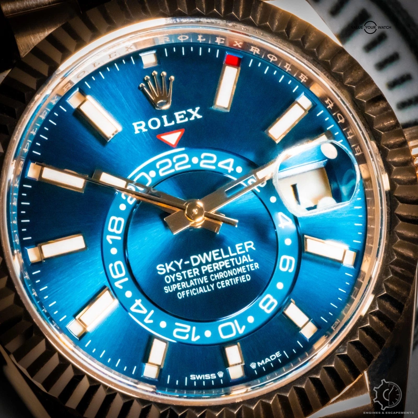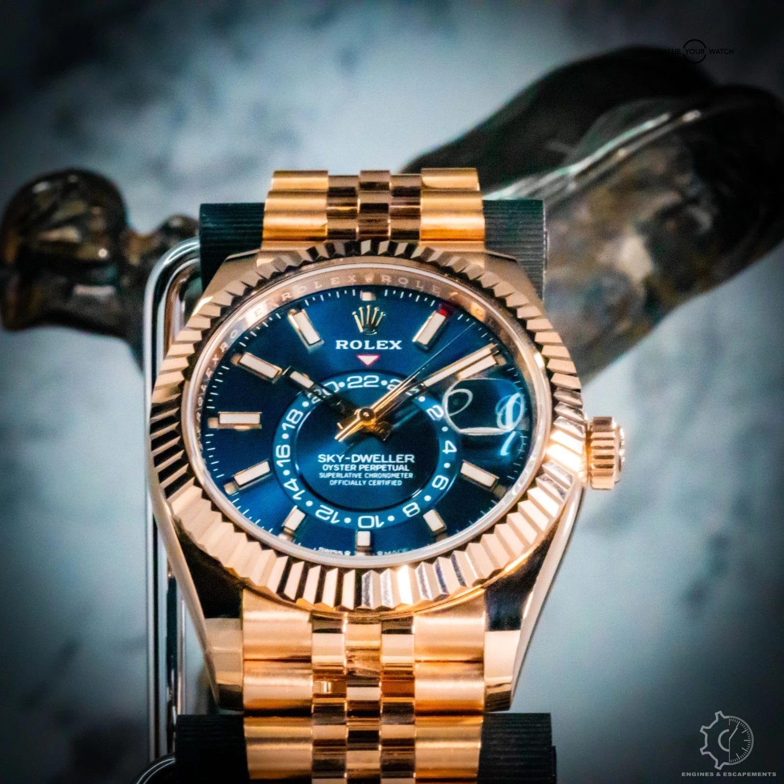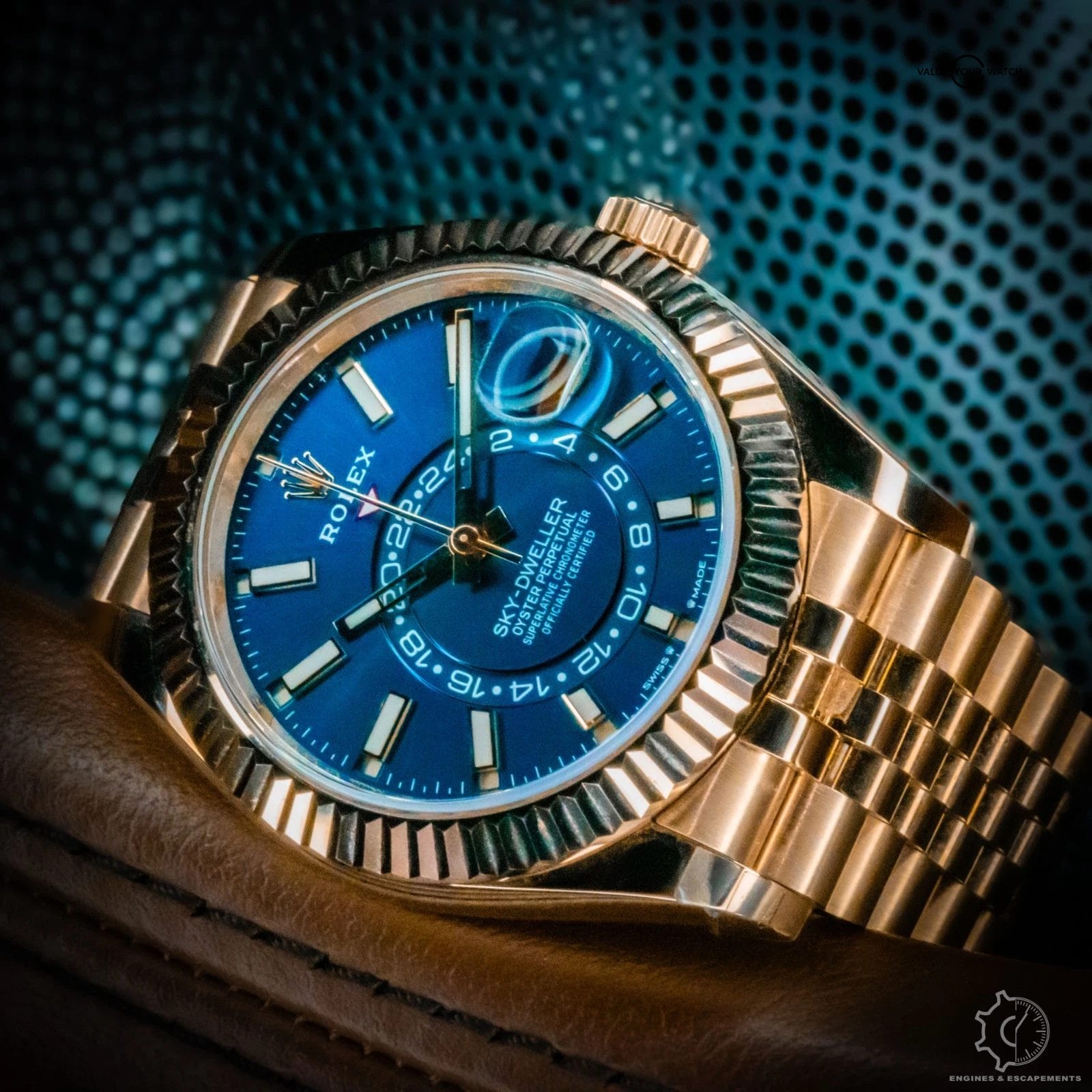 The Rolex Sky-Dweller 336935 with blue dial represents the pinnacle of modern luxury and technical innovation. Crafted entirely from 18k Everose gold, its 42mm case and fluted bezel radiate warmth and sophistication, while the vibrant sunburst blue dial adds depth and allure with every shift of light. Paired with a stunning full gold jubilee bracelet perfectly balances refinement with bold presence.