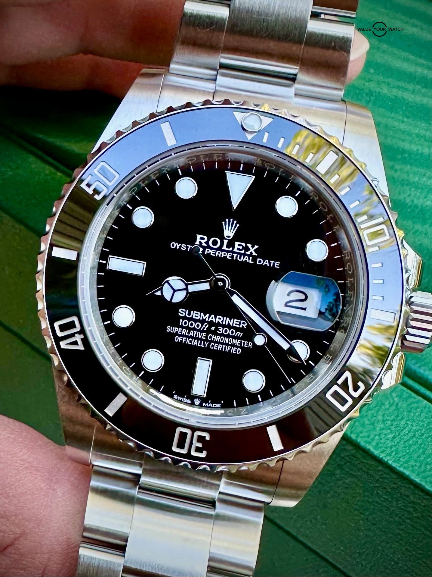 This watch is a 2022 model with the card dated April 29, 2022 and comes with a Rolex box, booklets, green tag AND WHITE TAG, all links, and warranty Card.