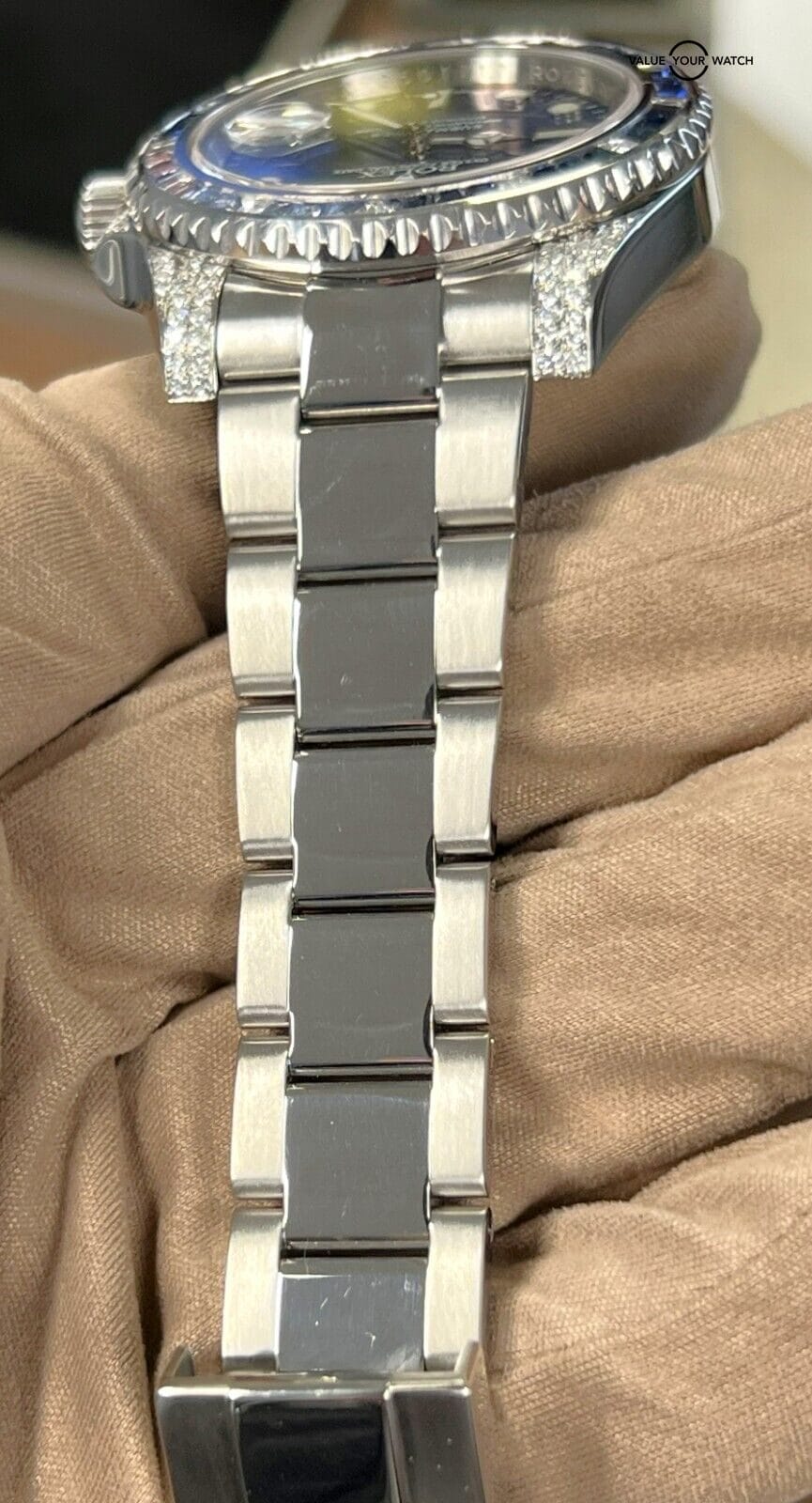 The customization with diamonds and sapphires adds significant value and uniqueness to the watch. These gemstones are typically set on the bezel and sometimes on the dial and bracelet, enhancing the watch’s visual appeal. It’s important to note that customization, especially when not done by Rolex, can affect the watch’s collectibility and warranty.