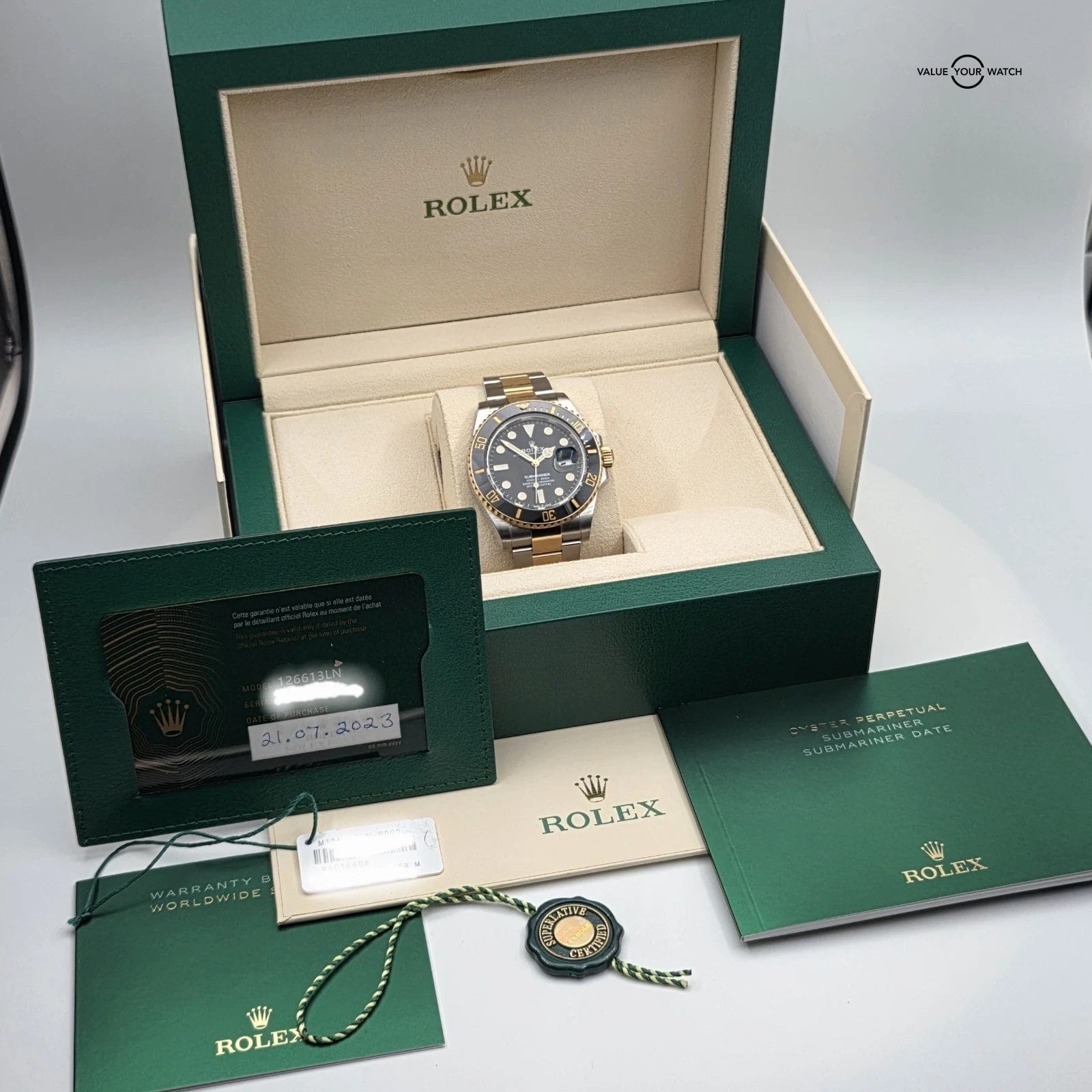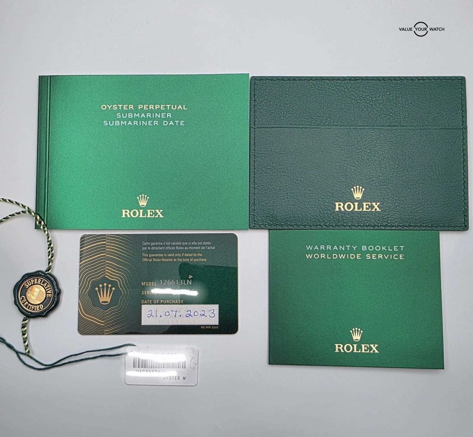 -Complete set, includes Double Box, Warranty Card dated 2023, warranty booklet, instruction booklet, Rolex hang tag, white serial hang tag, full bracket links,