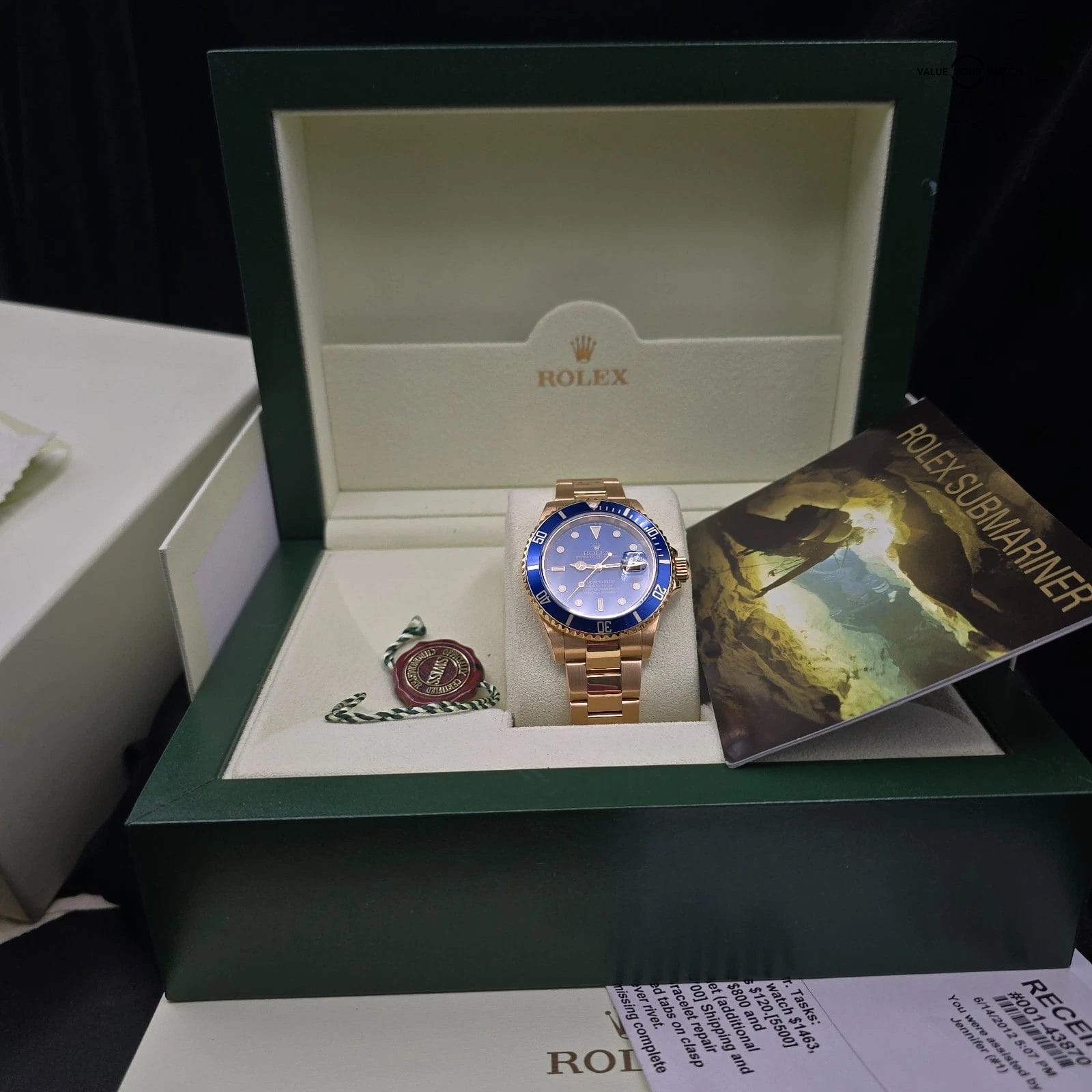 Comes with the original box, sub booklet, red tag, and service papers from a bezel replacement in 2012.