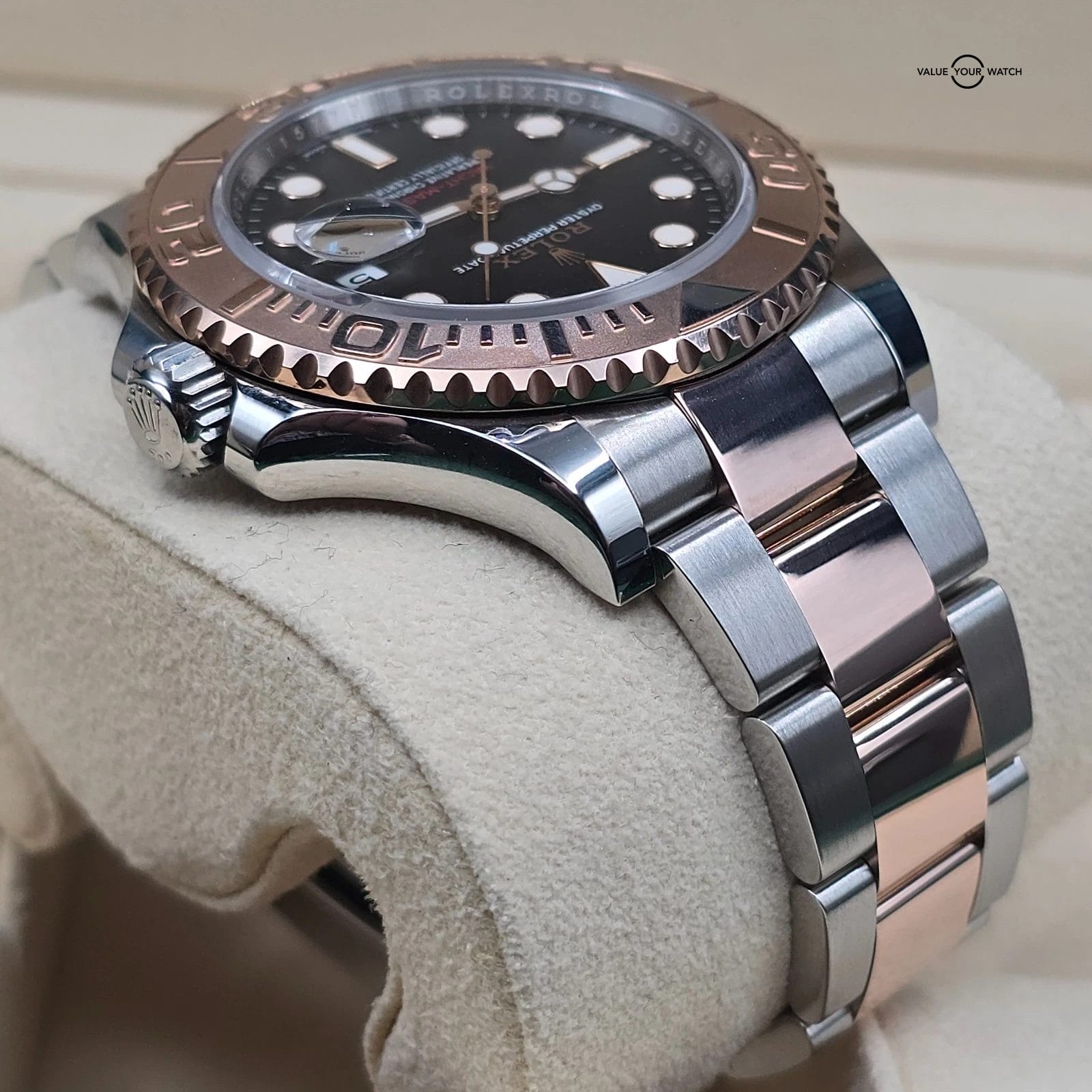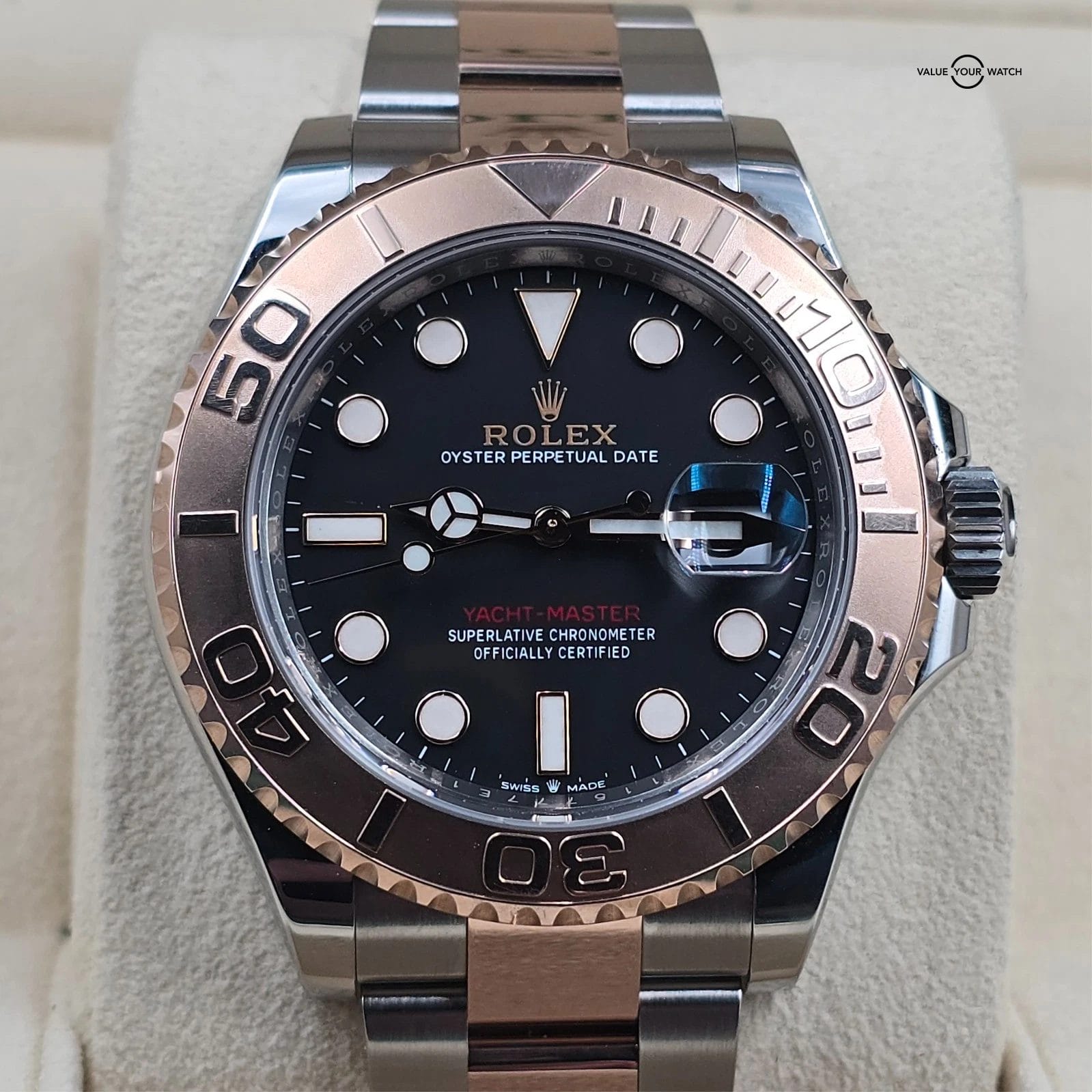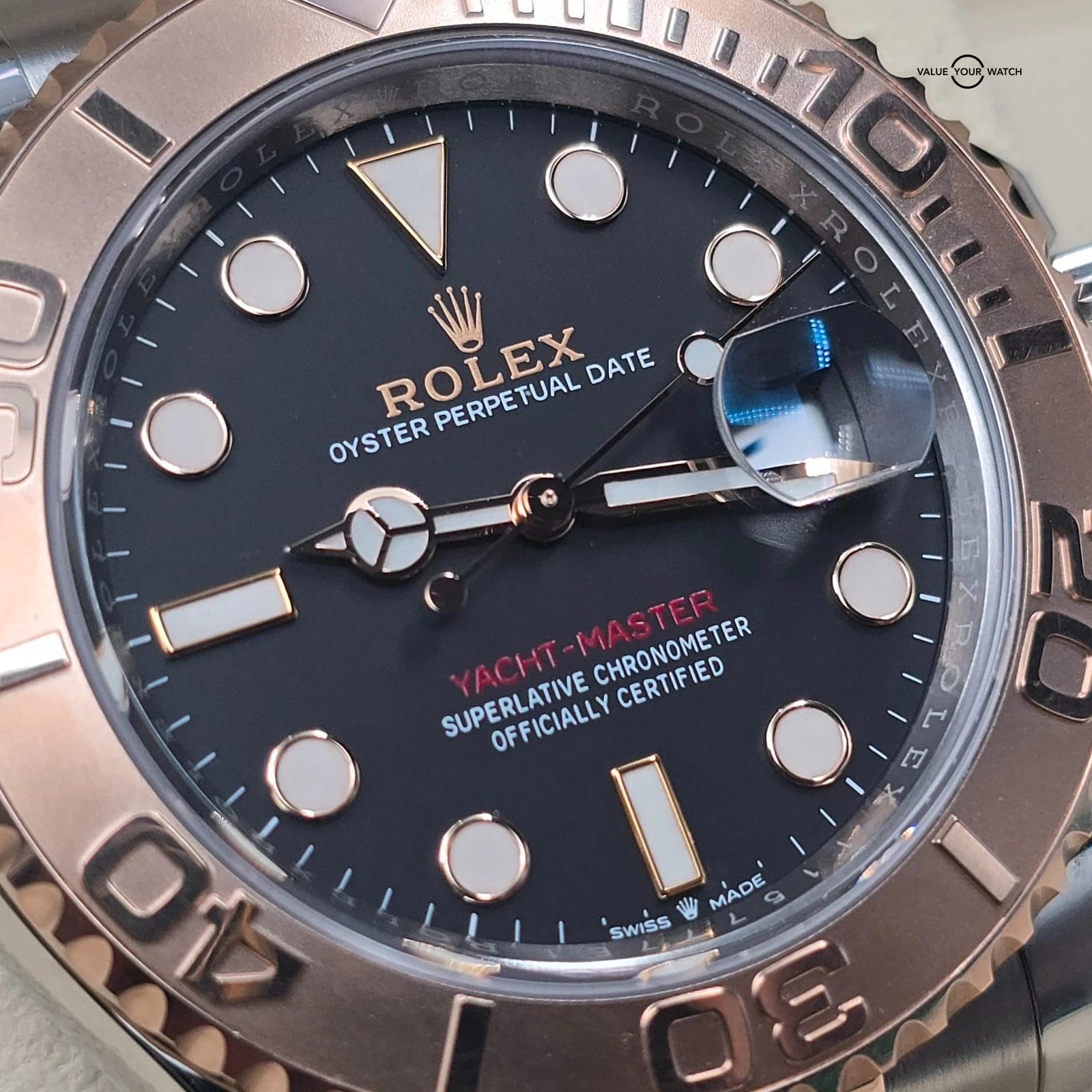 For sale here is an excellent example of the Rolex Yacht-Master 1. This one has the matte black dial, which looks very nice against the rose gold bezel. Ref. 126621.