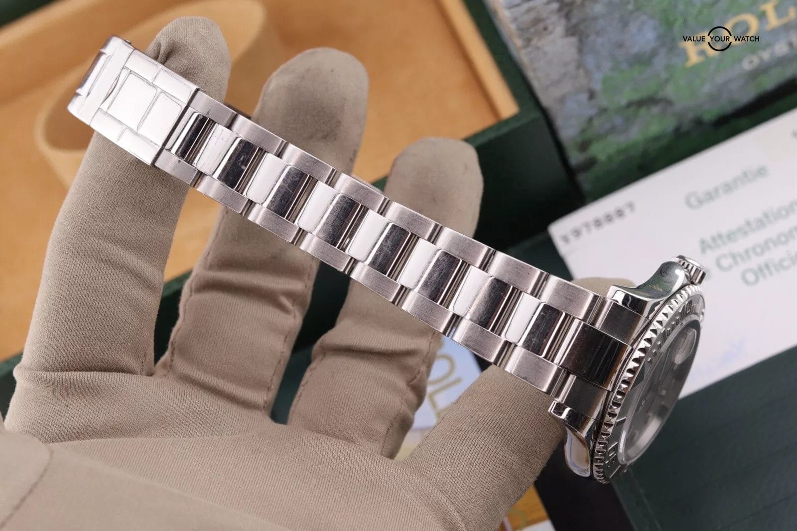 – Clean Crystal and Dial. Healthy running and functioning movement. Case and bracelet have hairlines but nothing deep. Edges are sharp and watch appears to be unpolished (or at least very professionally polished). Bracelet is tight link count is shown. See photos.