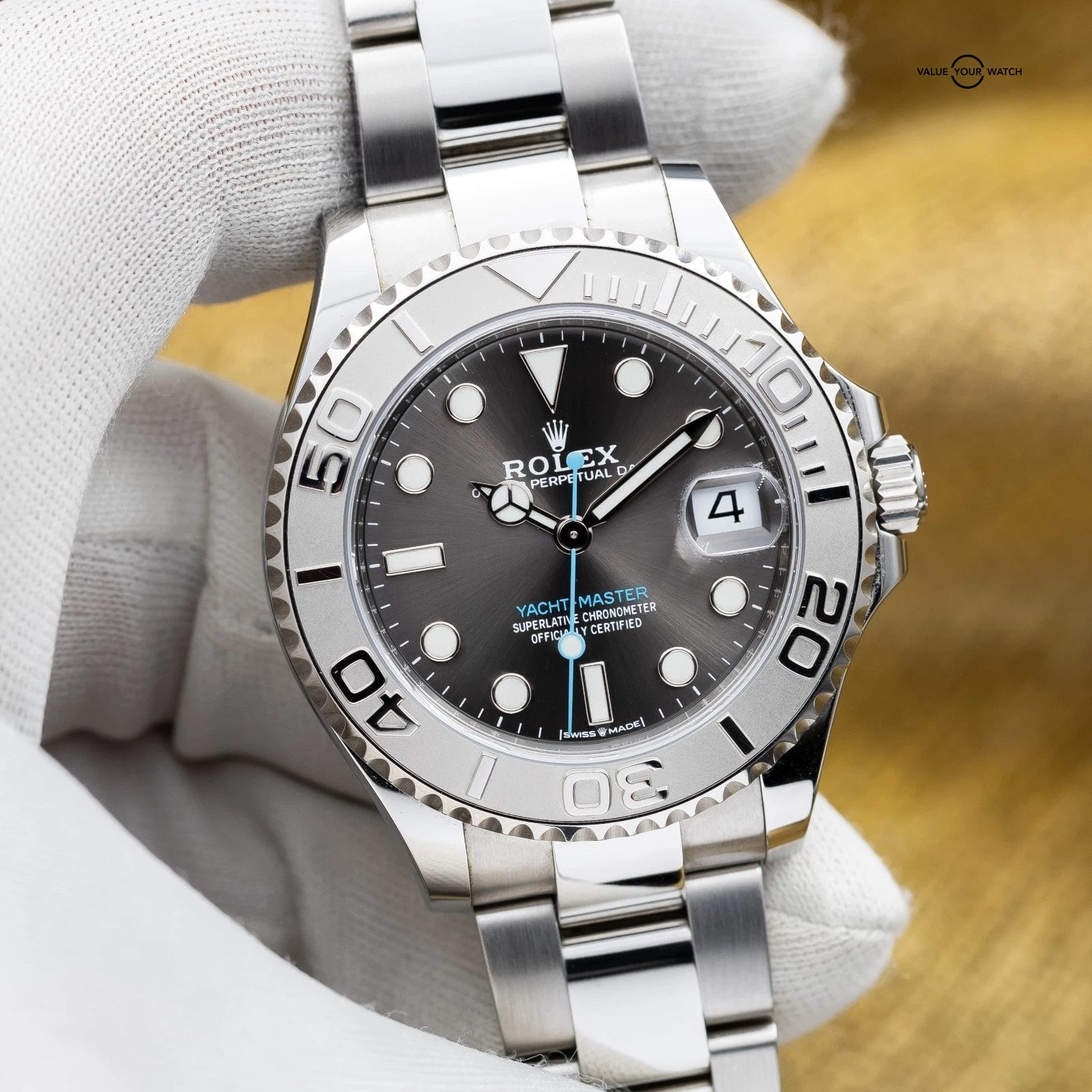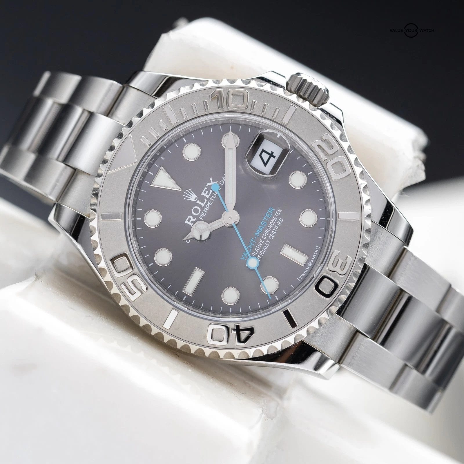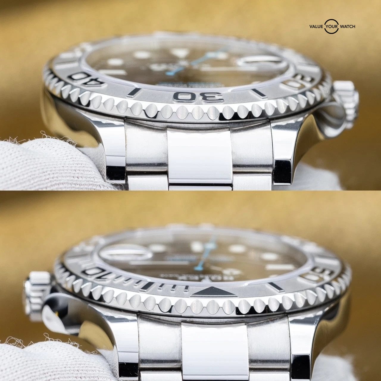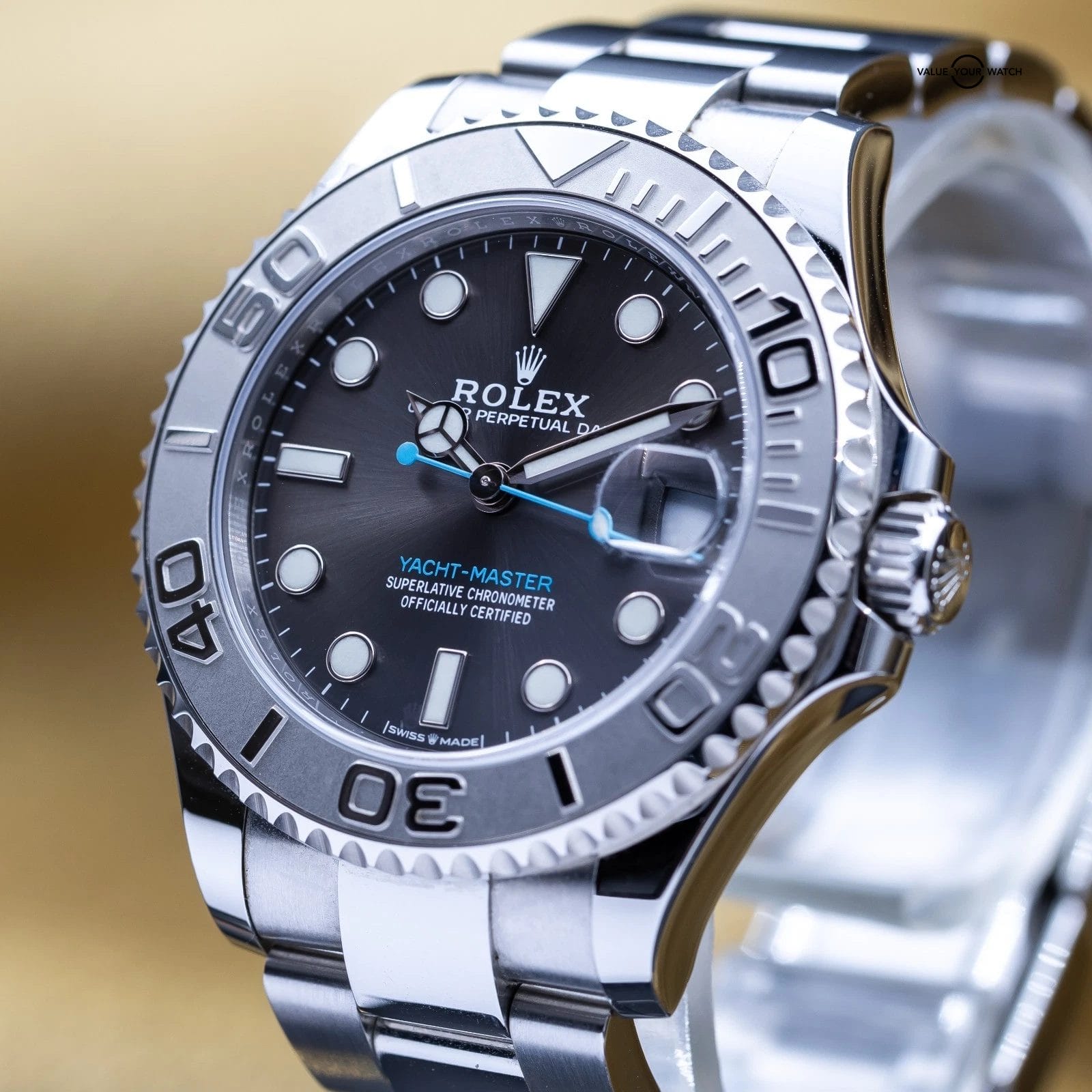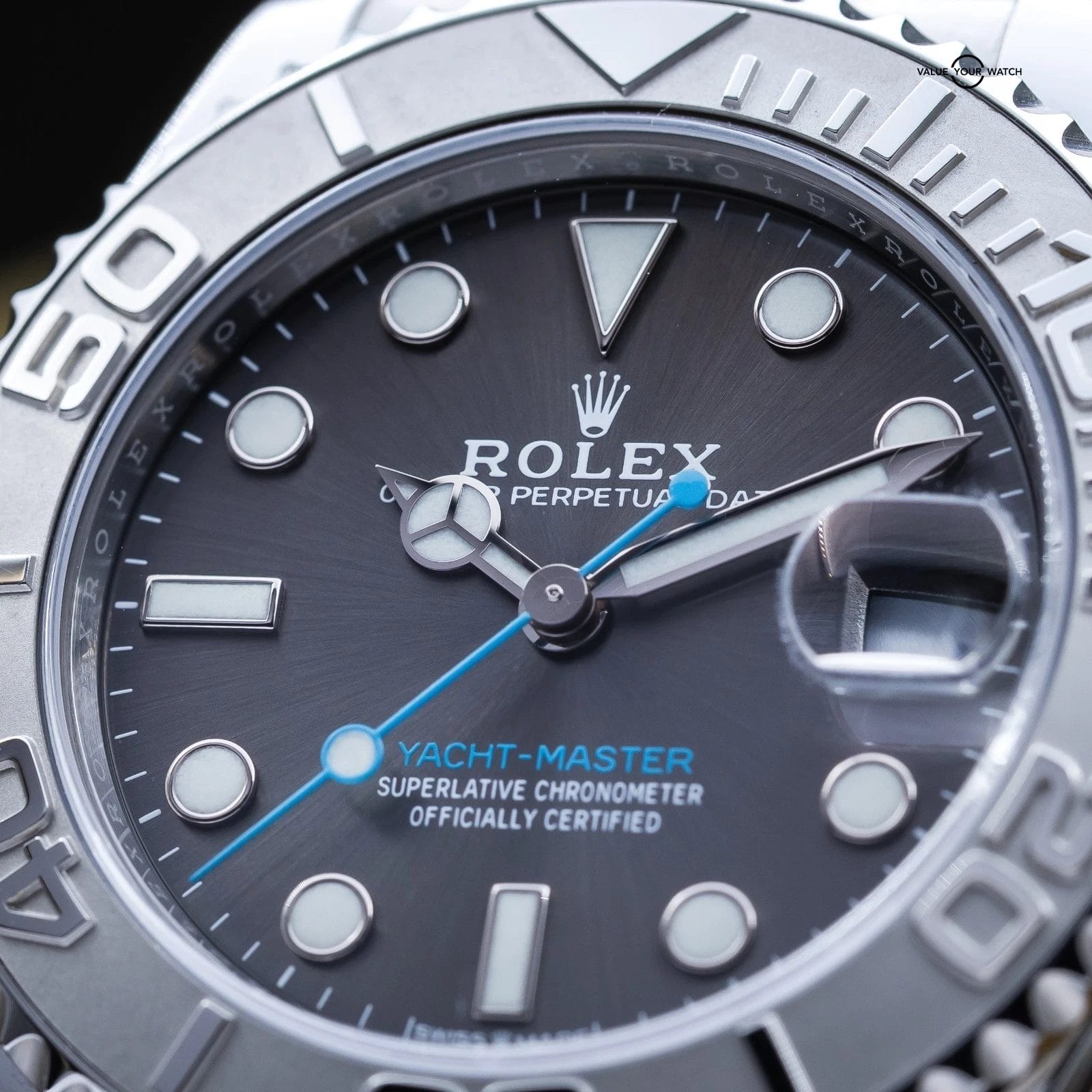 This is the smaller 37 mm version of the Yacht-Master – built with the same precision and materials as its larger sibling, but with a slightly more refined, versatile feel. Crafted from Rolesium, Rolex’s blend of Oystersteel and platinum, it gives off that cool, silvery sheen that quietly says luxury without ever trying too hard. The platinum bezel also has that soft, satiny glow that plays beautifully with light, especially next to the brushed steel case and polished lugs. It’s the kind of watch that feels right anywhere: elegant enough for a dress occasion, tough enough for daily wear, and unmistakably Rolex in every detail.