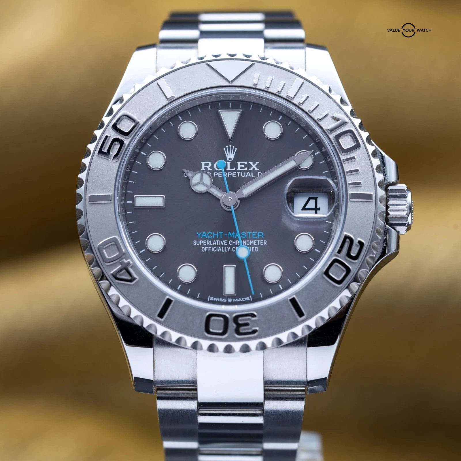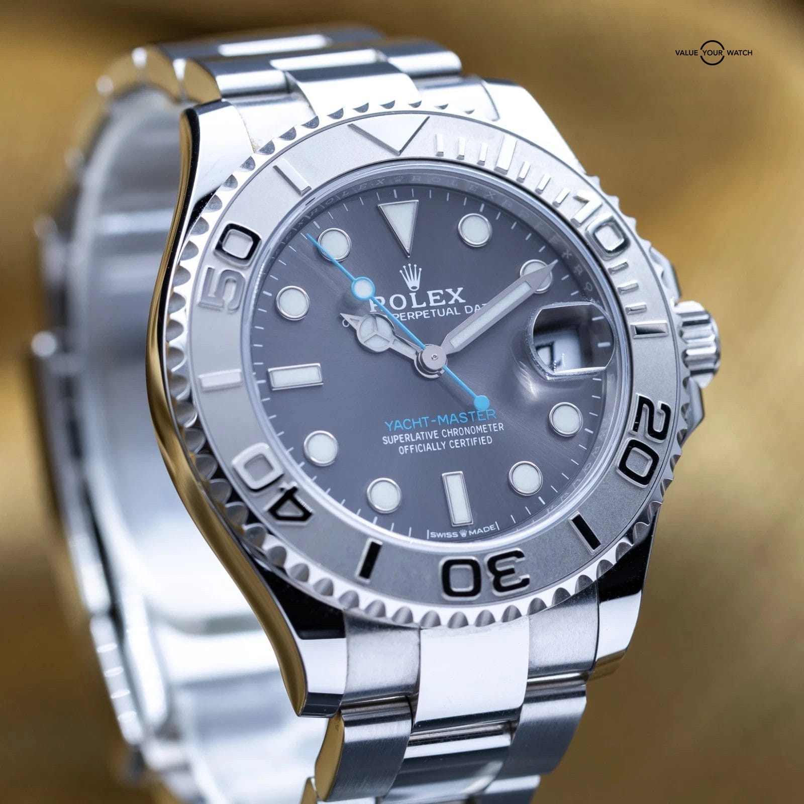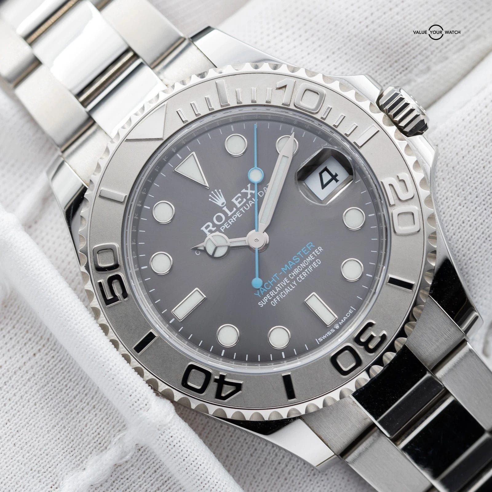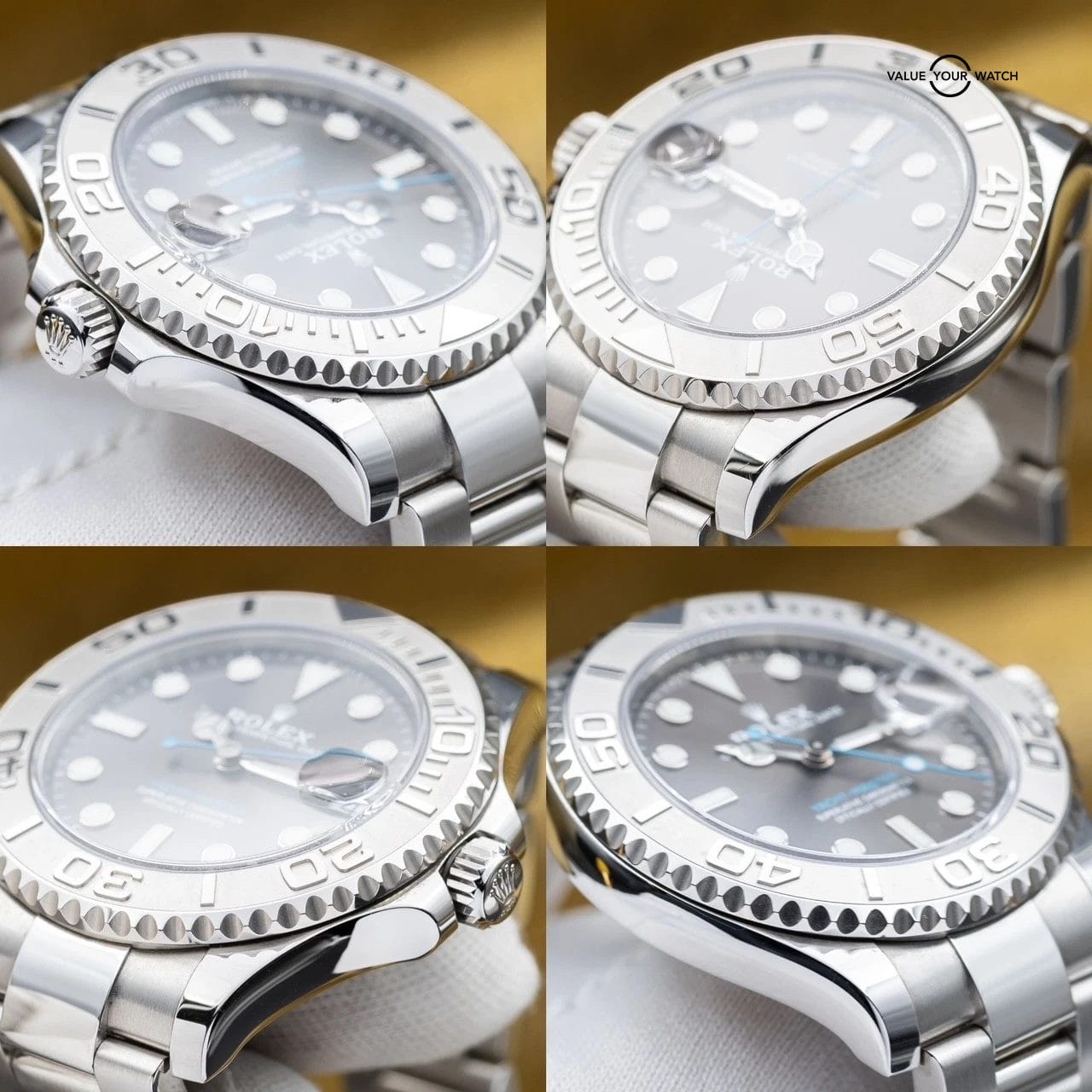 This is the smaller 37 mm version of the Yacht-Master – built with the same precision and materials as its larger sibling, but with a slightly more refined, versatile feel. Crafted from Rolesium, Rolex’s blend of Oystersteel and platinum, it gives off that cool, silvery sheen that quietly says luxury without ever trying too hard. The platinum bezel also has that soft, satiny glow that plays beautifully with light, especially next to the brushed steel case and polished lugs. It’s the kind of watch that feels right anywhere: elegant enough for a dress occasion, tough enough for daily wear, and unmistakably Rolex in every detail.