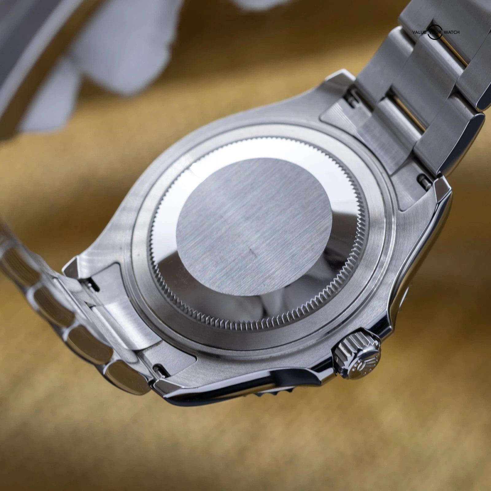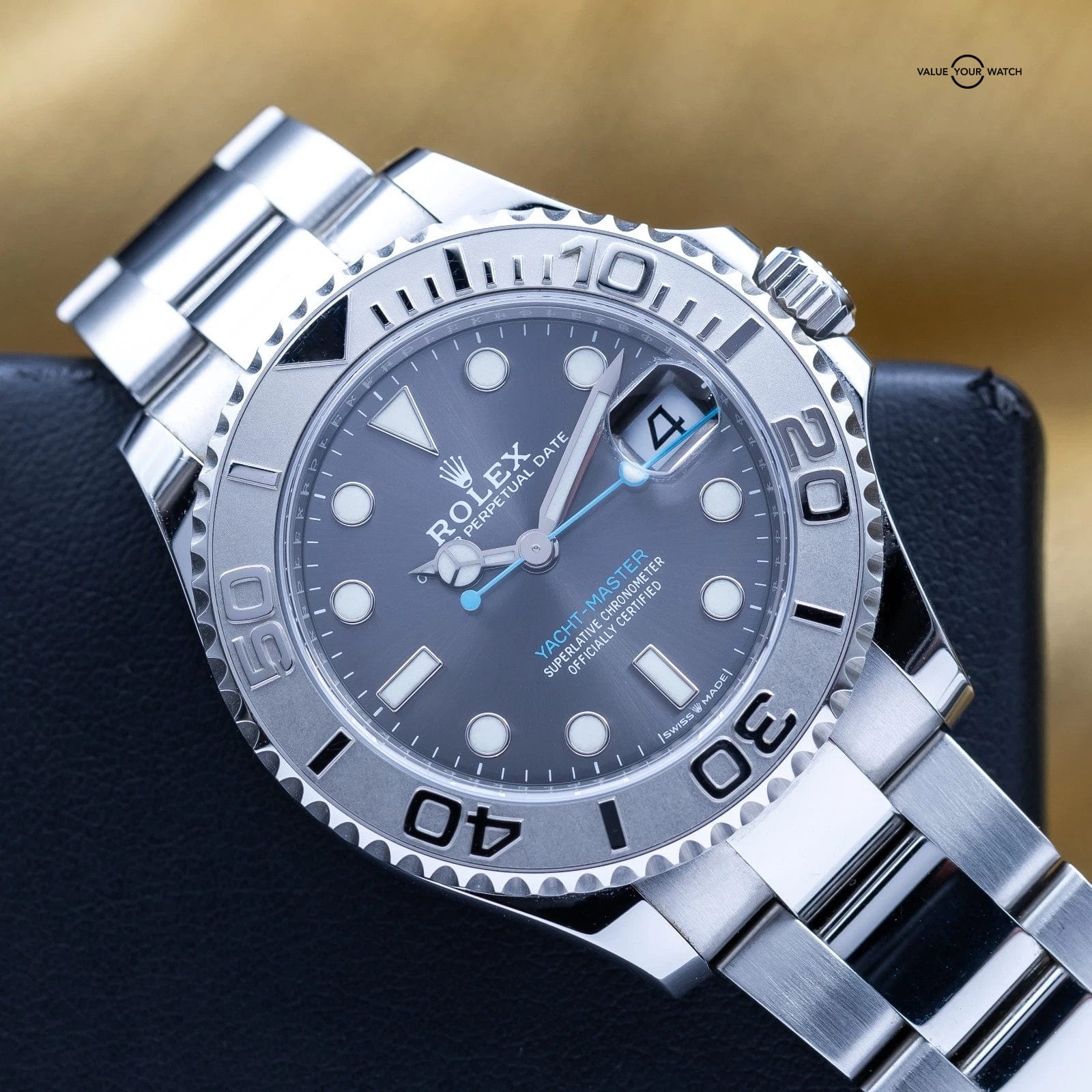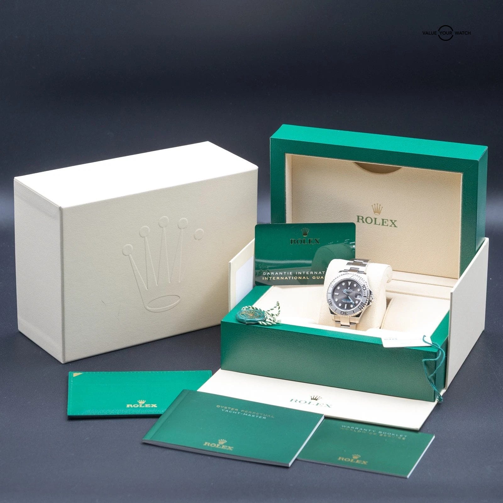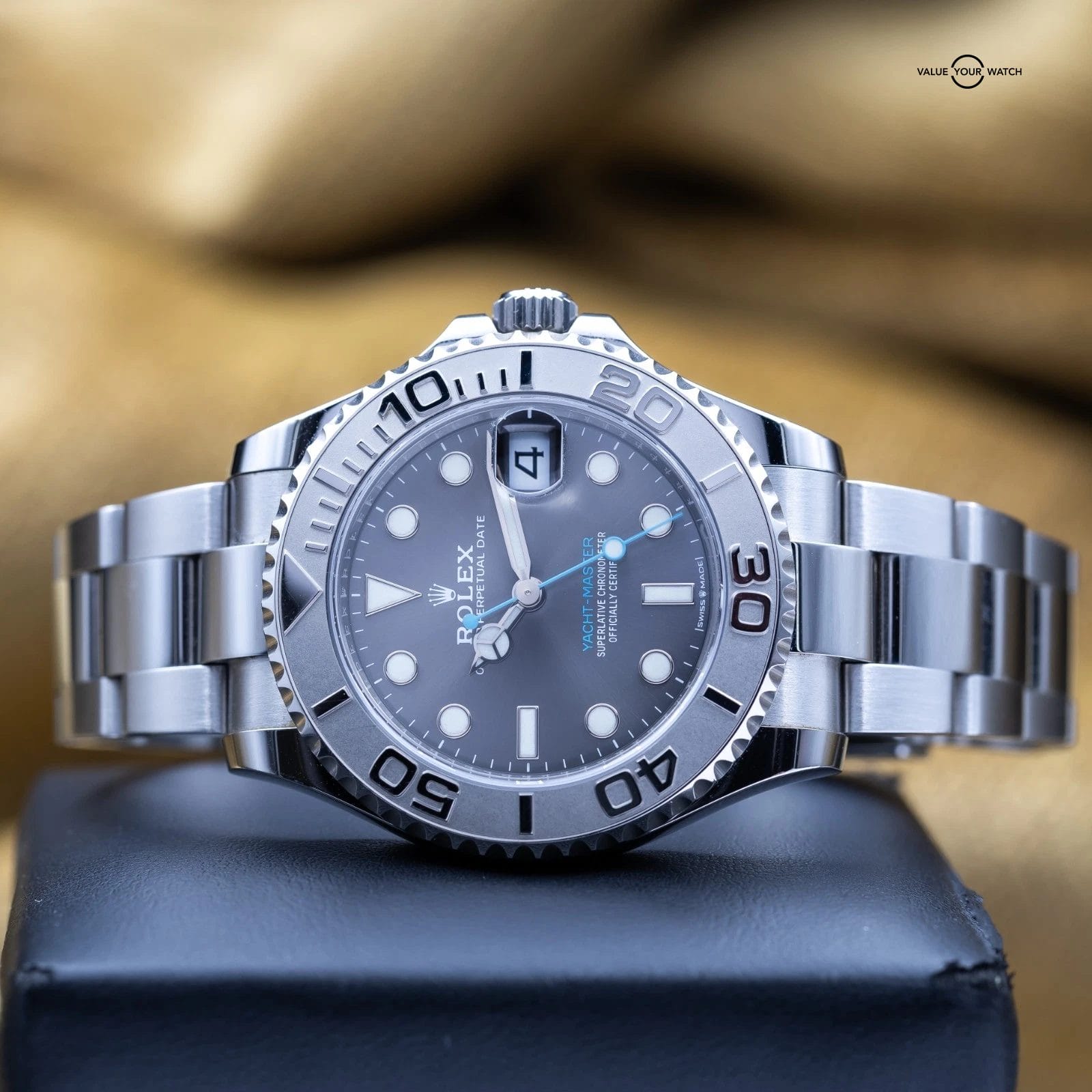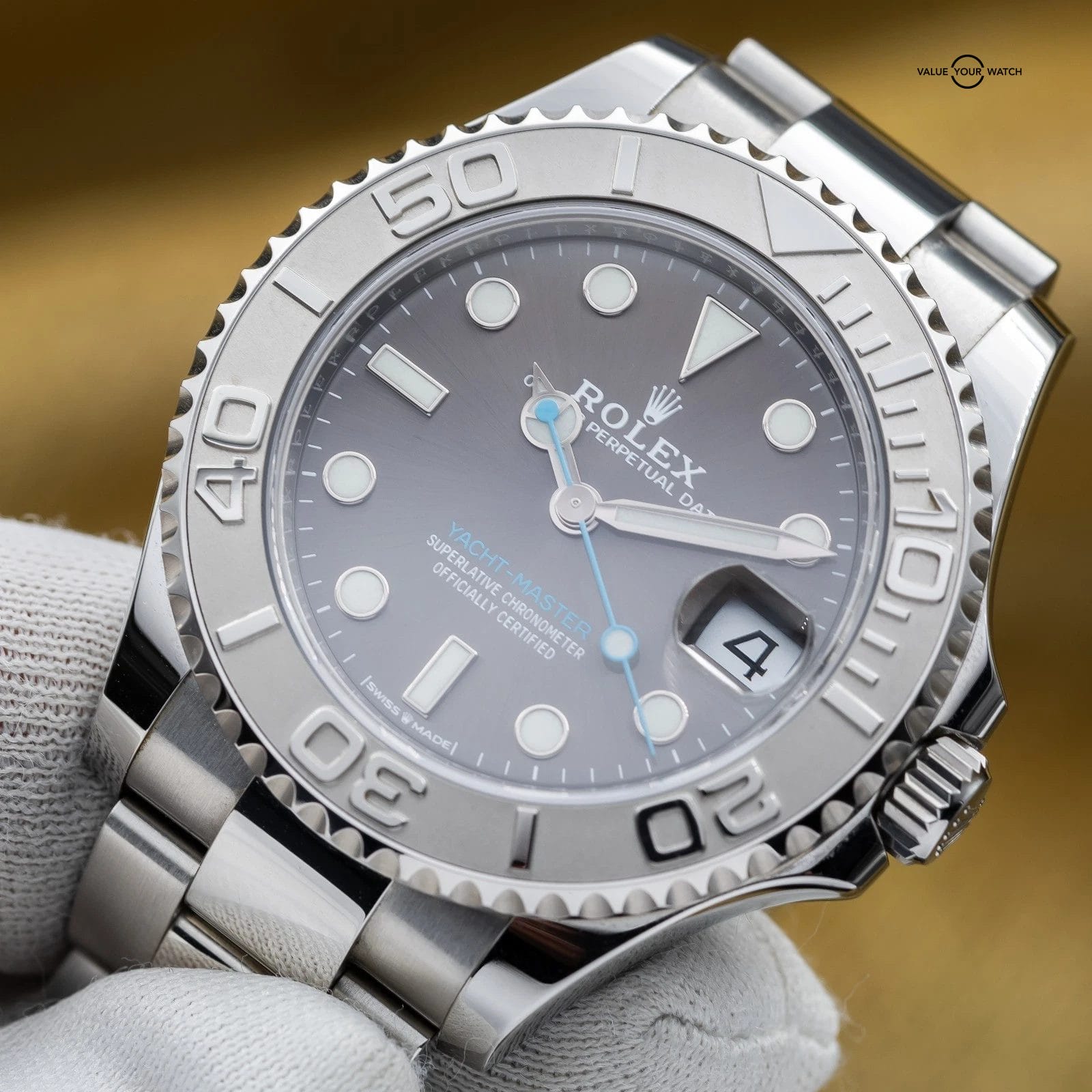 This is the smaller 37 mm version of the Yacht-Master – built with the same precision and materials as its larger sibling, but with a slightly more refined, versatile feel. Crafted from Rolesium, Rolex’s blend of Oystersteel and platinum, it gives off that cool, silvery sheen that quietly says luxury without ever trying too hard. The platinum bezel also has that soft, satiny glow that plays beautifully with light, especially next to the brushed steel case and polished lugs. It’s the kind of watch that feels right anywhere: elegant enough for a dress occasion, tough enough for daily wear, and unmistakably Rolex in every detail.