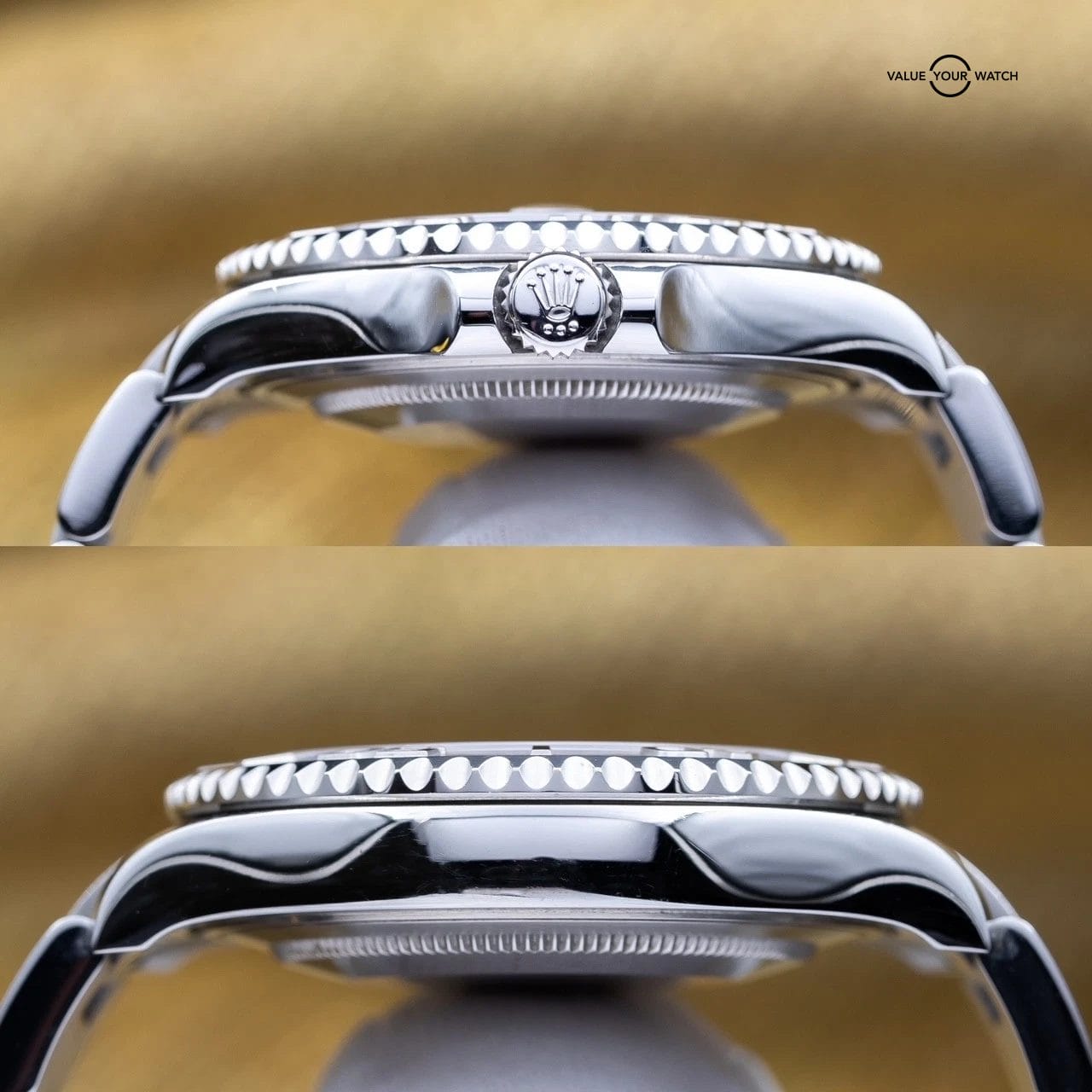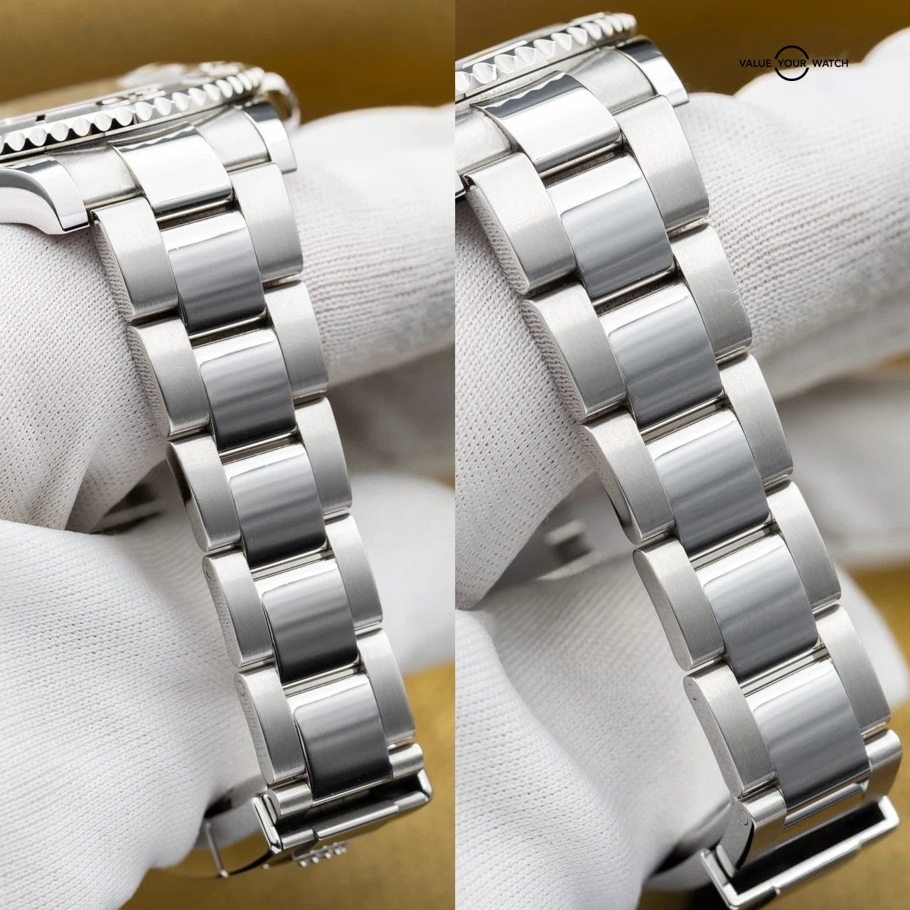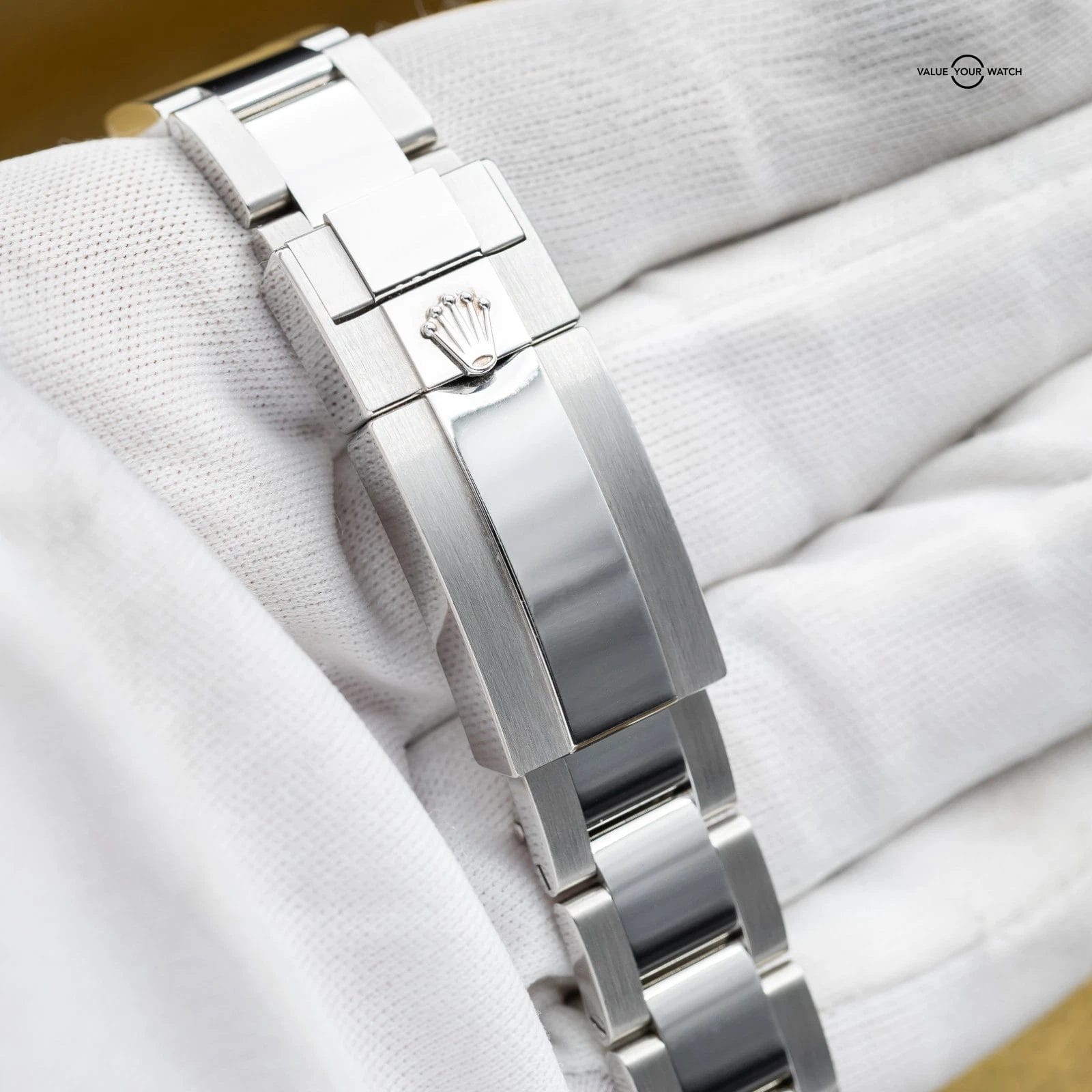 Pre-owned and in great shape! Watch is from 2020. Comes with boxes and all papers, including warranty card as well as all original bracelet links, green Rolex hang tag, and even the white hang tag with serial number details. The case, crystal and bracelet are in great condition. Watch is keeping great time, as you’d expect.