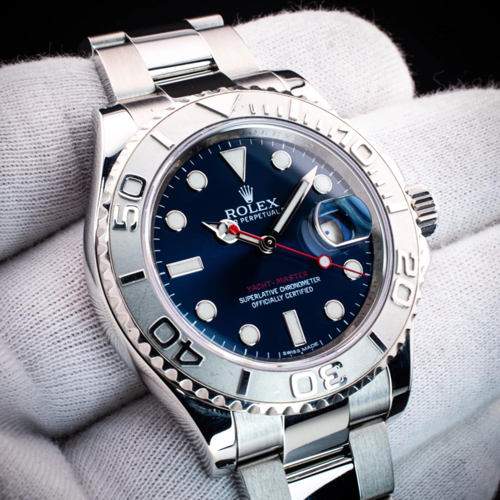 Step aboard in style with the Rolex Yacht-Master 40, Reference 116622, featuring a captivating blue dial complemented by a luminous display and a bidirectional rotatable bezel. This model embodies luxury and functionality, ideal for seafaring enthusiasts and watch connoisseurs alike.