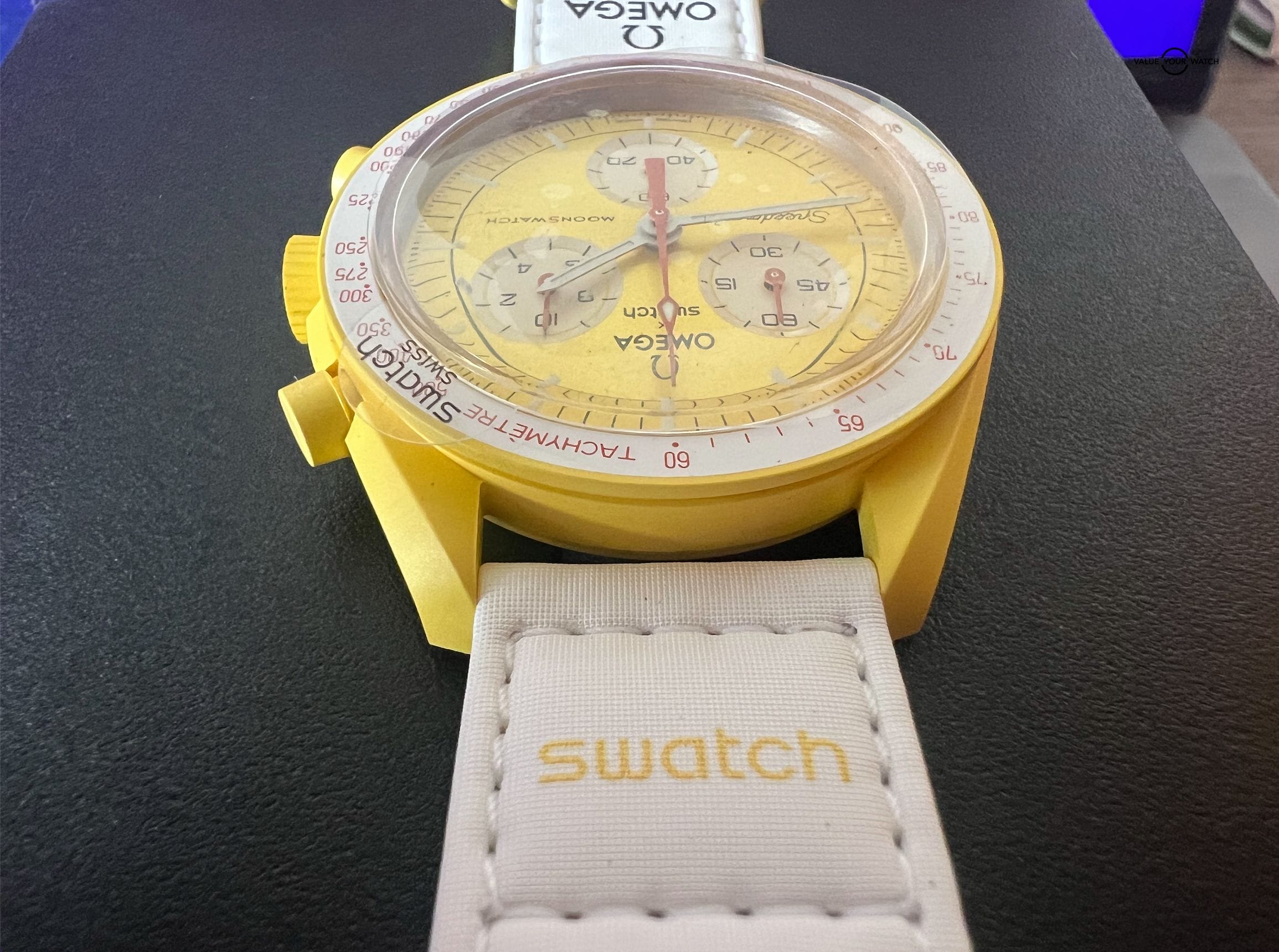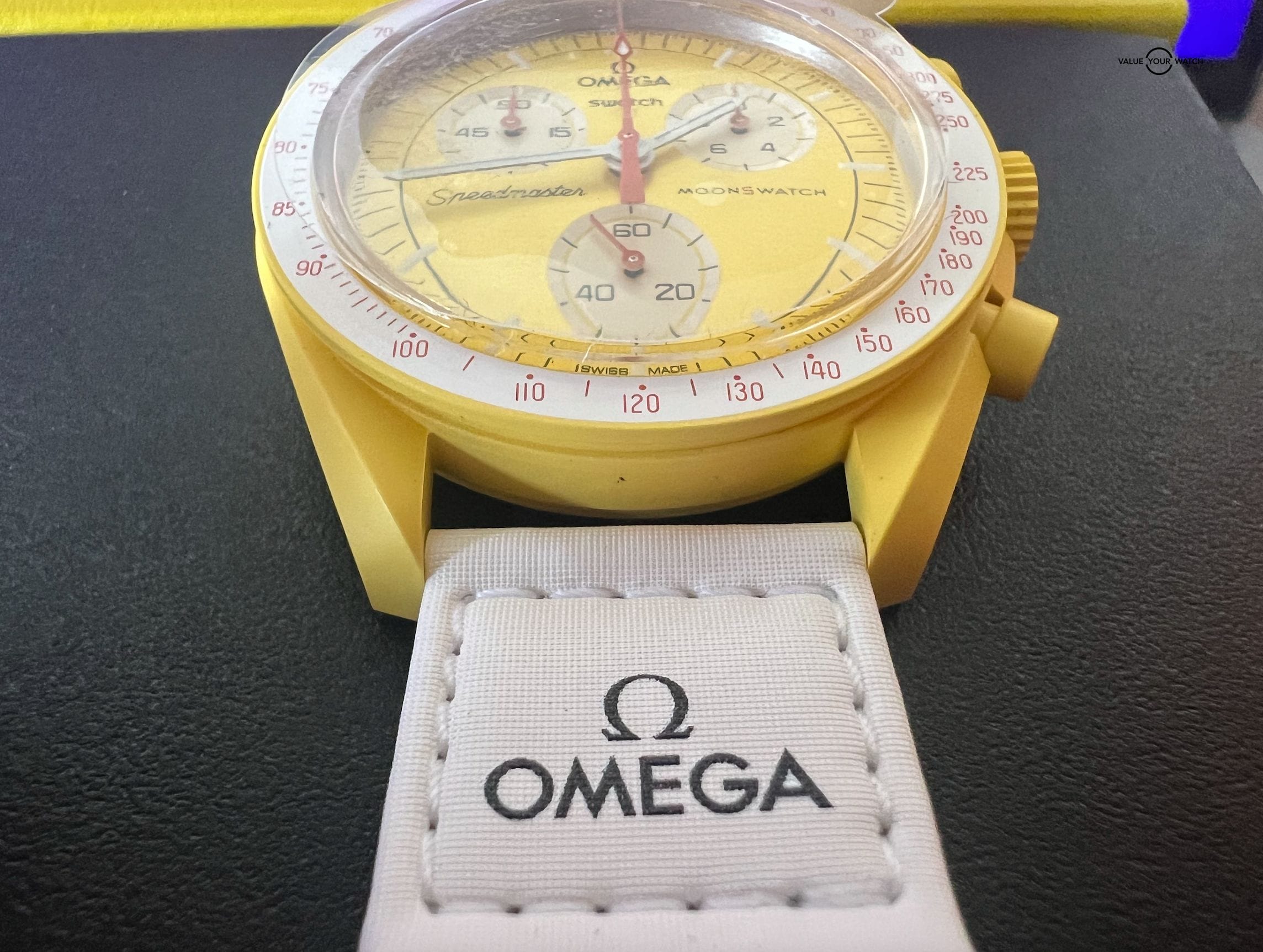 This specific Moonswatch its called Mission to the Sun and comes on the velcro.