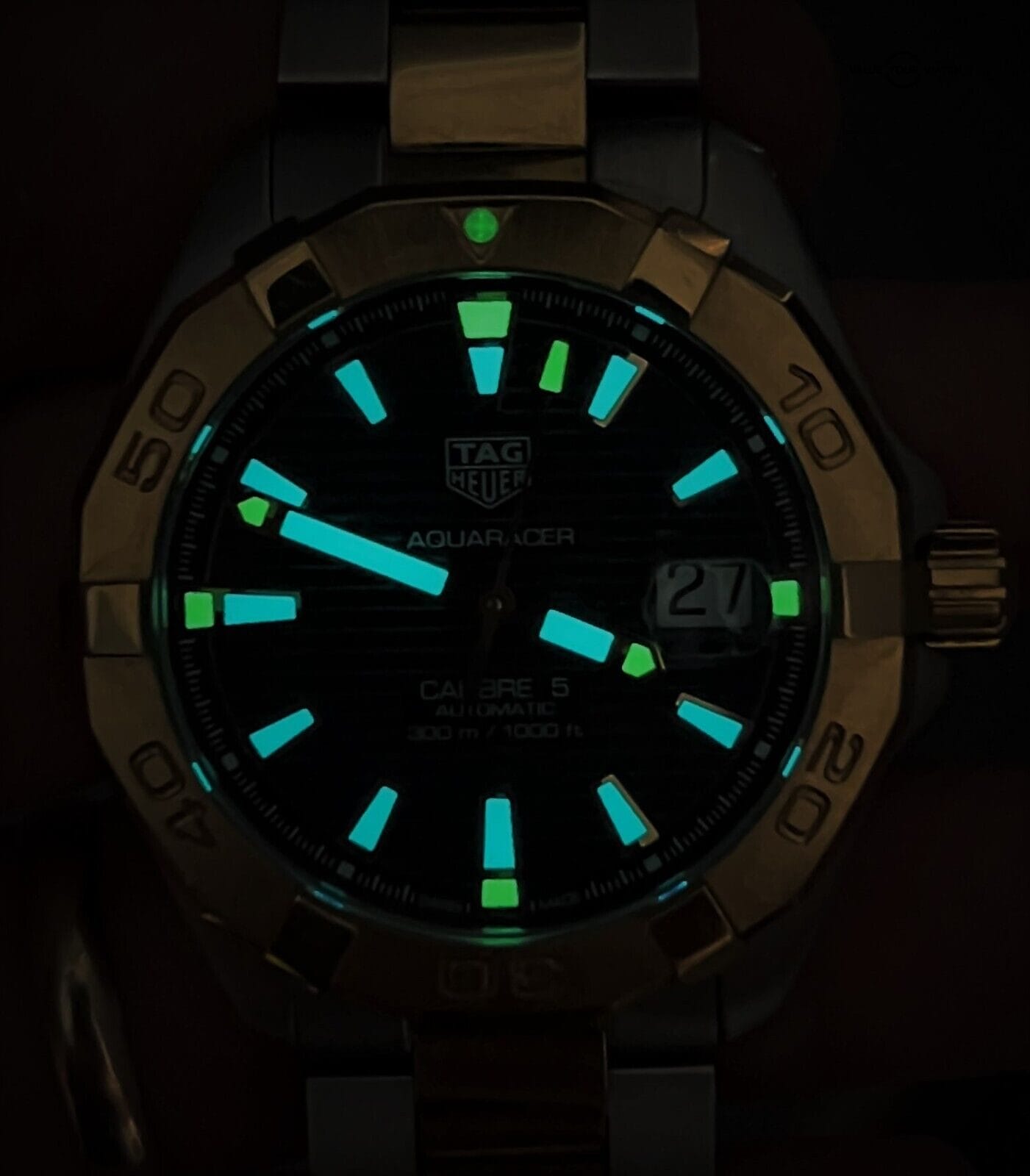 The Aquaracer 41mm Calibre 5 features a stainless steel case with a diameter of 41mm, offering a bold and masculine presence on the wrist. The striking blue dial, adorned with luminous markers and hands, exudes a sense of depth and elegance.
