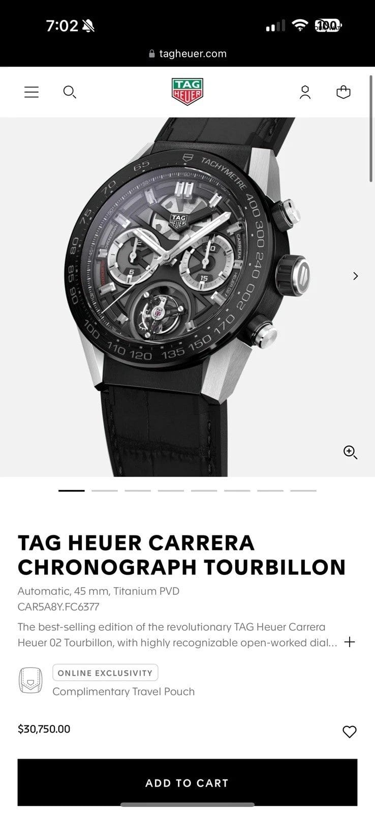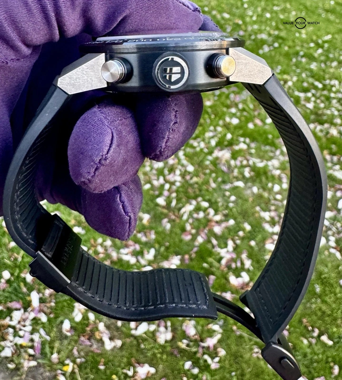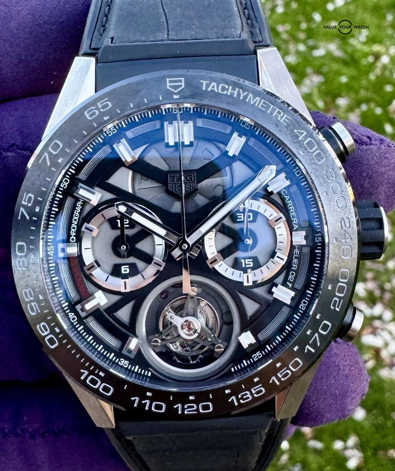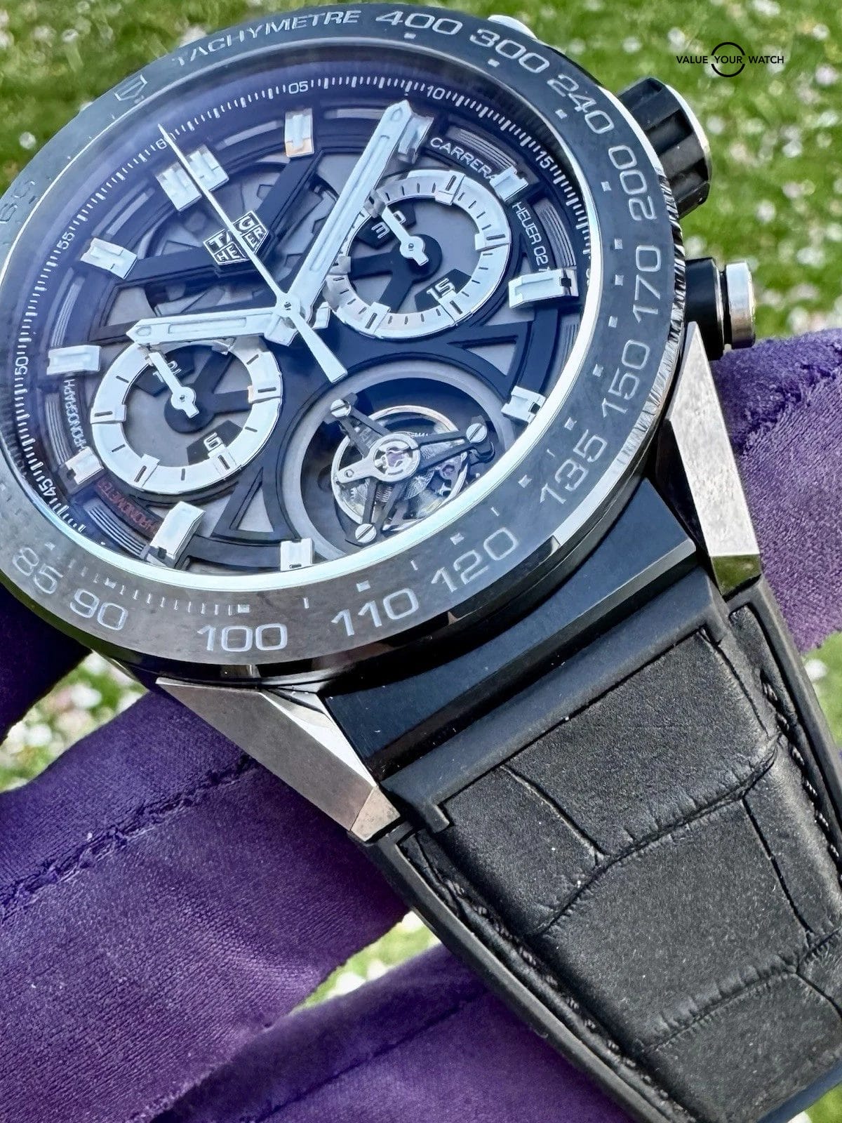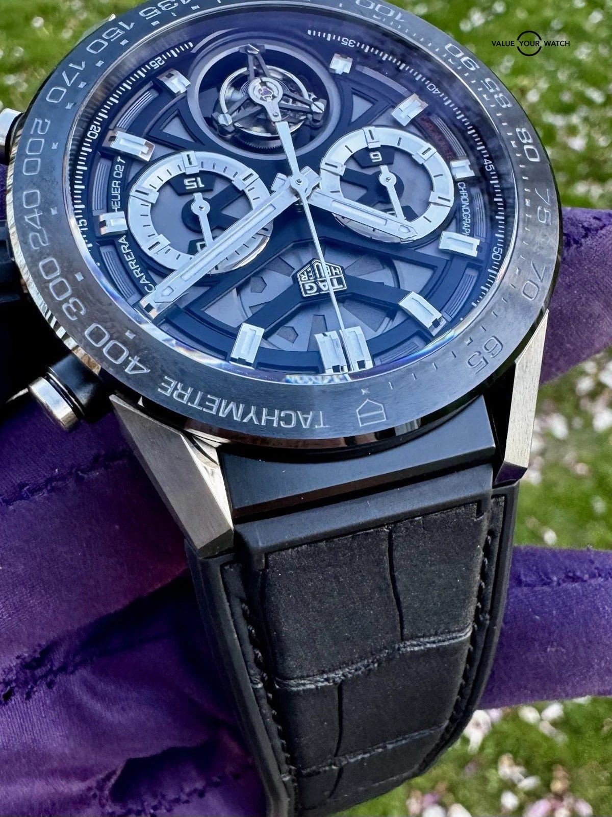 The TAG Heuer Carrera Calibre Tourbillon HEUER-02T (CAR5A8Y.FC6377) features a commanding 45mm titanium case paired with a black ceramic tachymeter bezel, embodying both technical prowess and bold design. Its skeleton dial reveals the intricate mechanics within, featuring luminous hands and hour markers, chronograph subdials at 3 and 9 o’clock, and a captivating tourbillon at 6 o’clock that highlights the watch’s horological sophistication. A stylish leather strap with a rubber inlay and fold clasp completes the ensemble. Bid now and add this elegant timepiece to your collection!
