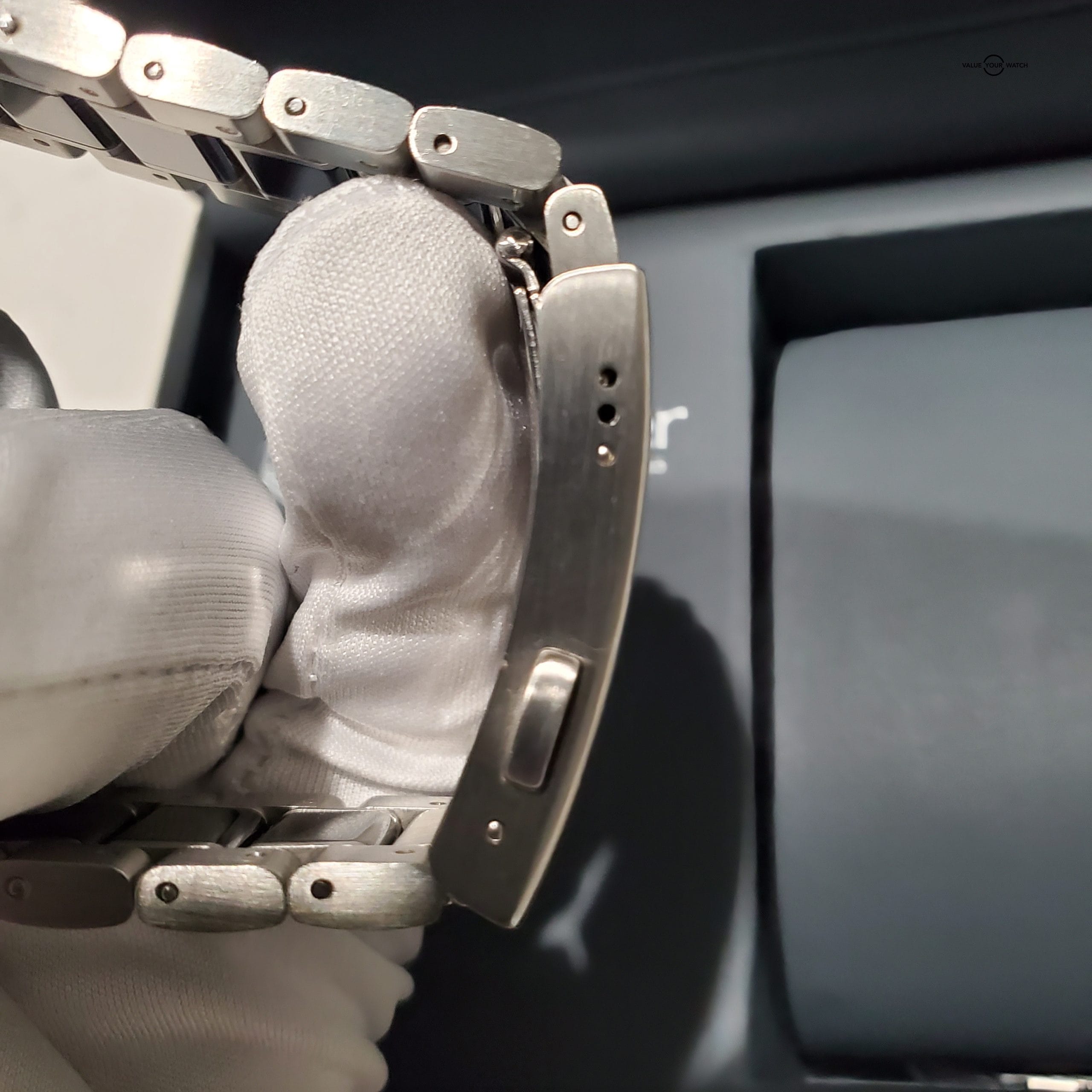 This timepiece is in excellent pre-owned condition. There are very slight hairline scratches on the clasp, which is virtually impossible to avoid when wearing a metal band. The automatic movement is functioning flawlessly.