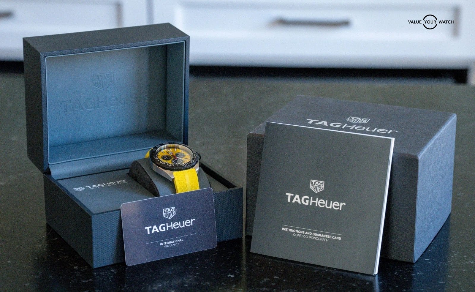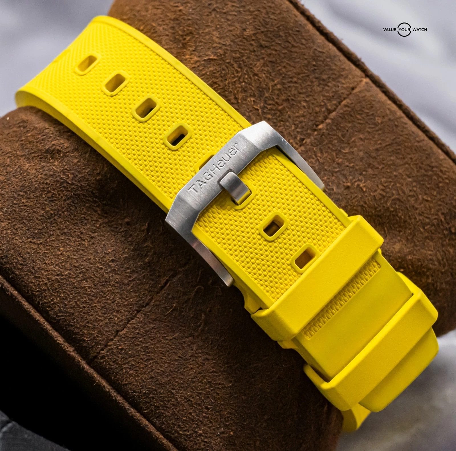 STUNNING Tag Heuer Formula 1 Chronograph Quartz Men’s 43 mm with Yellow Sunray Radiant Brushed Dial on Yellow Tag Heuer Rubber! Arrives as a complete set with the original Tag Heuer boxes and papers including the warranty card & manual from the original 2023 purchase at a Tag Heuer Authorized Dealer. This is a solid everyday Tag Heuer to add to any collection, quite iconic and sporty with the Yellow. Great first nice watch, gift, or another watch to add to the collection. Can’t beat it at the dollar!