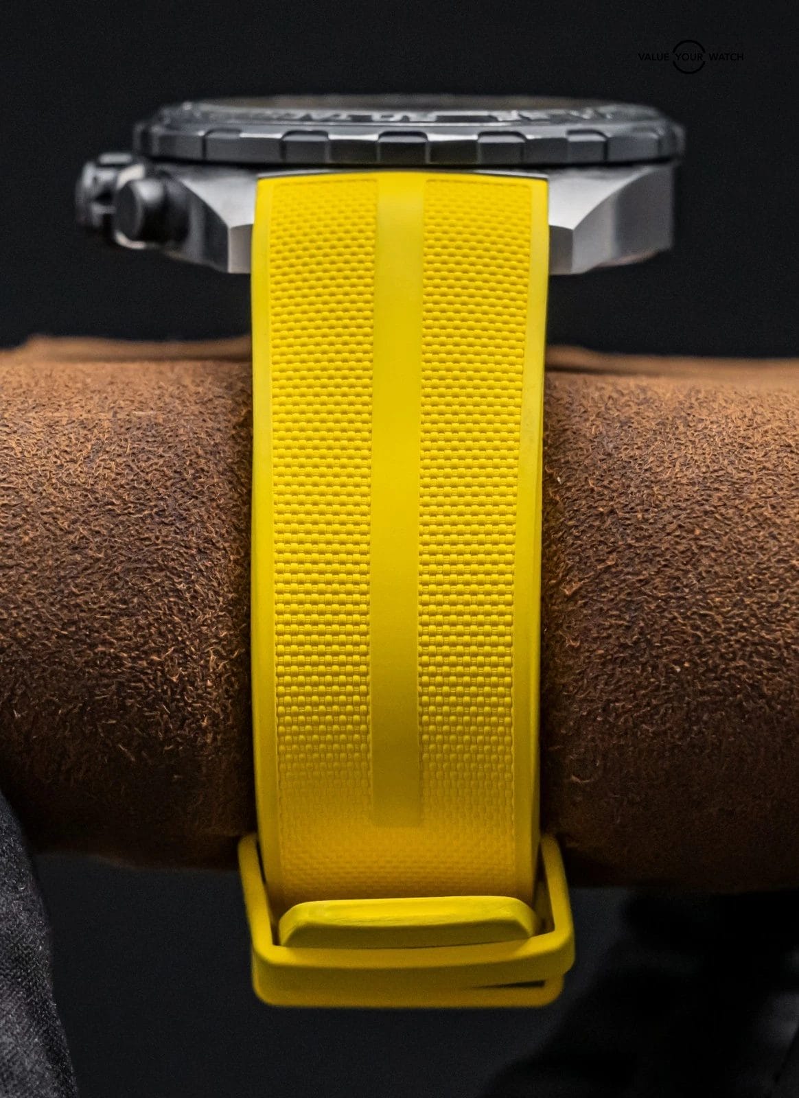 “Resolutely inspired by the brisk energy of motor racing, this TAG Heuer Formula 1 associates a vibrant yellow sunray brushed dial with racing-ready chronograph counters and bold dial details. Designed for those who thrive on speed-driven adrenaline… Get ready for the rush with the fresh and energetic TAG Heuer Formula 1. With a high-contrast dial and a high-quality rubber strap, this fearless performer is ready for the fast lane. Make no mistake, it’s built to handle life’s thrills and spills.”