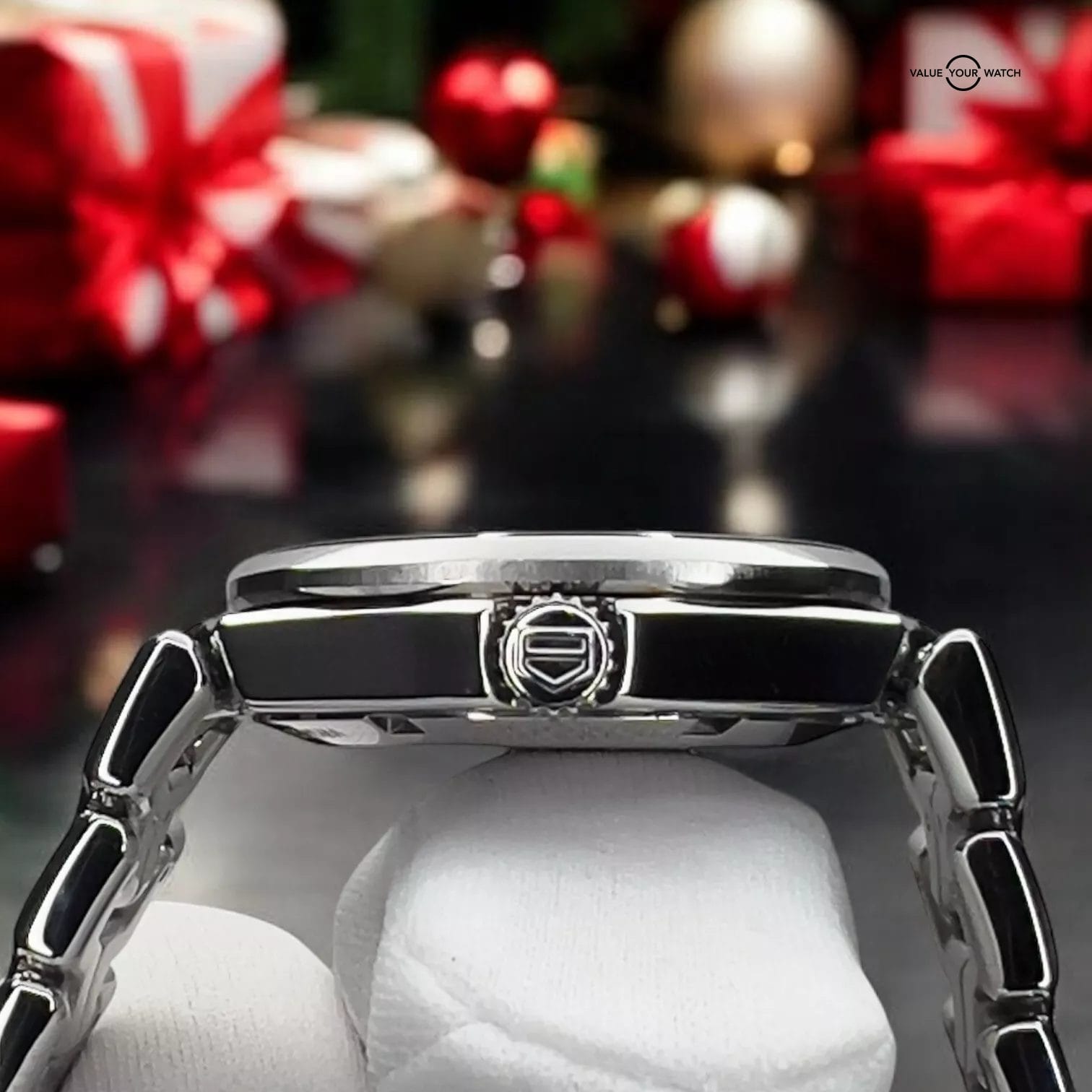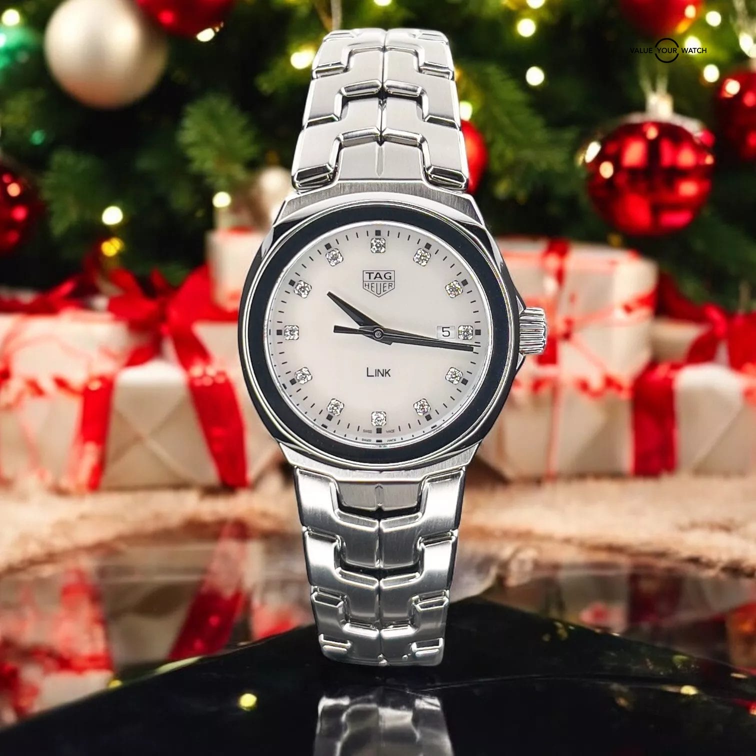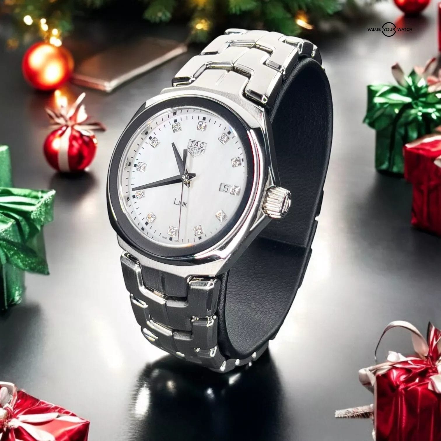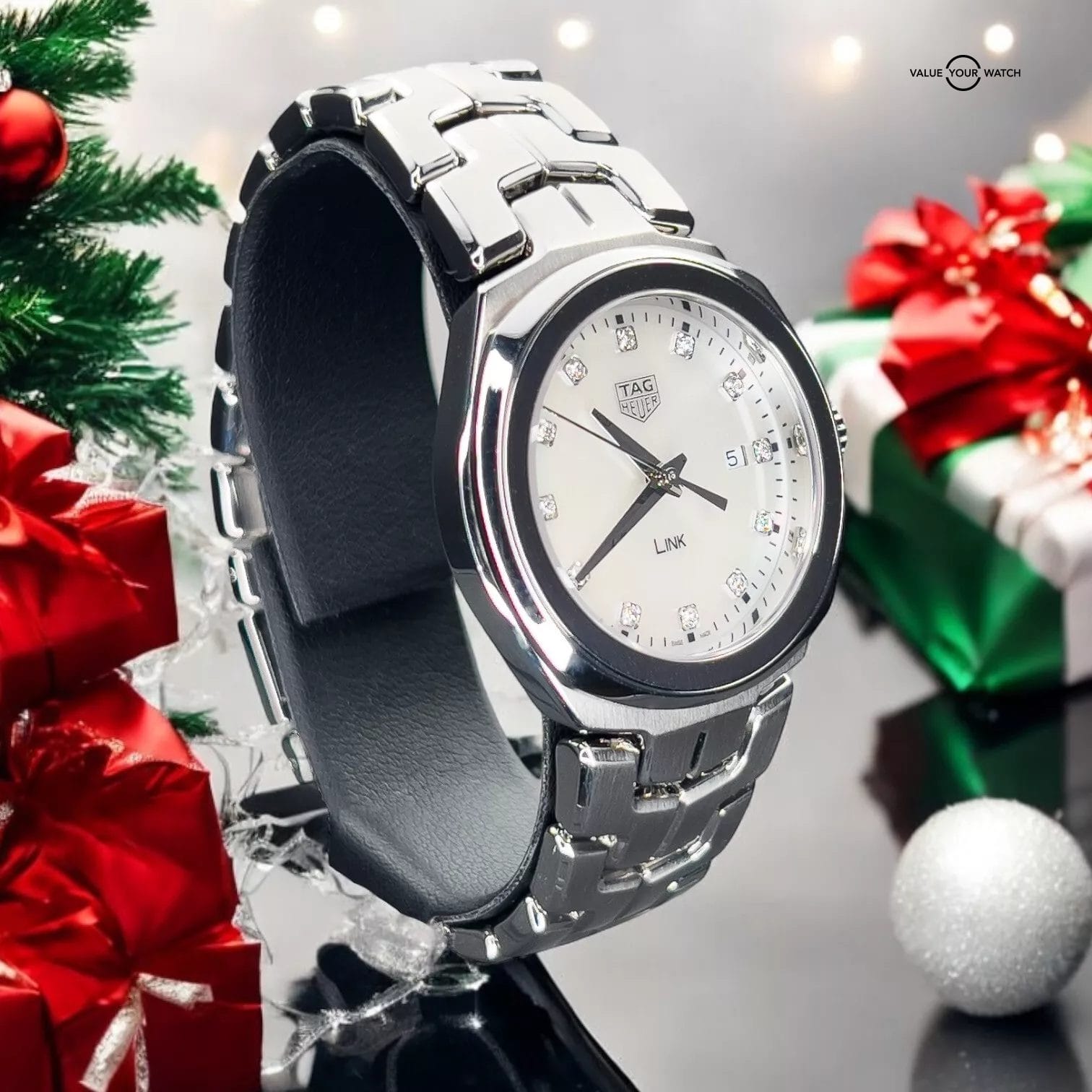 The TAG Heuer Link Lady WBC1312.BA0600 features a 32mm steel case with a matching smooth bezel. The Mother of Pearl dial is elegant and classy and is adorned with sparkling diamond hour markers and silver-toned hands, for a clean and exquisite look. It also showcases a date window at 3 o’clock. This piece is completed with the iconic Tag Heuer Link matching steel bracelet and a folding clasp. Add this Beautiful Link Lady to your collection today.
