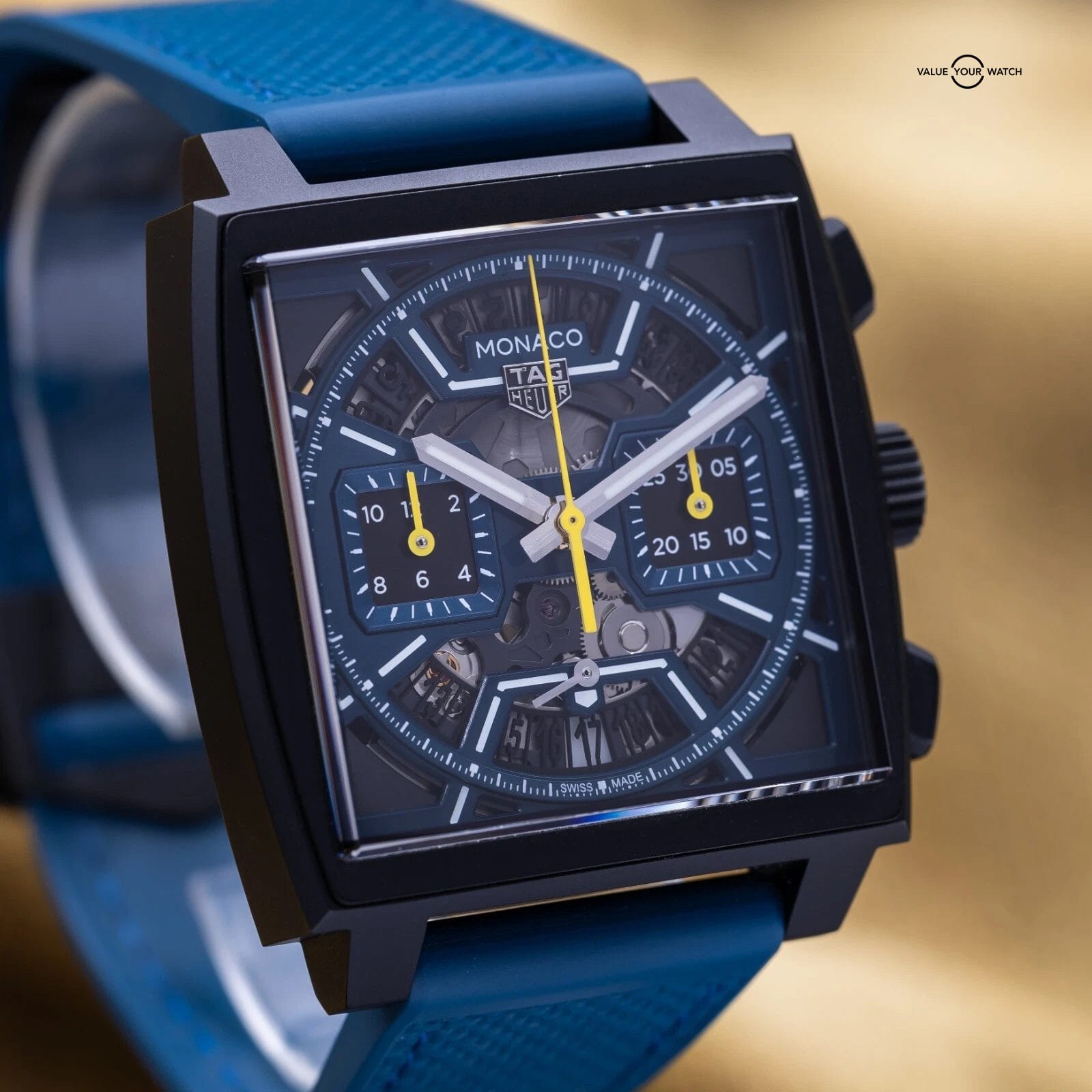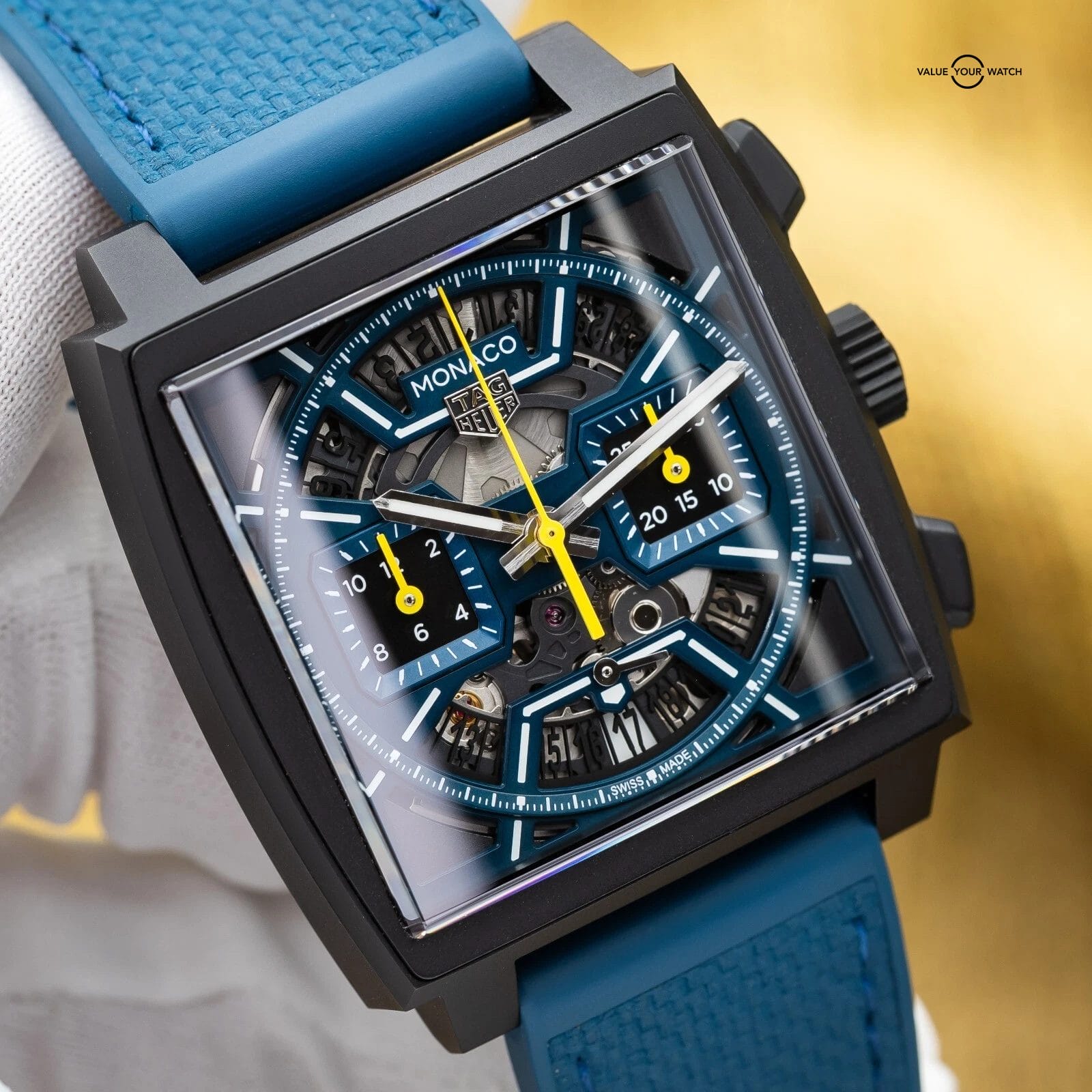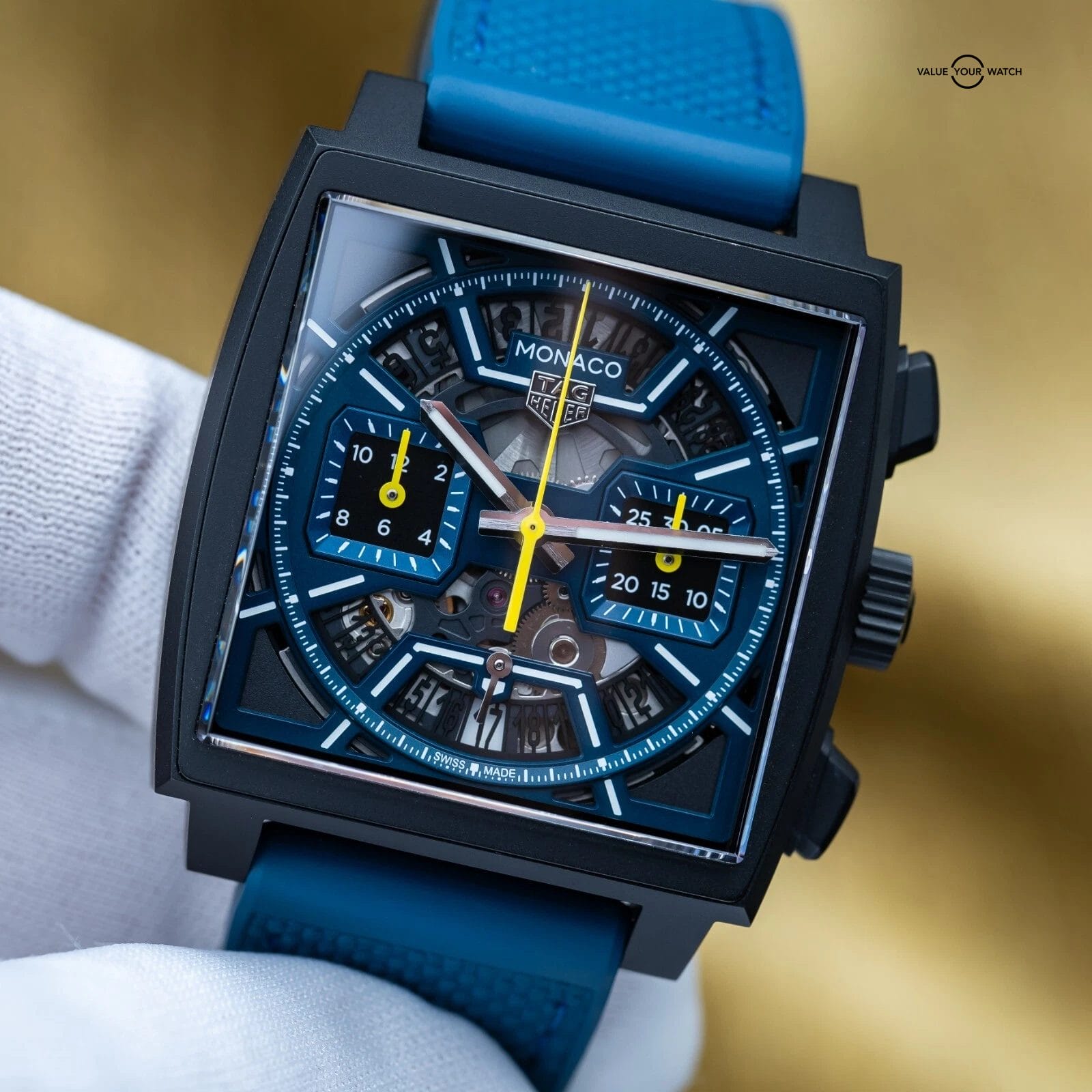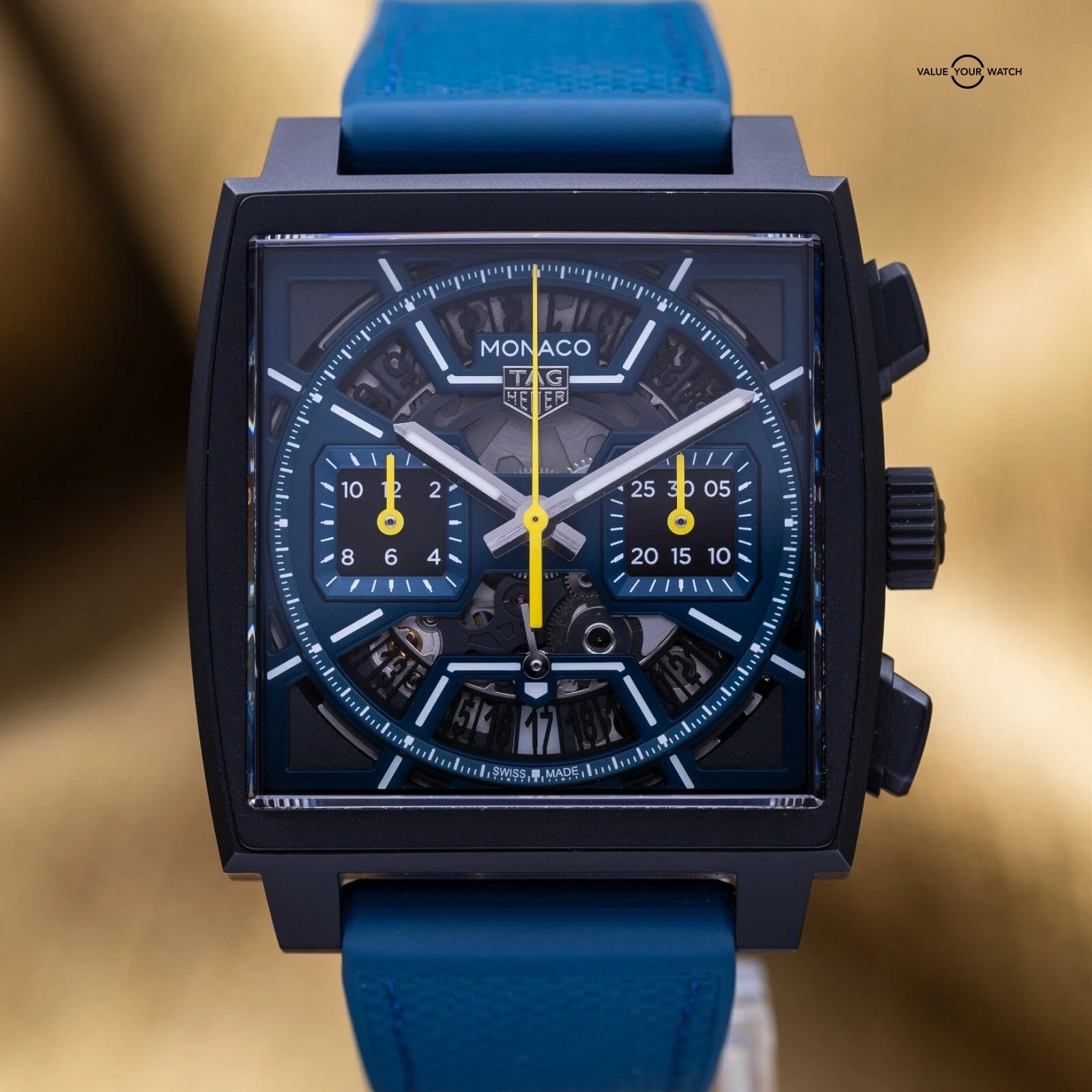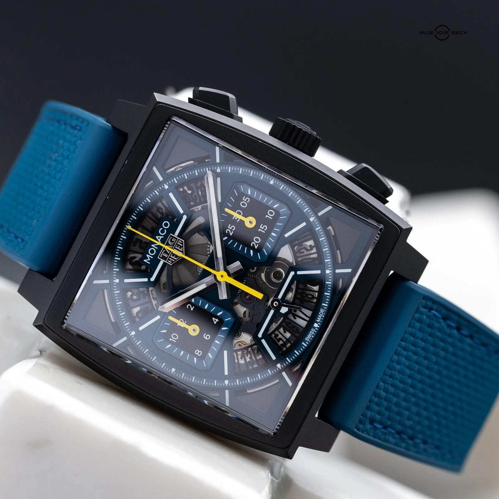 One of the most iconic chronographs ever created, the Monaco! This one in the new black DLC titanium case with the skeleton dial! The unique square dial of the Monaco was the housing for one of the first automatic chronographs ever. Today it is still the flagship of the TAG Heuer brand. This watch started its life on the wrists of the famed drivers of Formula 1 in the late 60’s and early 70’s. This variant is a modern reinterpretation of the iconic design, bound to turn heads!