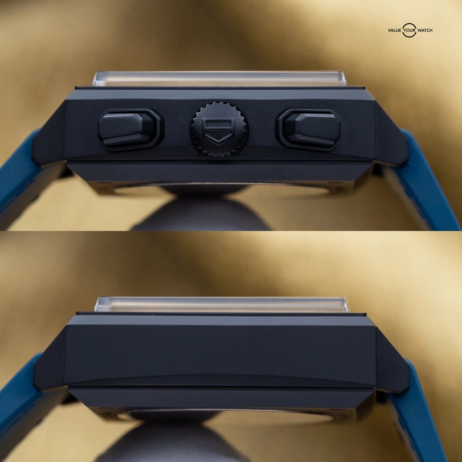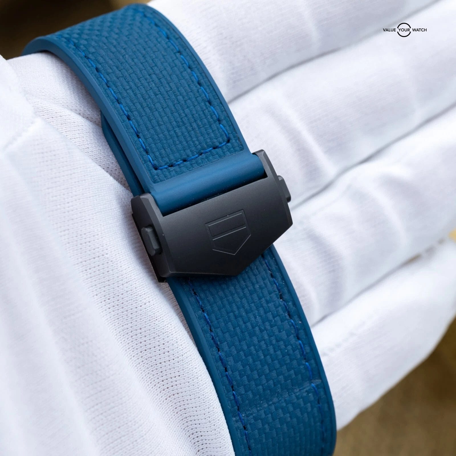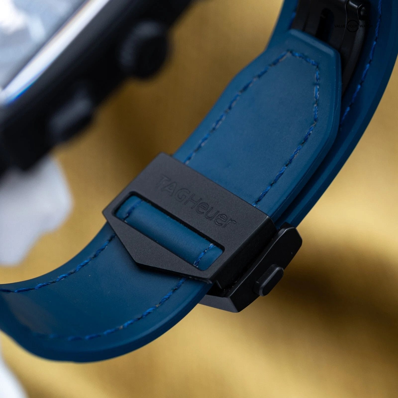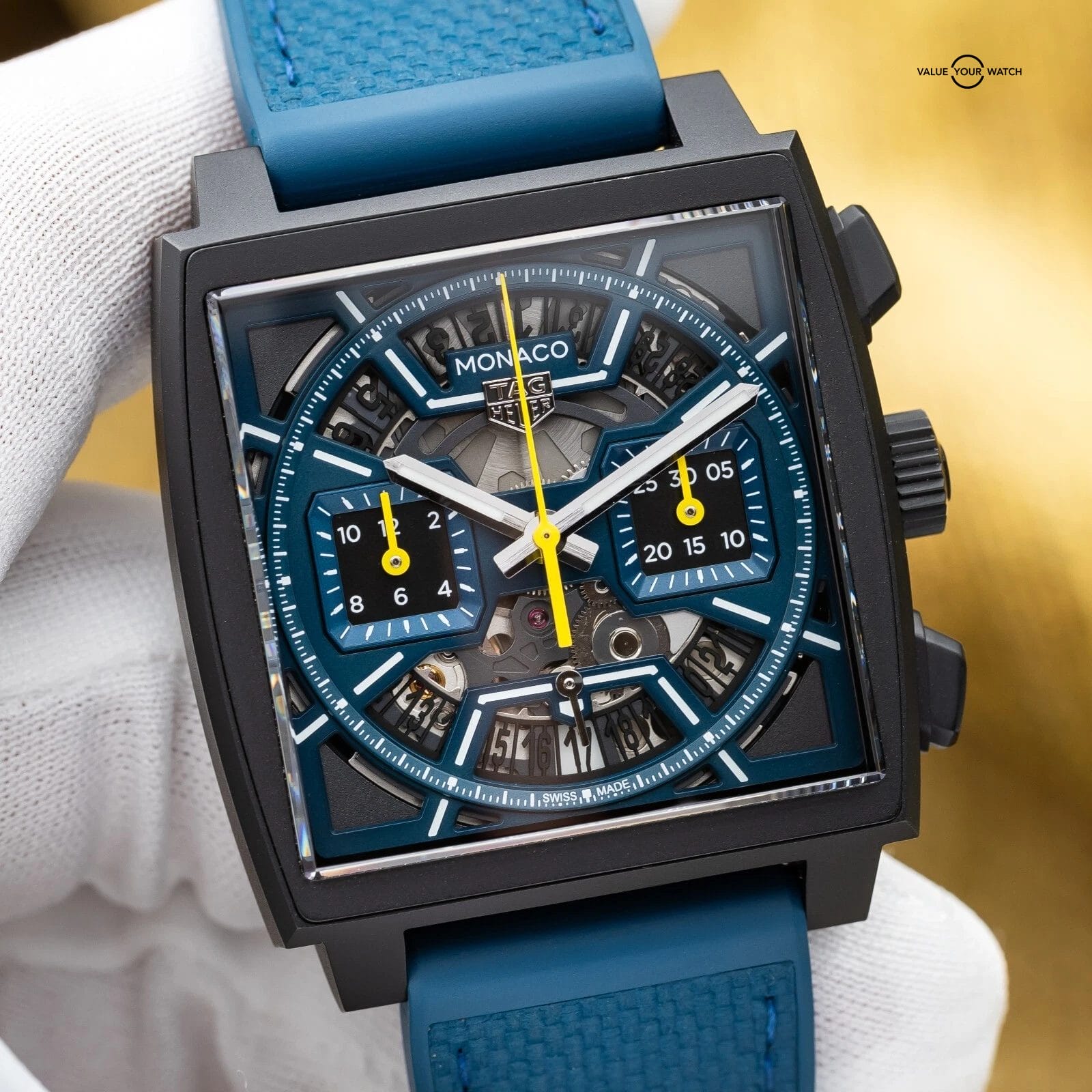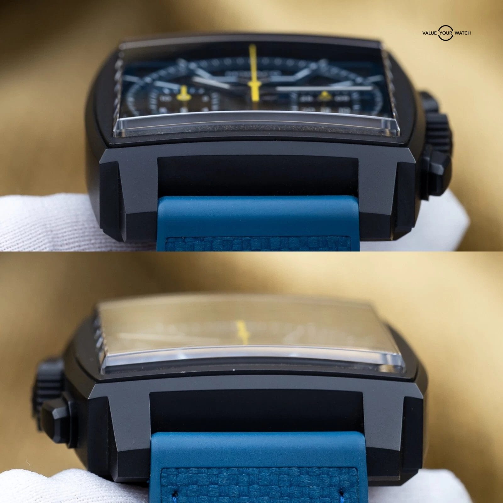 One of the most iconic chronographs ever created, the Monaco! This one in the new black DLC titanium case with the skeleton dial! The unique square dial of the Monaco was the housing for one of the first automatic chronographs ever. Today it is still the flagship of the TAG Heuer brand. This watch started its life on the wrists of the famed drivers of Formula 1 in the late 60’s and early 70’s. This variant is a modern reinterpretation of the iconic design, bound to turn heads!