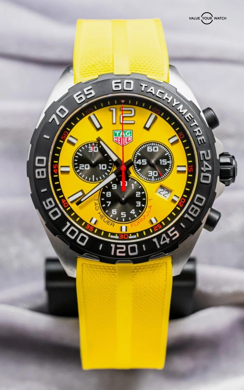 “Resolutely inspired by the brisk energy of motor racing, this TAG Heuer Formula 1 associates a vibrant yellow sunray brushed dial with racing-ready chronograph counters and bold dial details. Designed for those who thrive on speed-driven adrenaline… Get ready for the rush with the fresh and energetic TAG Heuer Formula 1. With a high-contrast dial and a high-quality rubber strap, this fearless performer is ready for the fast lane. Make no mistake, it’s built to handle life’s thrills and spills.”