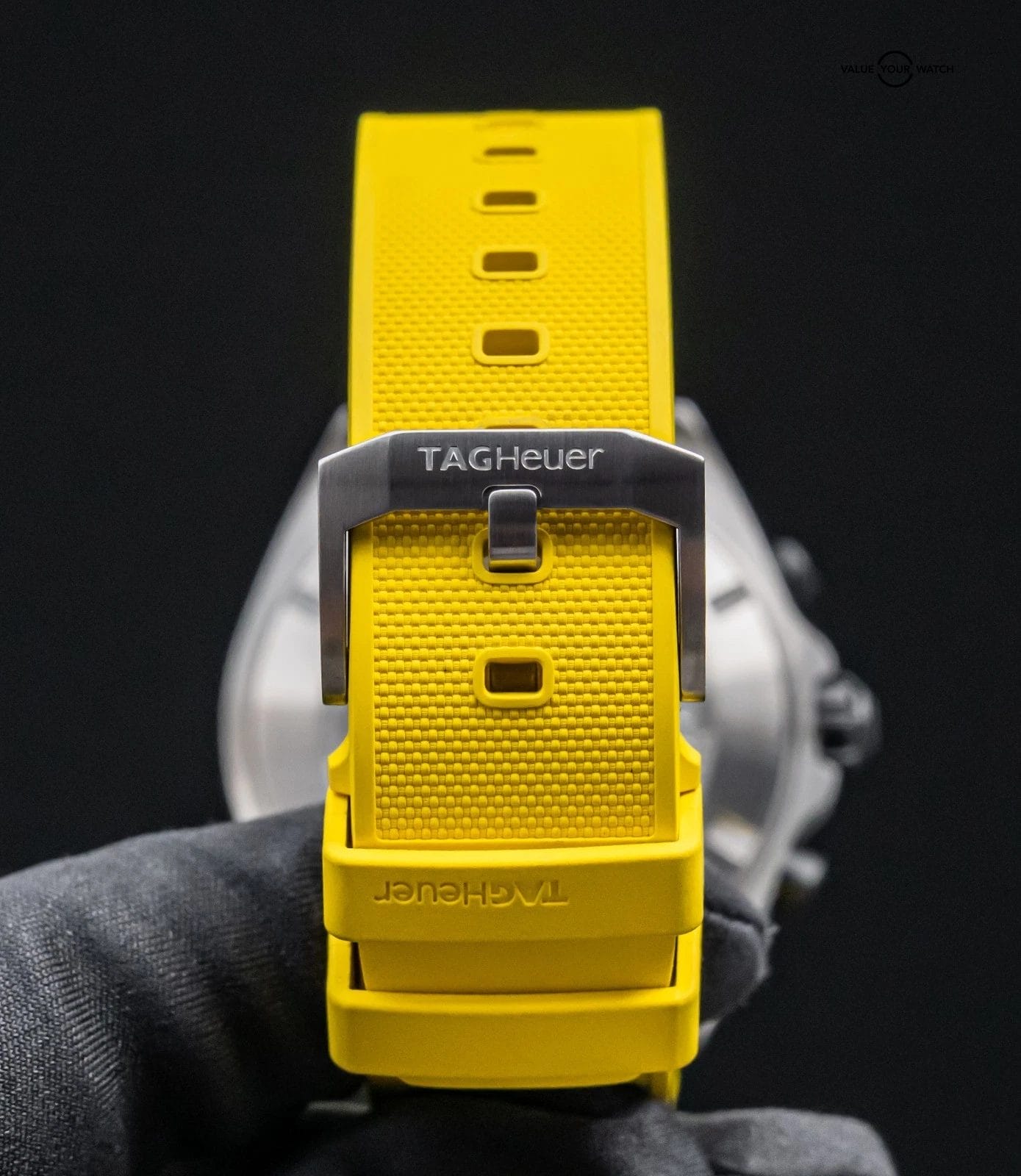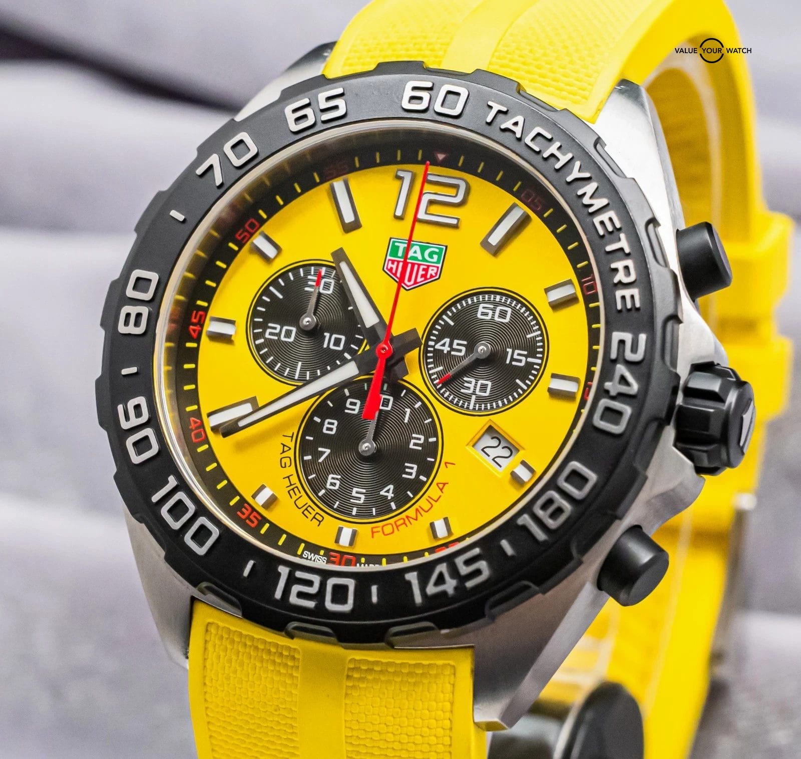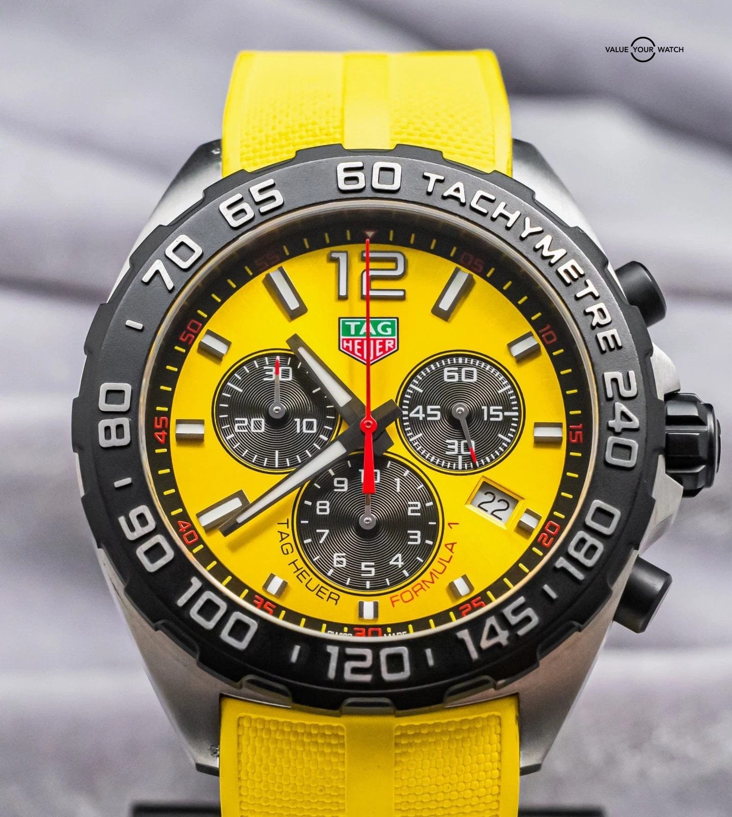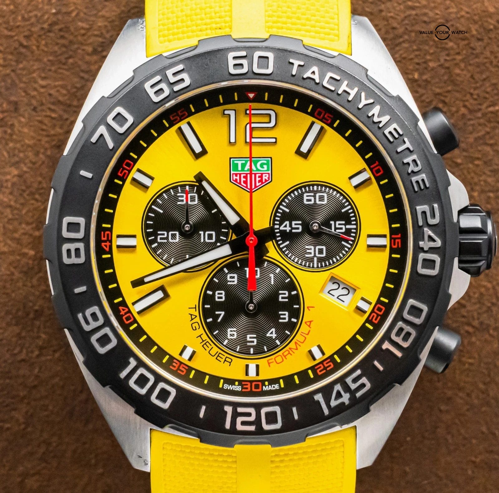 STUNNING Tag Heuer Formula 1 Chronograph Quartz Men’s 43 mm with Yellow Sunray Radiant Brushed Dial on Yellow Tag Heuer Rubber! Arrives as a complete set with the original Tag Heuer boxes and papers including the warranty card & manual from the original purchase at a Tag Heuer Authorized Dealer. This is a solid everyday Tag Heuer to add to any collection, quite iconic and sporty with the Yellow. Great first nice watch, gift, or another watch to add to the collection. Can’t beat it at the dollar!