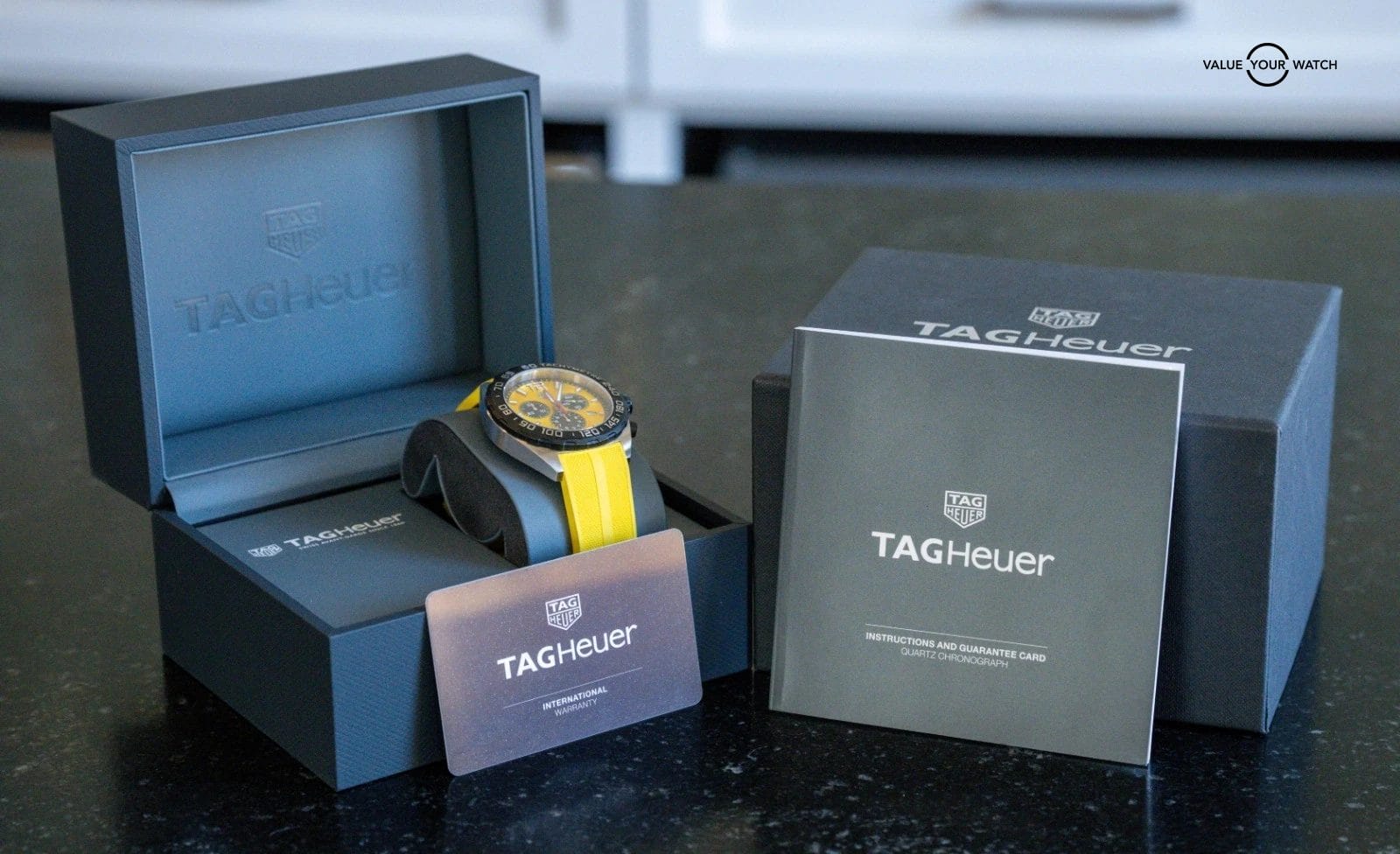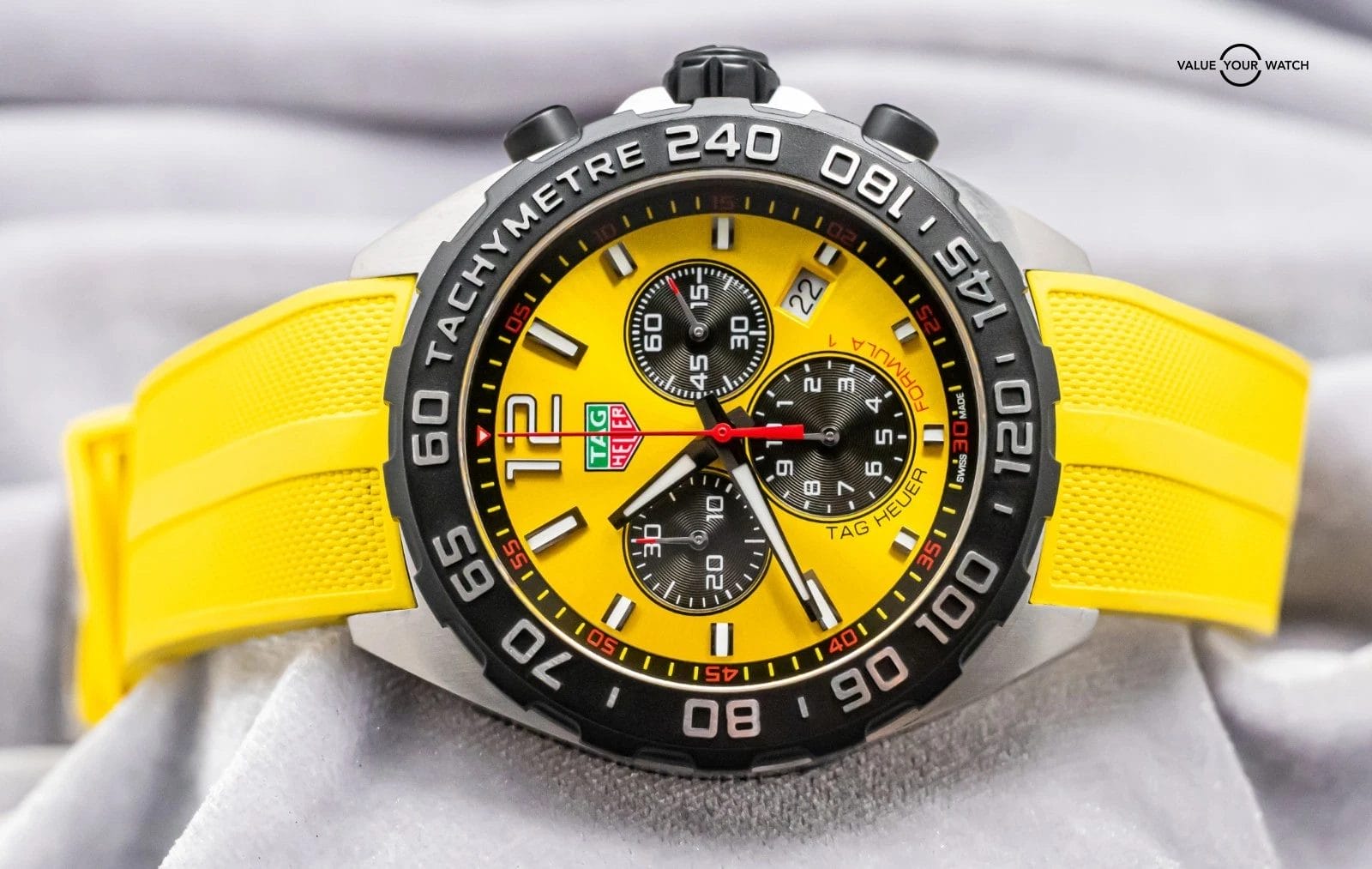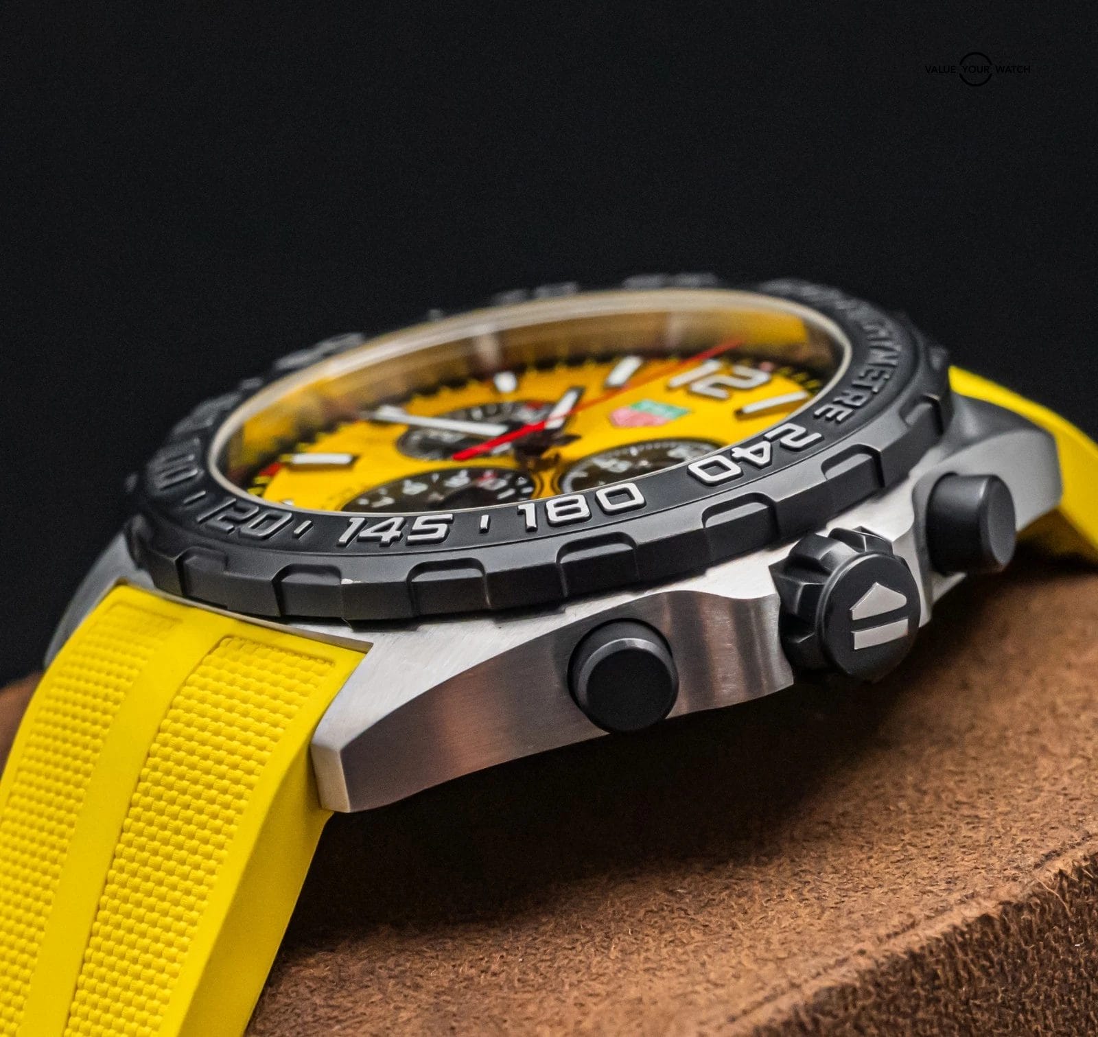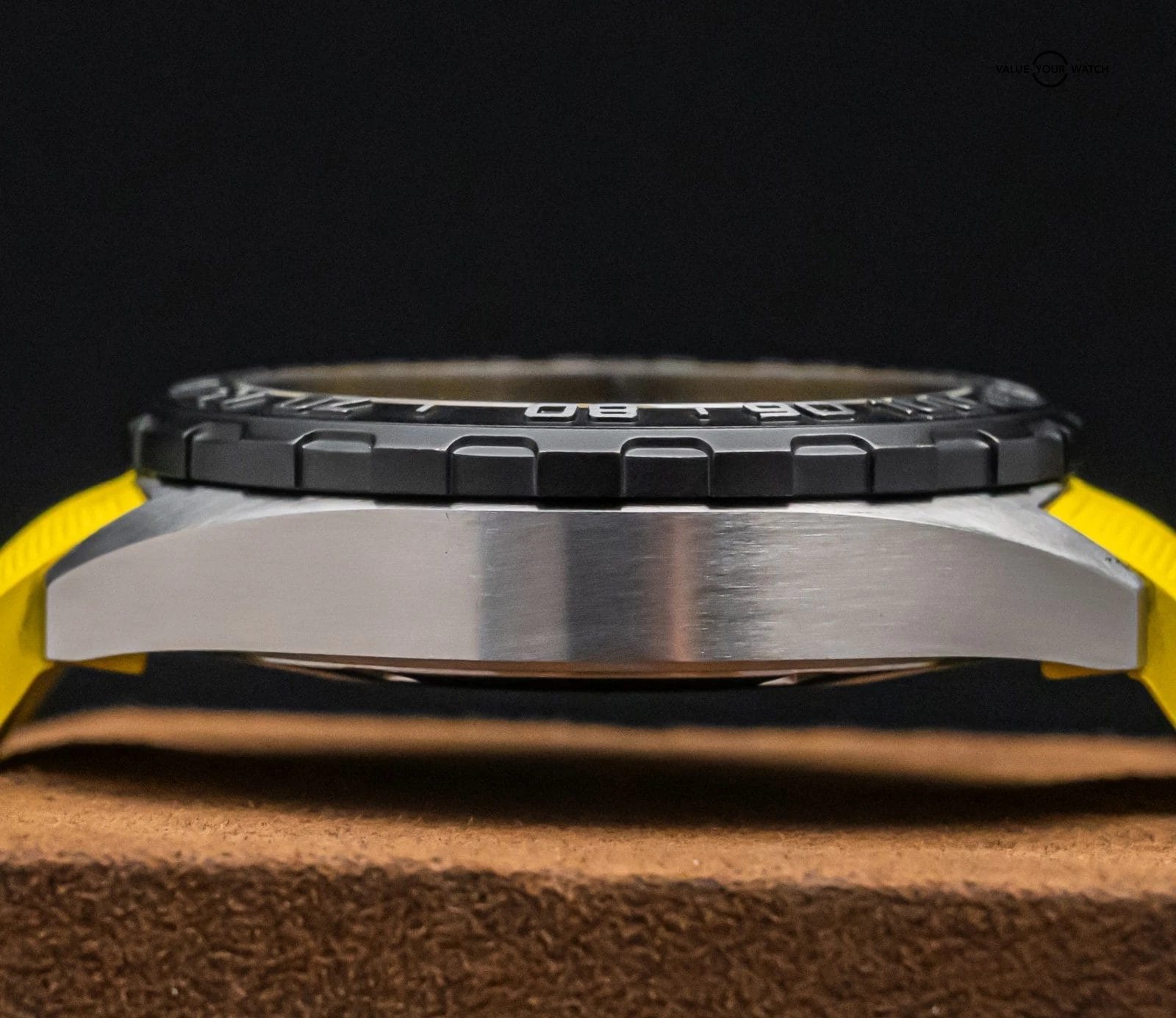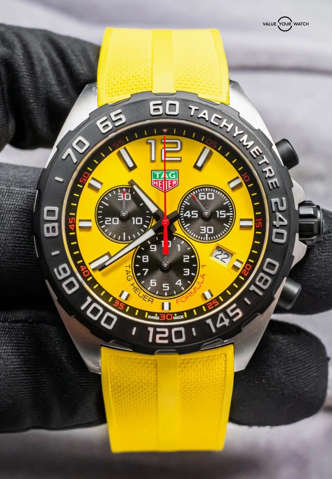 STUNNING Tag Heuer Formula 1 Chronograph Quartz Men’s 43 mm with Yellow Sunray Radiant Brushed Dial on Yellow Tag Heuer Rubber! Arrives as a complete set with the original Tag Heuer boxes and papers including the warranty card & manual from the original purchase at a Tag Heuer Authorized Dealer. This is a solid everyday Tag Heuer to add to any collection, quite iconic and sporty with the Yellow. Great first nice watch, gift, or another watch to add to the collection. Can’t beat it at the dollar!
