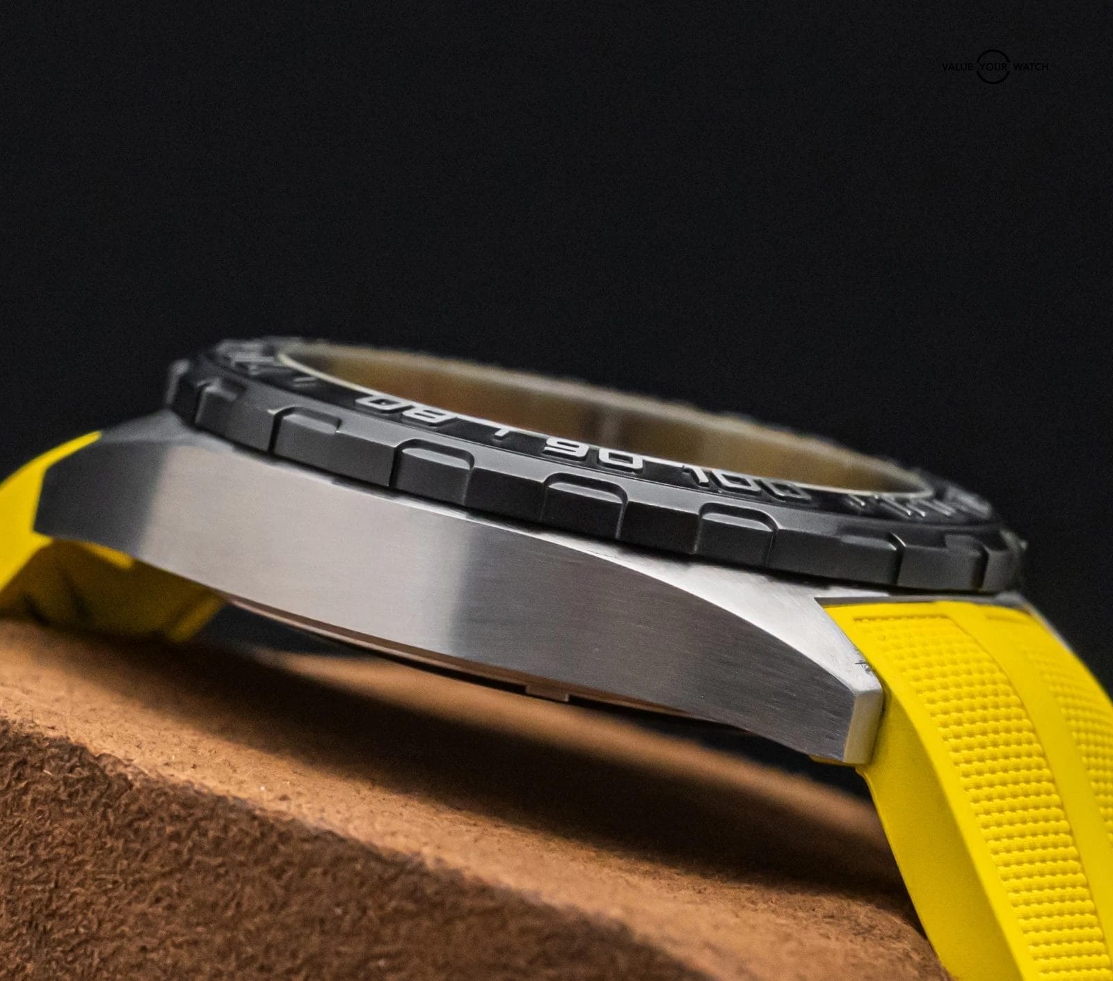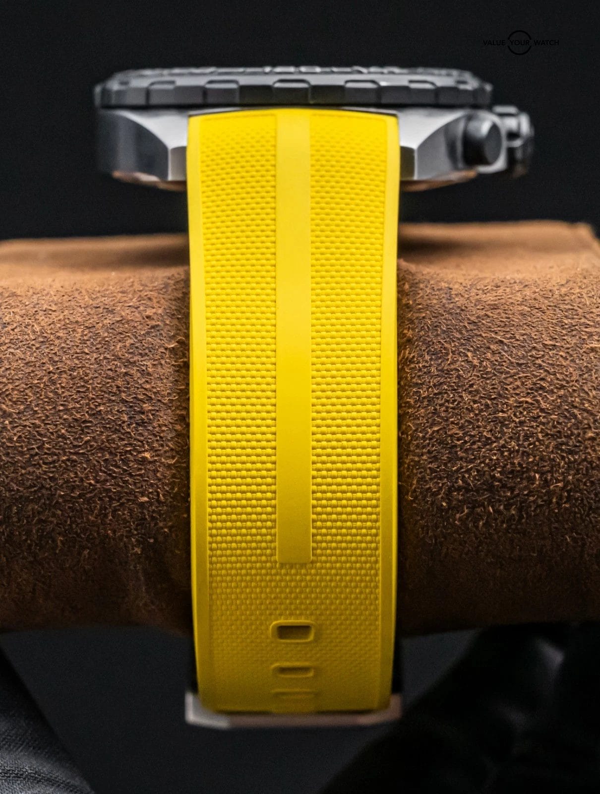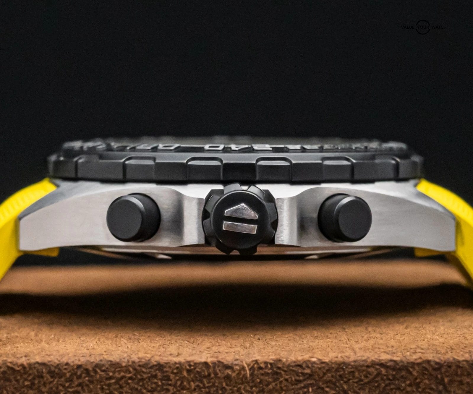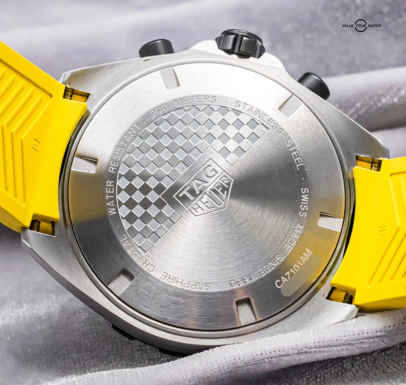STUNNING Tag Heuer Formula 1 Chronograph Quartz Men’s 43 mm with Yellow Sunray Radiant Brushed Dial on Yellow Tag Heuer Rubber! Arrives as a complete set with the original Tag Heuer boxes and papers including the warranty card & manual from the original purchase at a Tag Heuer Authorized Dealer. This is a solid everyday Tag Heuer to add to any collection, quite iconic and sporty with the Yellow. Great first nice watch, gift, or another watch to add to the collection. Can’t beat it at the dollar!