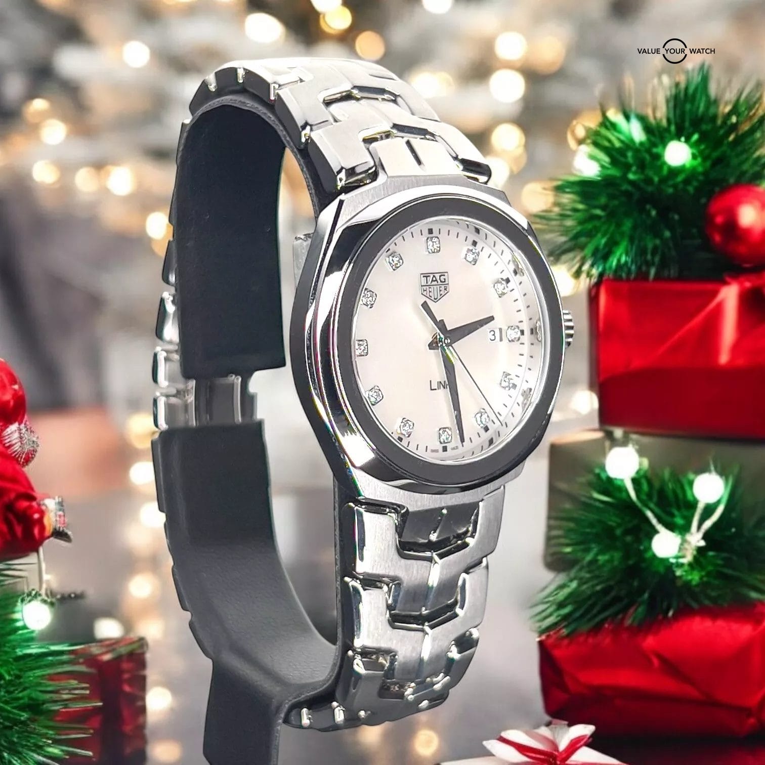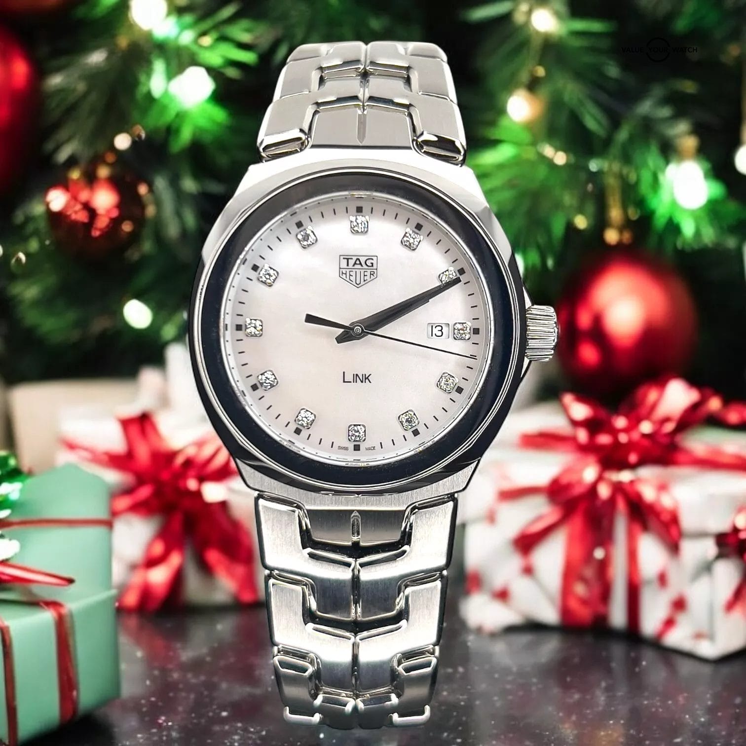 The TAG Heuer Link Lady WBC1312.BA0600 features a 32mm steel case with a matching smooth bezel. The Mother of Pearl dial is elegant and classy and is adorned with sparkling diamond hour markers and silver-toned hands, for a clean and exquisite look. It also showcases a date window at 3 o’clock. This piece is completed with the iconic Tag Heuer Link matching steel bracelet and a folding clasp. Add this Beautiful Link Lady to your collection today.