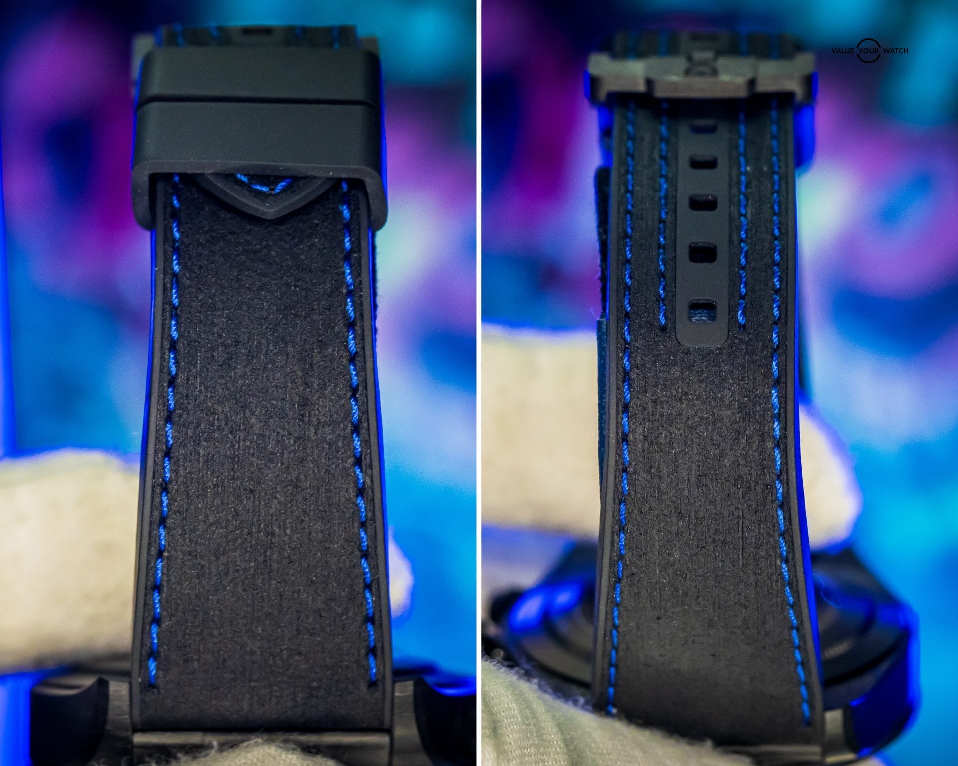 - Bracelet – Hybrid leather-rubber strap with “tire pattern”
