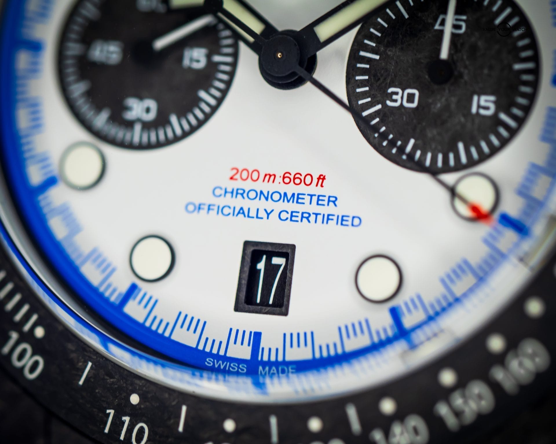• Motorsport Design Language – White dial with blue accents inspired by the 2025 Racing Bulls Formula One livery