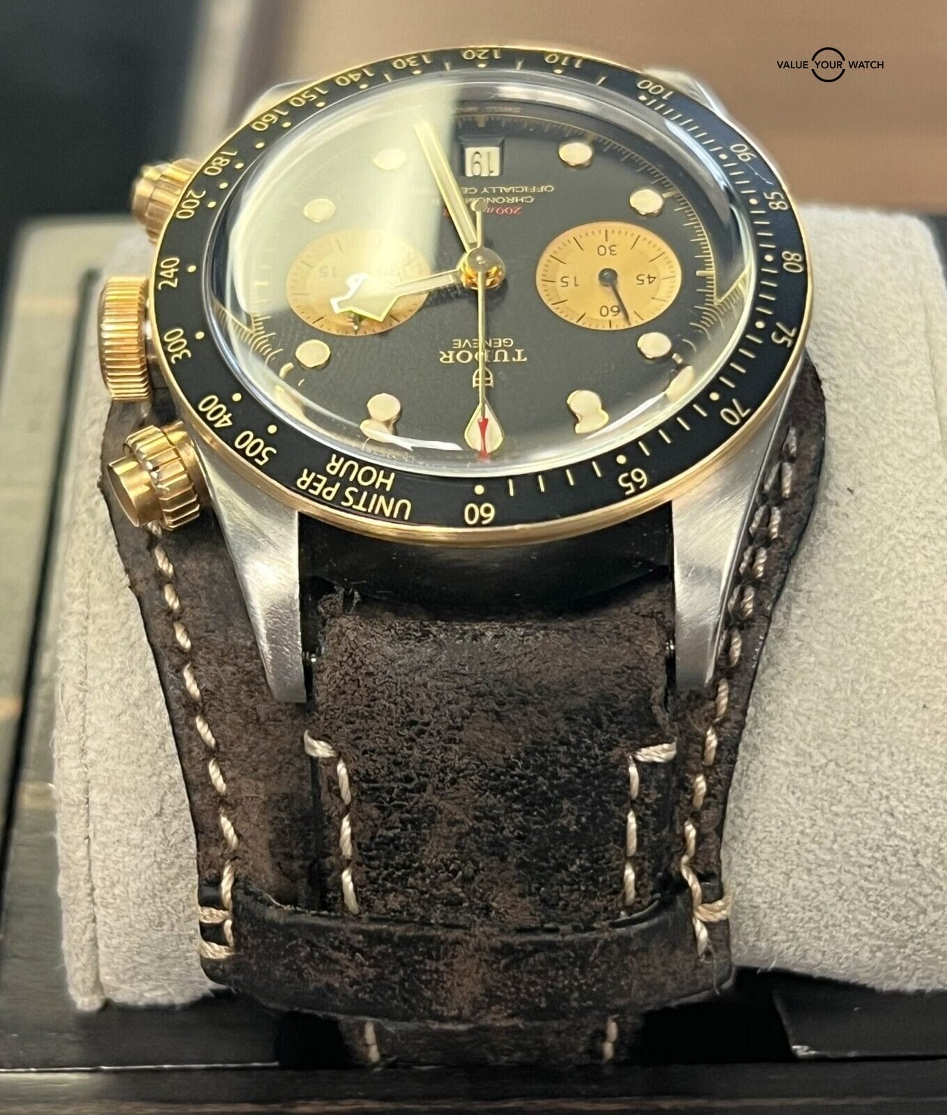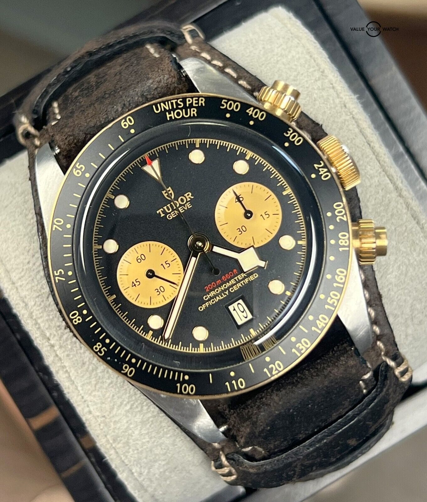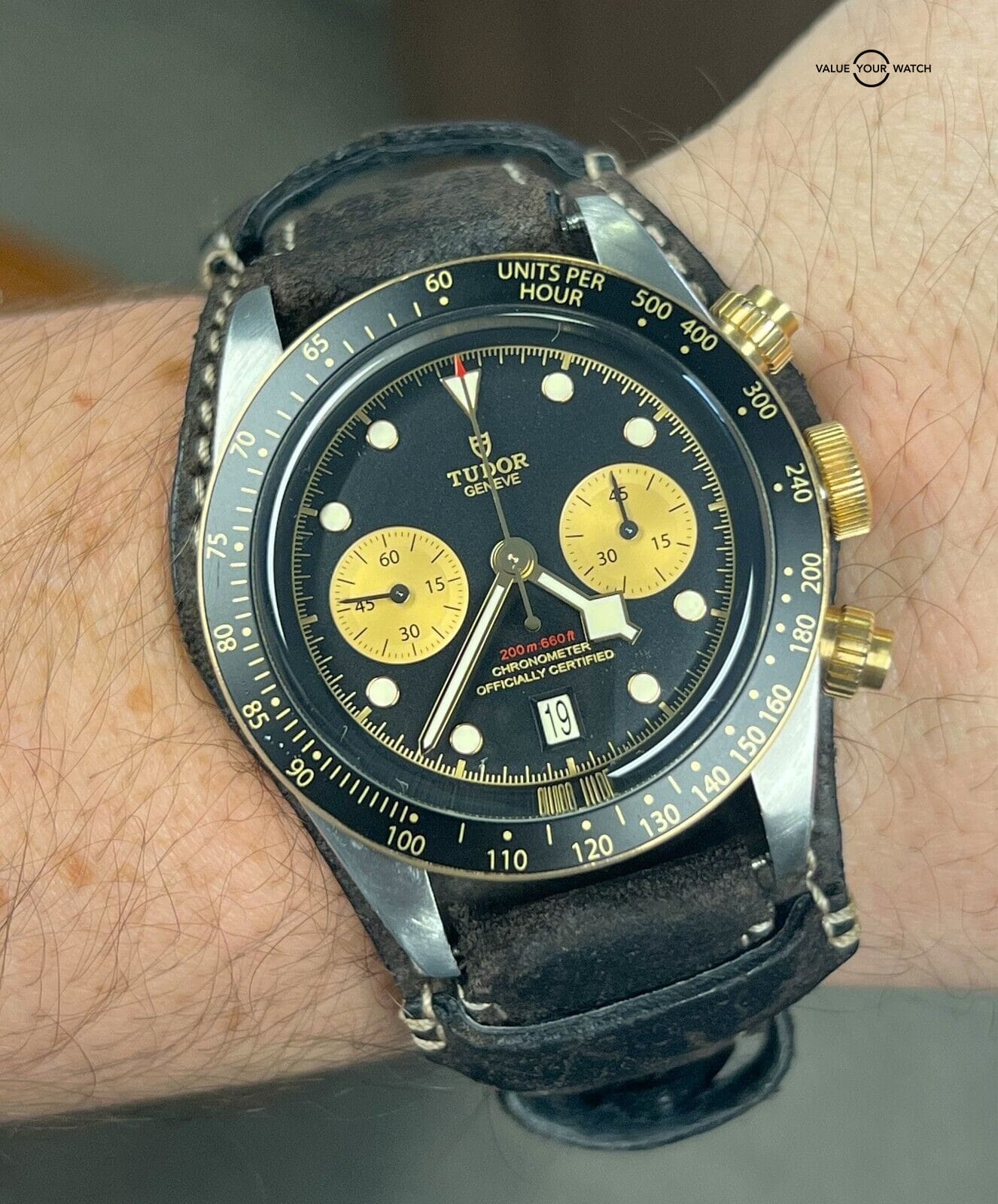 Bezel: Fixed Yellow Gold with Black Aluminum Disc with tachymetric scale