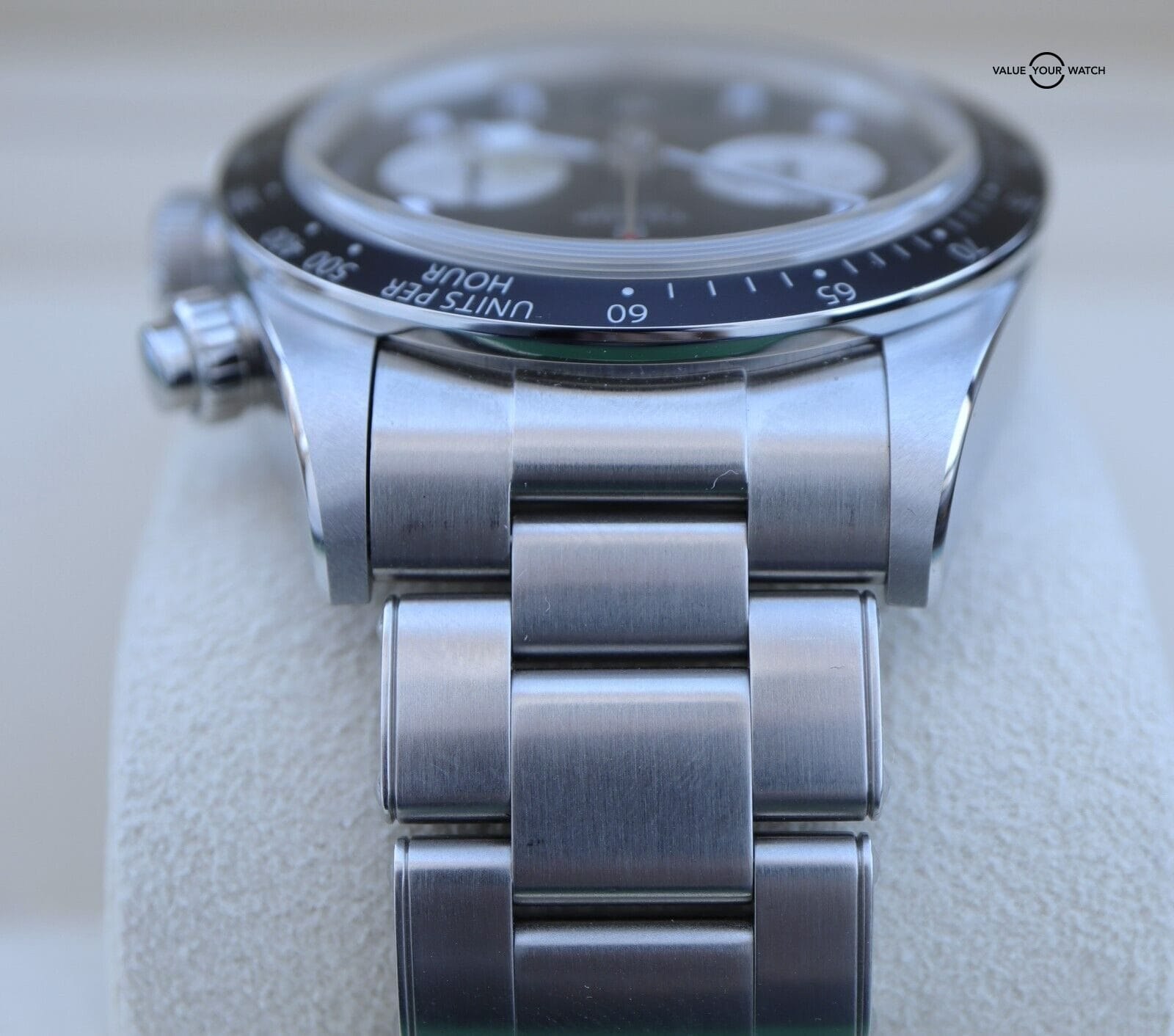 - Bezel: Fixed Stainless Steel with tachymetric scale with aluminum disc