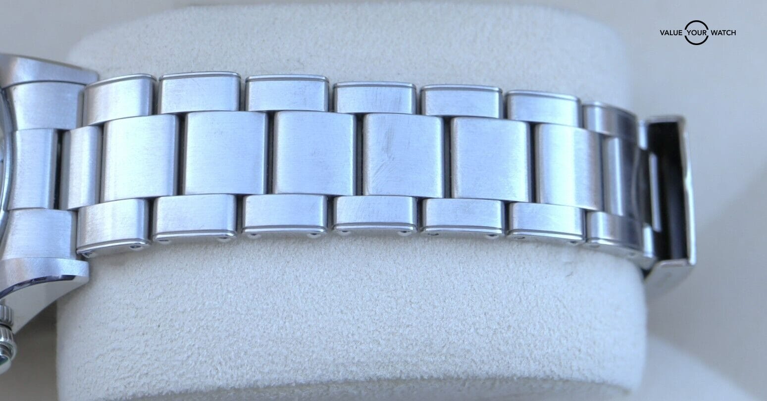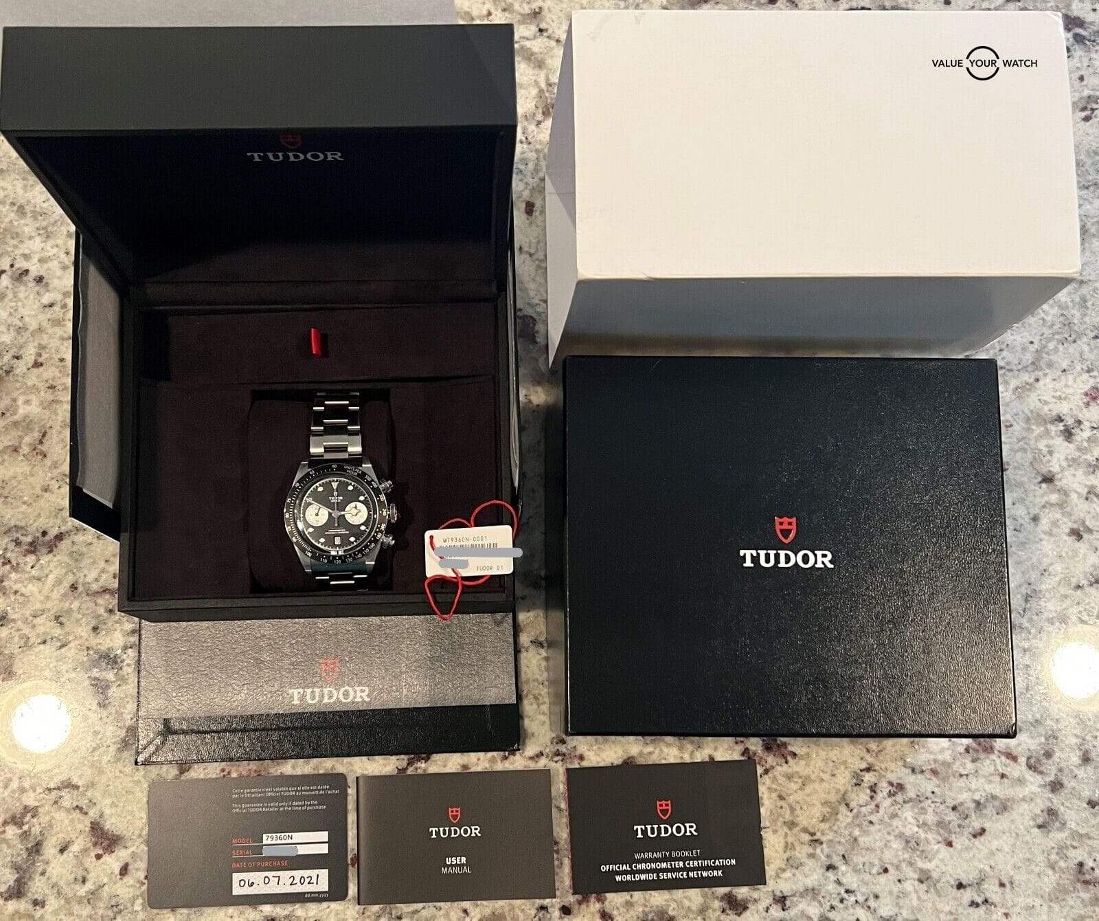 This set comes complete with the outer white sleeve, outer black box, inner black box, booklets, matching serial hangtag, and original warranty card (Dated July 2021). The watch is in brand new condition and has a few light handling marks from the AD. It comes fitted with all the links and will accommodate up to a 8.25” wrist. Mechanically the watch is functioning as it should. Serial numbers & names are blurred in photos only for privacy reasons.