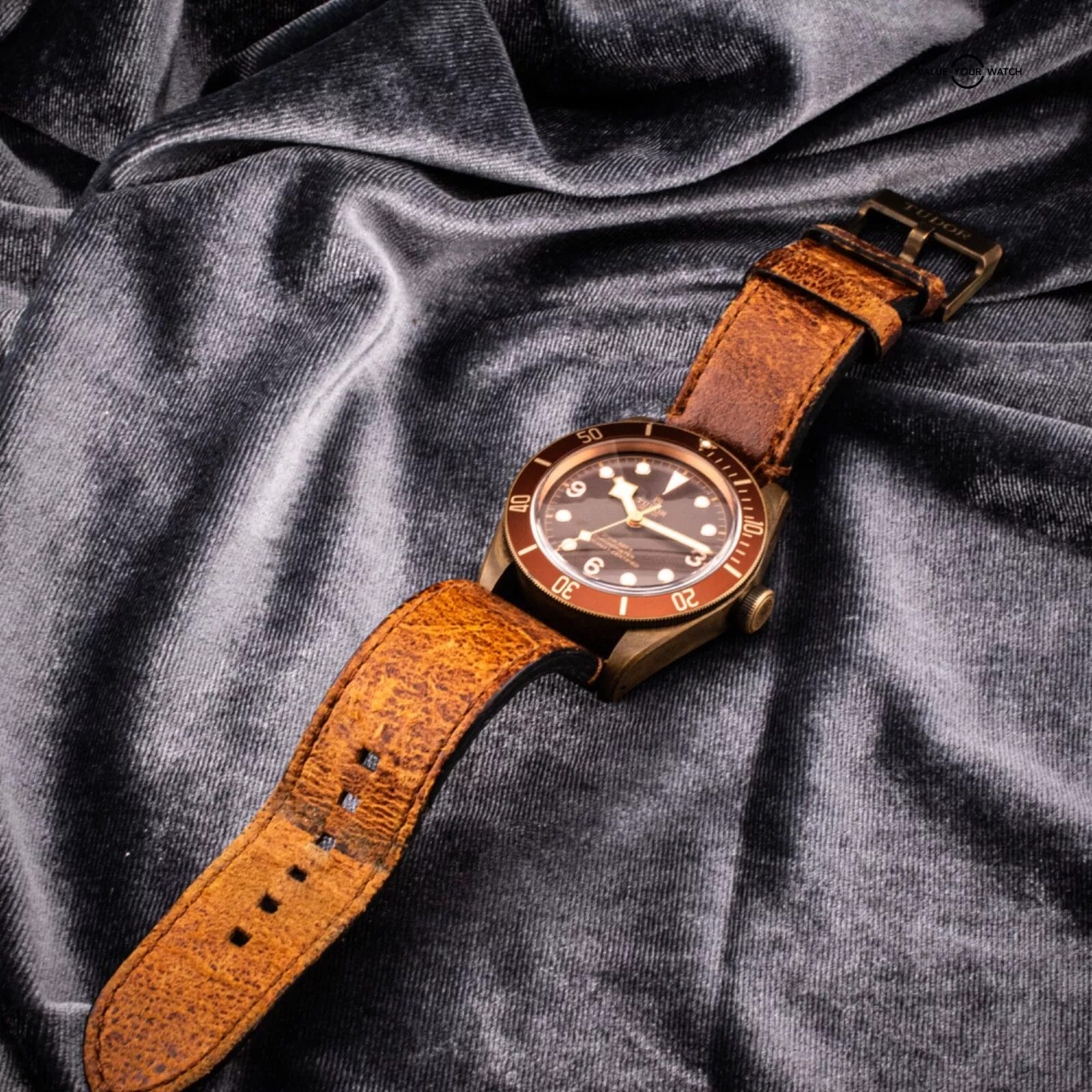 Strap: Brown Aged Leather Strap with Bronze Buckle
