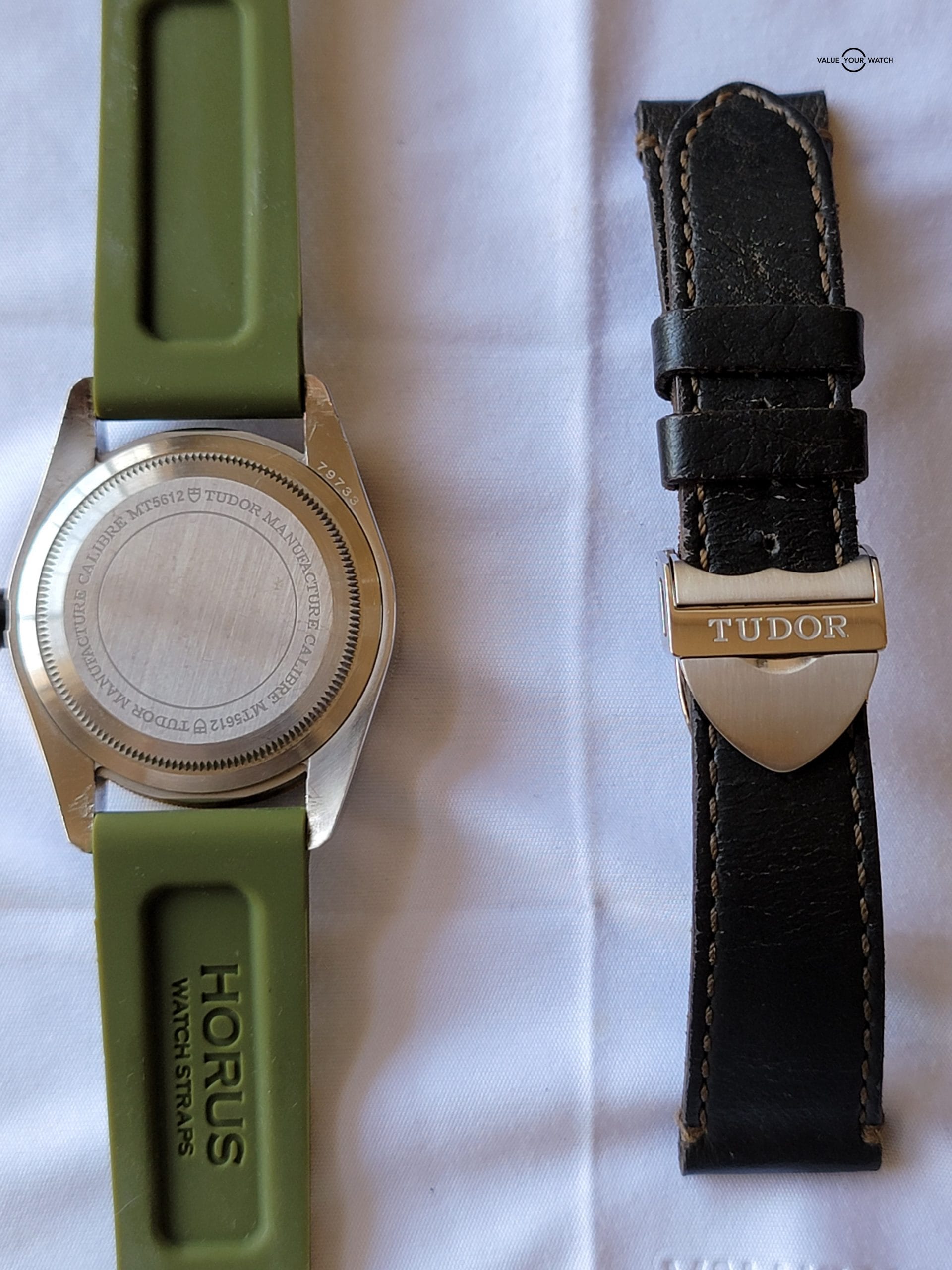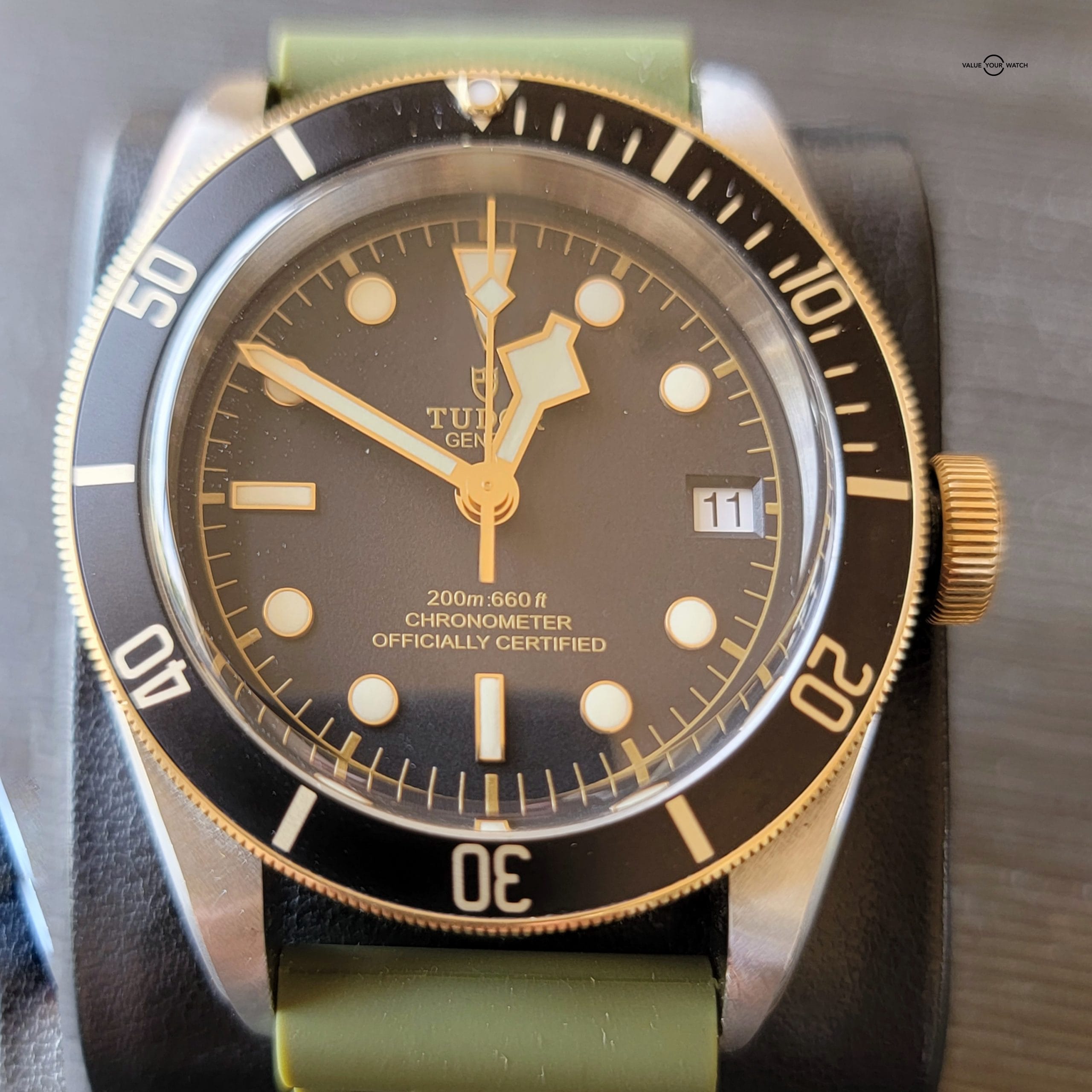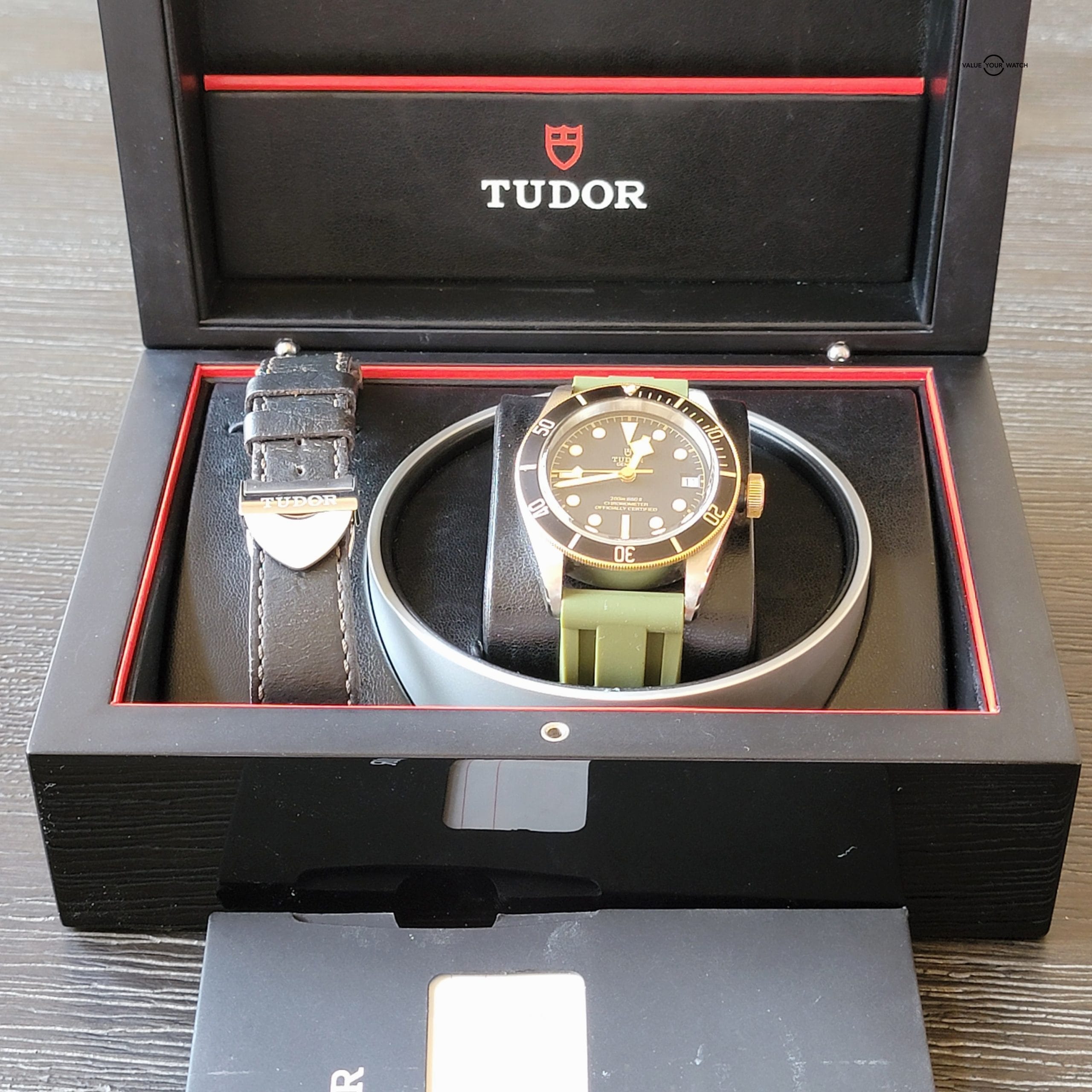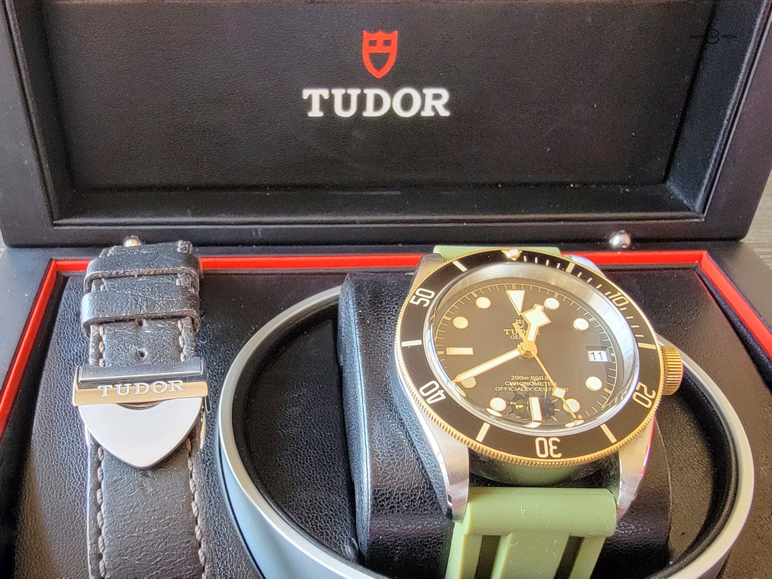 For your considerations is this beautiful Tudor Black Bay. 41mm steel case with satin finish. Unidirectional rotating bezel with Bronze with 60 minute graduated matte black anodized aluminum disc and gold markings. It comes with Tudor leather strap, buckle and Horus olive strap. Black domed dial. Yellow gold screw-down winding crown with Tudor rose engraved and lacquered in black and black anodized aluminum winding crown tube. Dome sapphire crystal and waterproof to 200m (600 ft). There are some scratches on the lug from changing straps that can easily be removed with a polish.