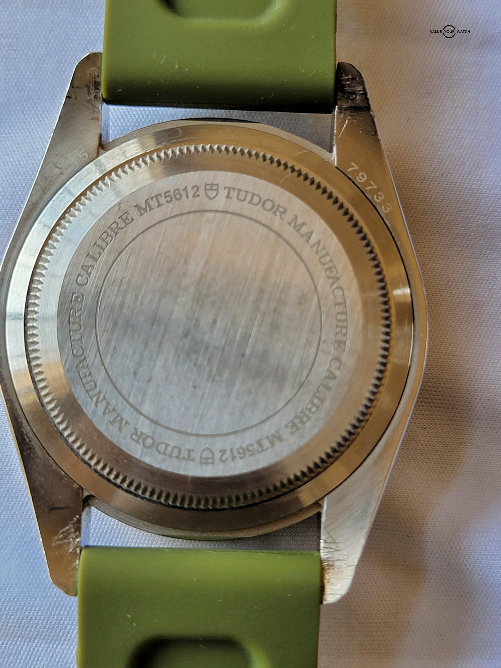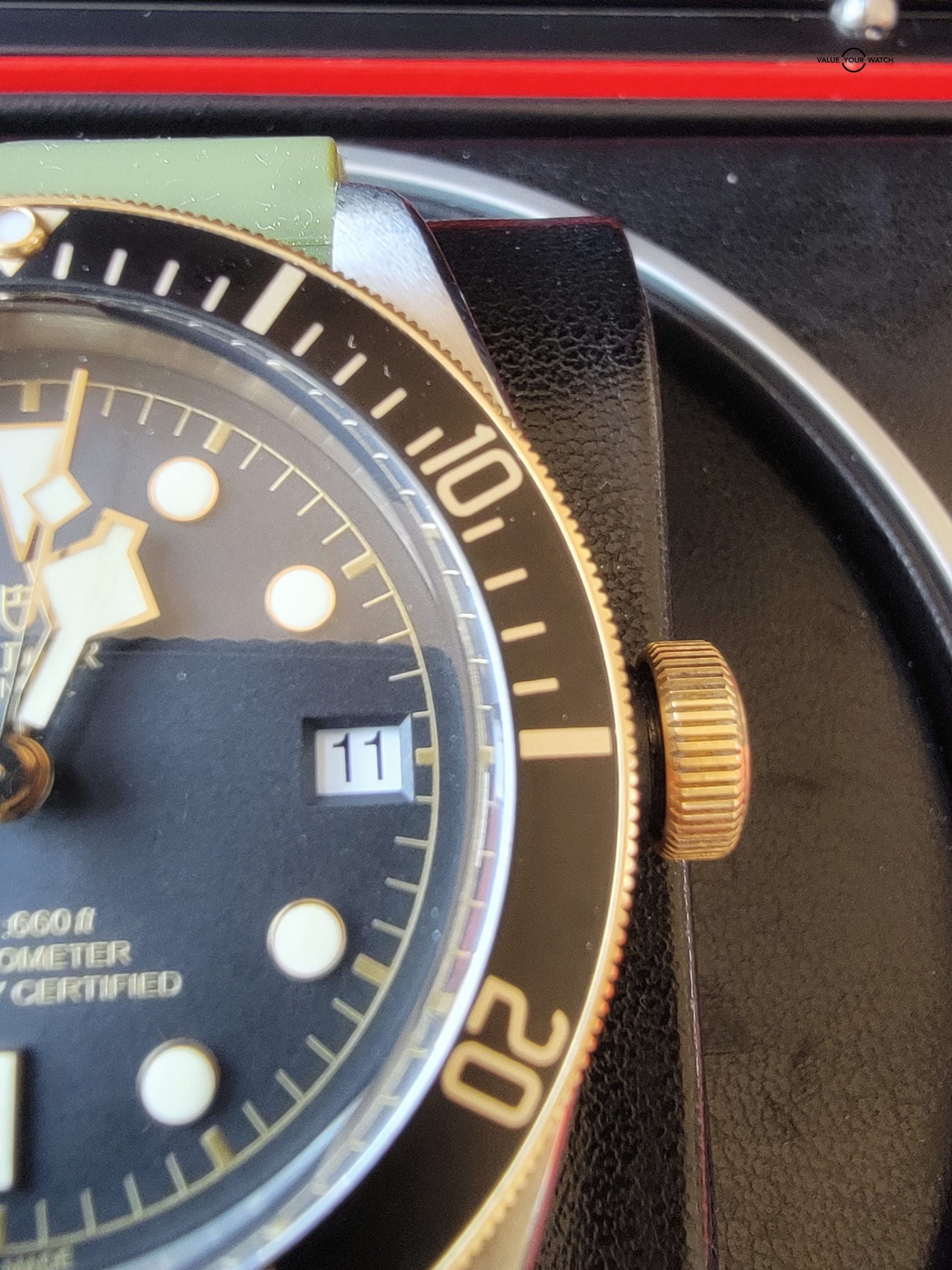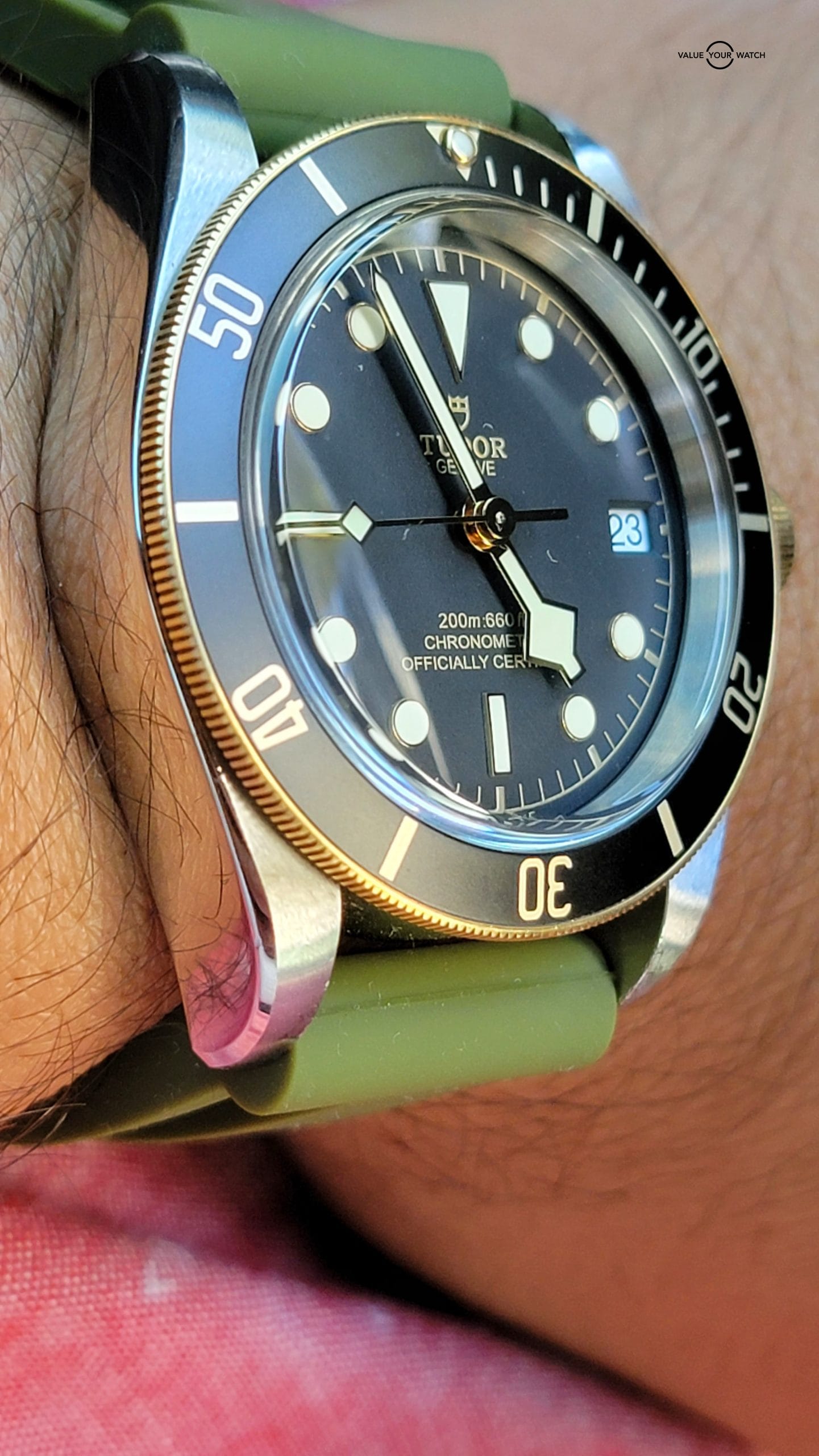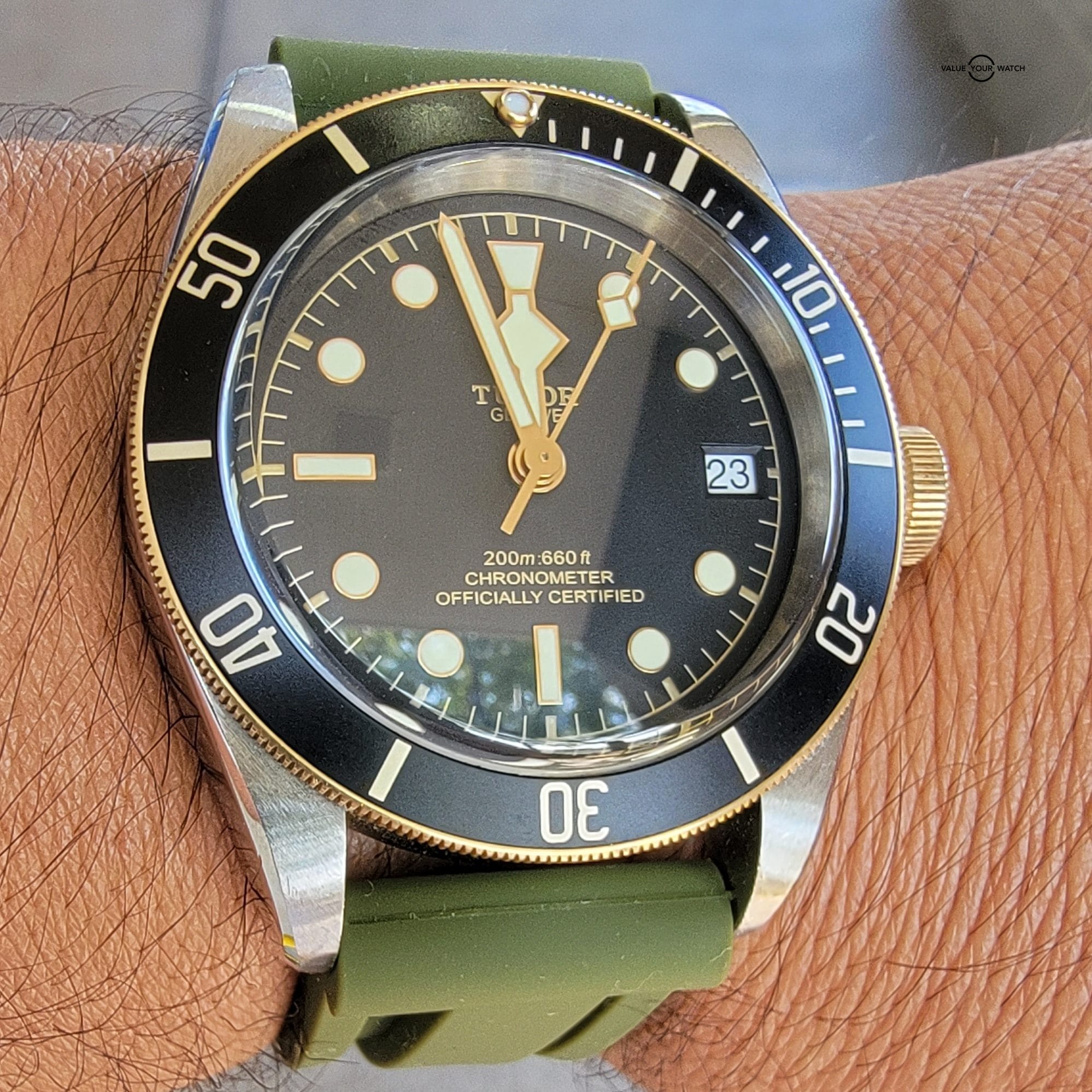 For your considerations is this beautiful Tudor Black Bay. 41mm steel case with satin finish. Unidirectional rotating bezel with Bronze with 60 minute graduated matte black anodized aluminum disc and gold markings. It comes with Tudor leather strap, buckle and Horus olive strap. Black domed dial. Yellow gold screw-down winding crown with Tudor rose engraved and lacquered in black and black anodized aluminum winding crown tube. Dome sapphire crystal and waterproof to 200m (600 ft). There are some scratches on the lug from changing straps that can easily be removed with a polish.