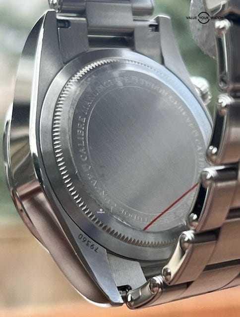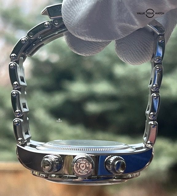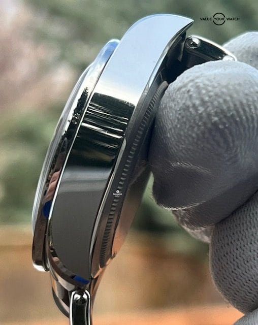 There is one shallow scratch on the side of the top right lug as seen in the pictures. Could easily be polished out if desired. Otherwise, the slightest of hairline scratches on the case, bracelet and clasp are seen as consistent with very little wear. Sapphire crystal and bezel are mint. Caseback looks mint w/ the original protective sticker intact. Overall in excellent cosmetic and functional condition.