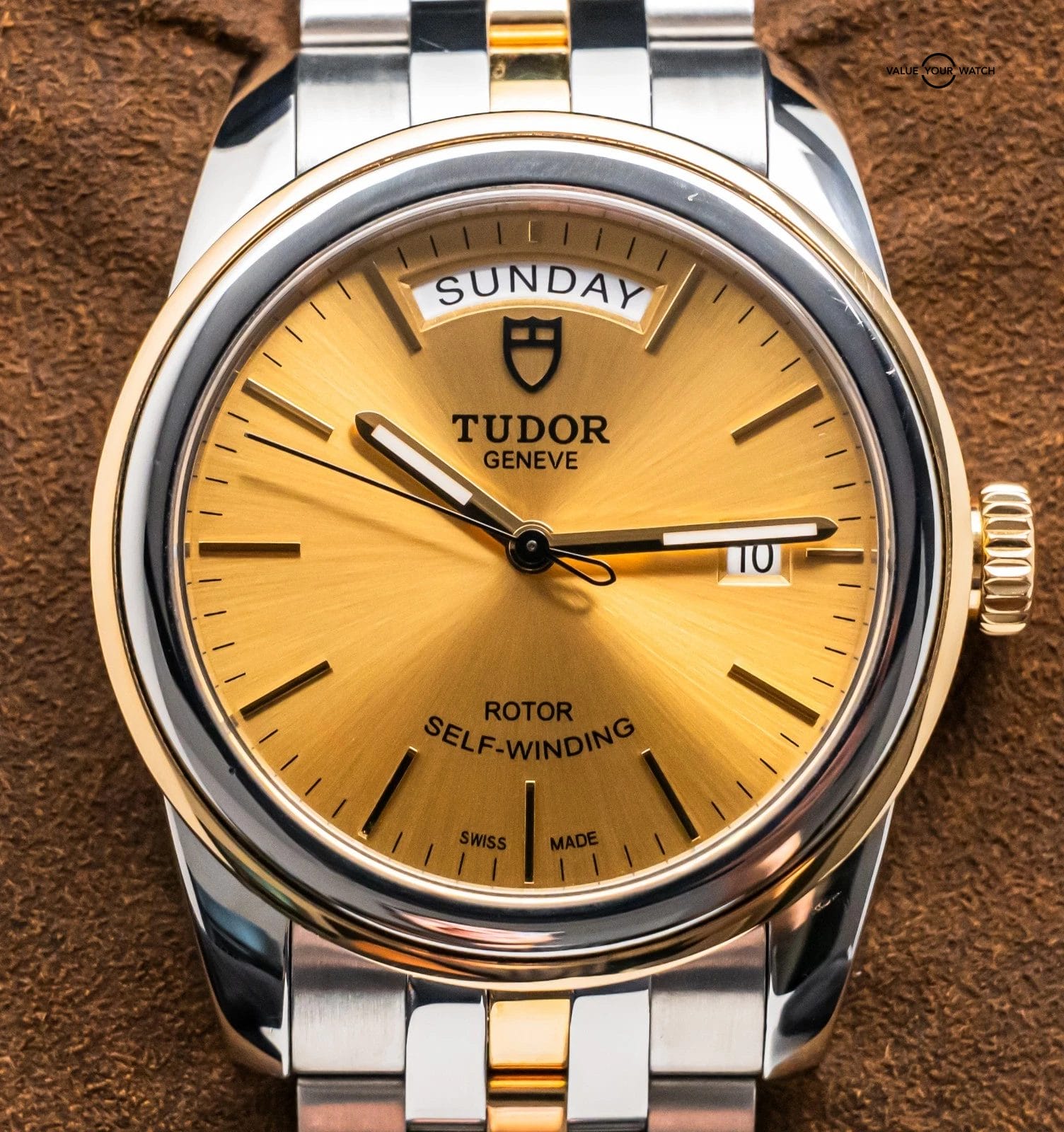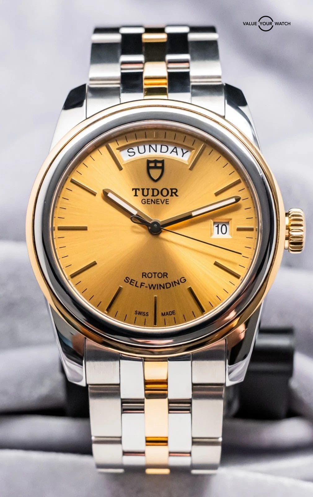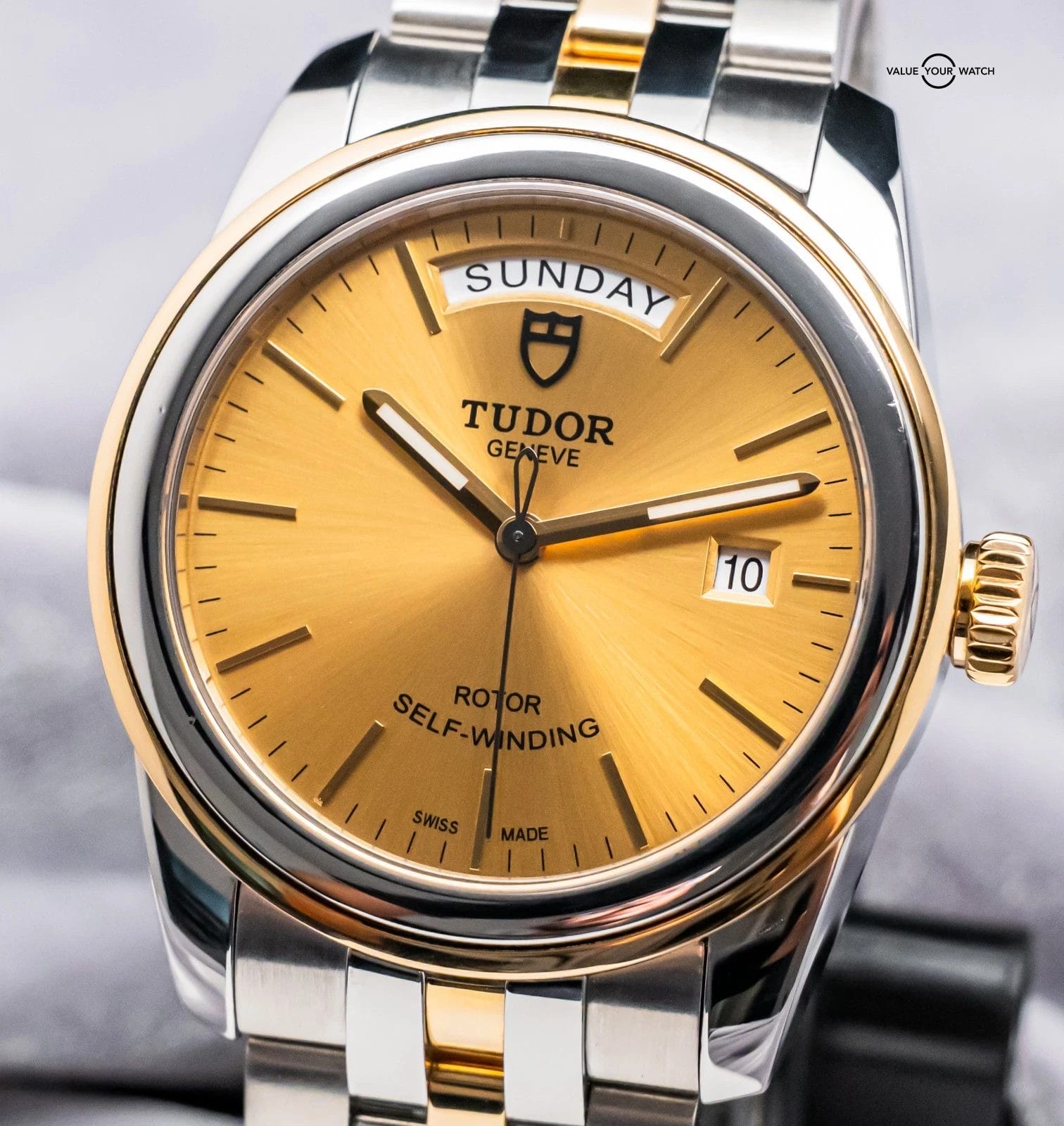 STUNNING Tudor Glamour Day & Date 39 mm in Stainless Steel & 18K Yellow Gold on Champagne/Gold Dial and Two-Tone 18K Yellow Gold & Stainless Steel Bracelet! Arrives as watch only and at a very attractive price point for a solid two-tone piece. Ready to be on wrist!
