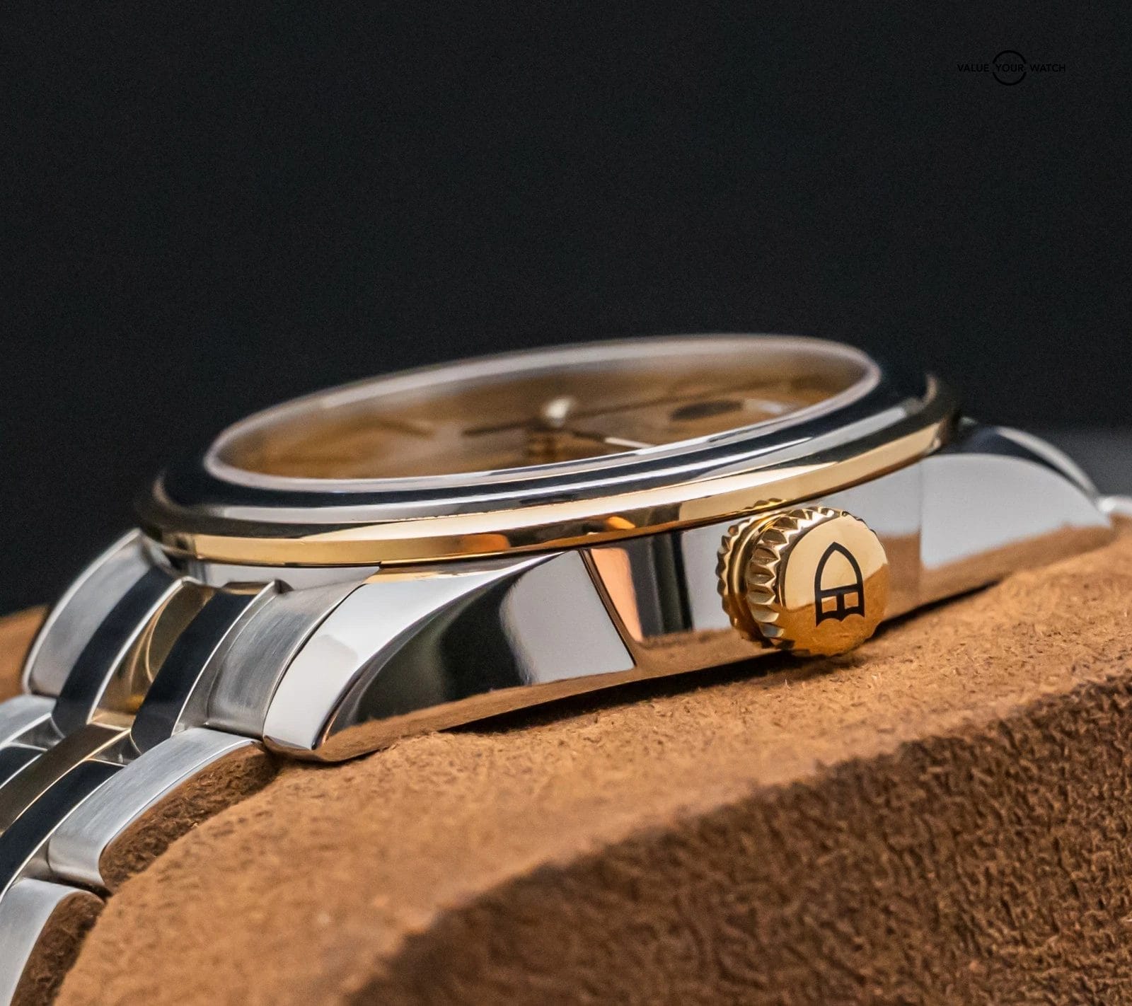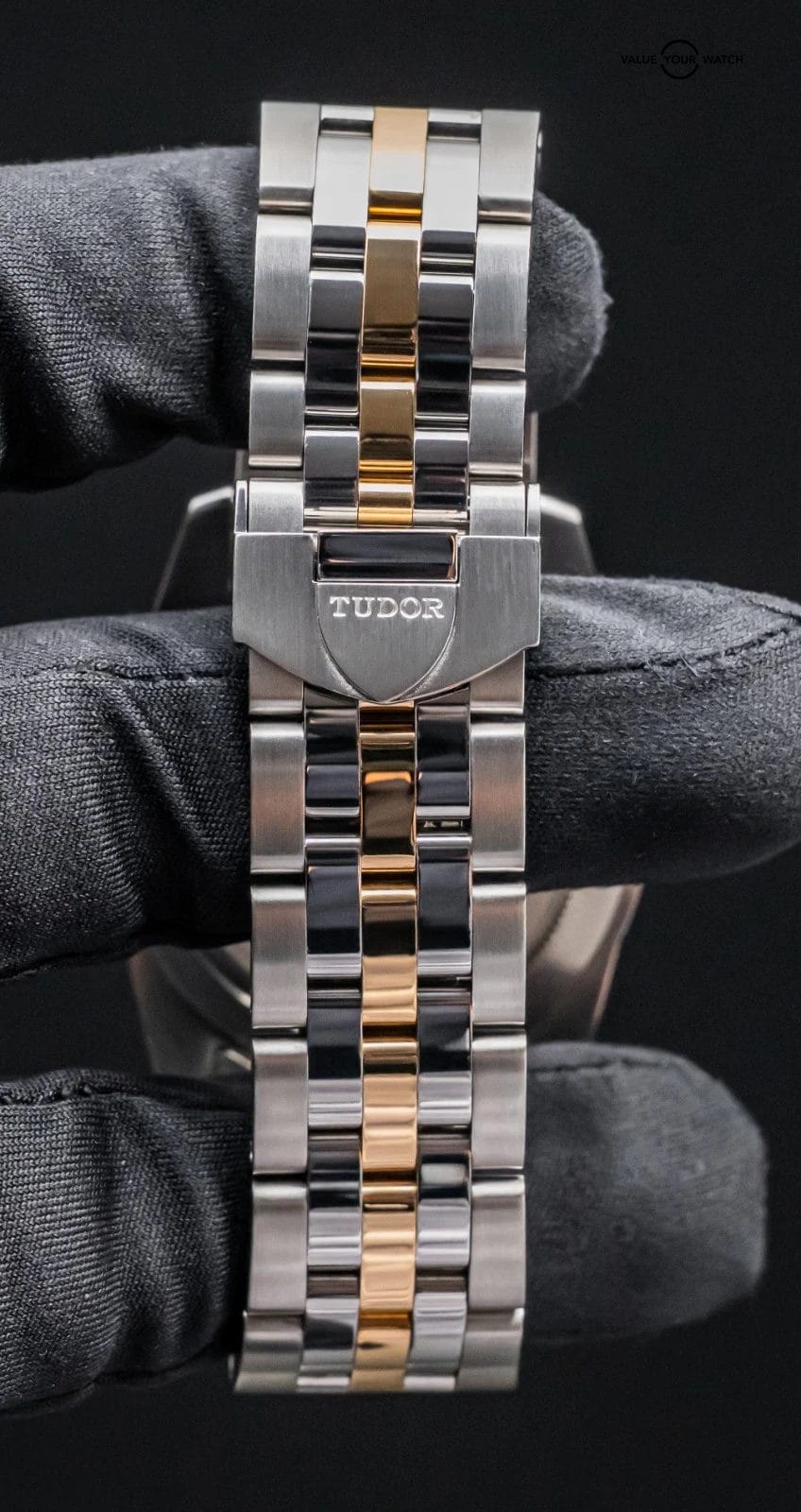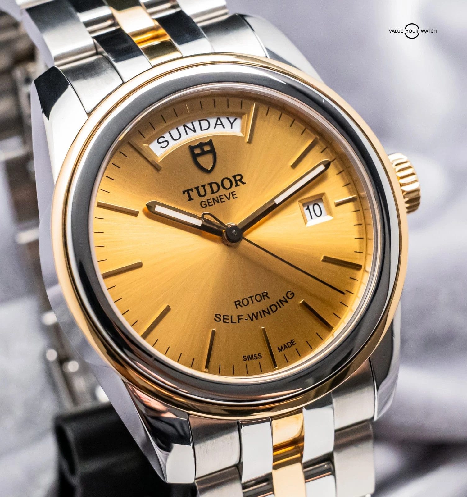 STUNNING Tudor Glamour Day & Date 39 mm in Stainless Steel & 18K Yellow Gold on Champagne/Gold Dial and Two-Tone 18K Yellow Gold & Stainless Steel Bracelet! Arrives as watch only and at a very attractive price point for a solid two-tone piece. Ready to be on wrist!