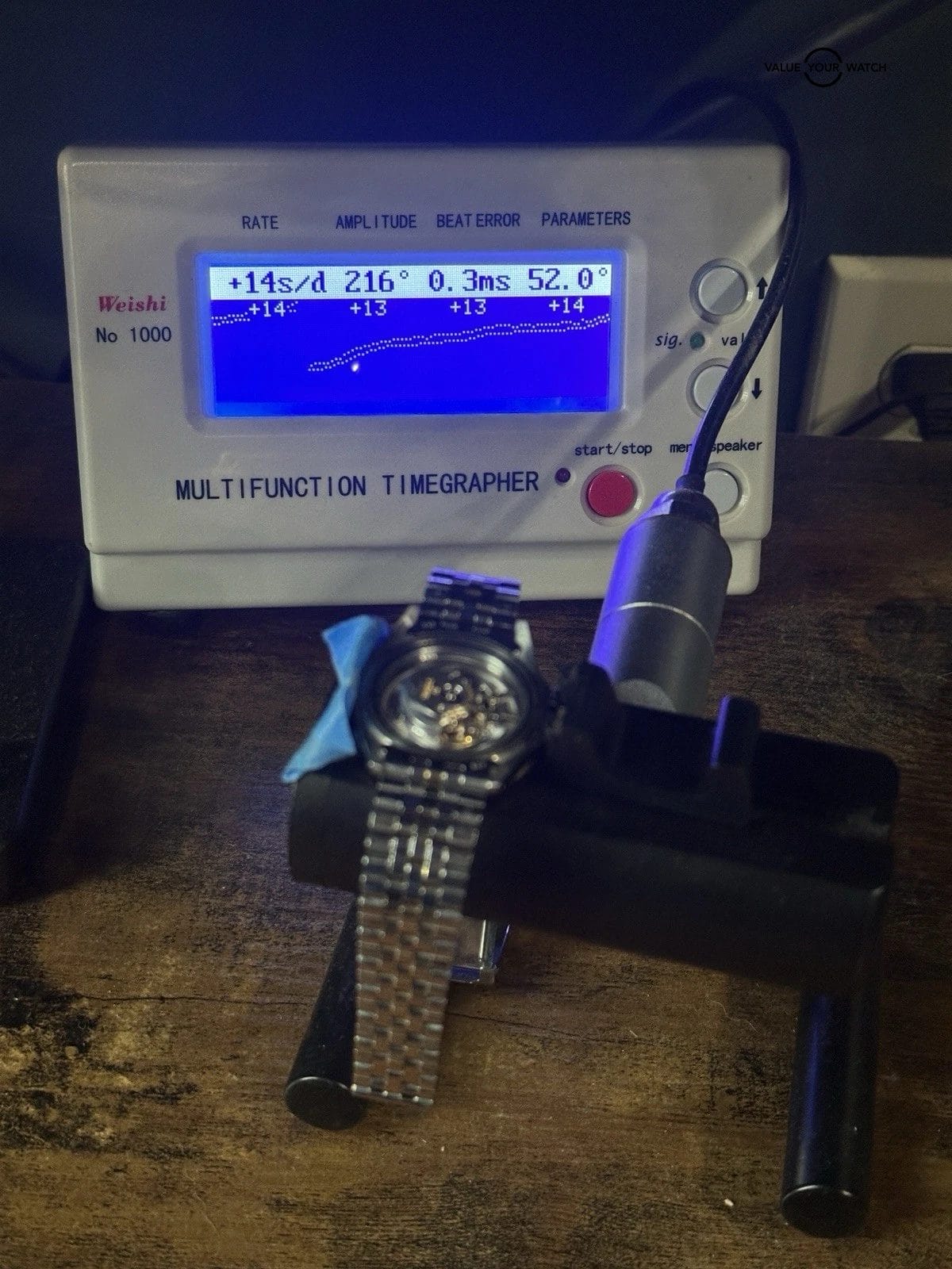 – Case is sharp and bracelet is fairly tight. Crystal has scratches. Dial looks clean. Bezel has light marks but no chips. Movement is running — specs pictured below. See pics overall nice example.