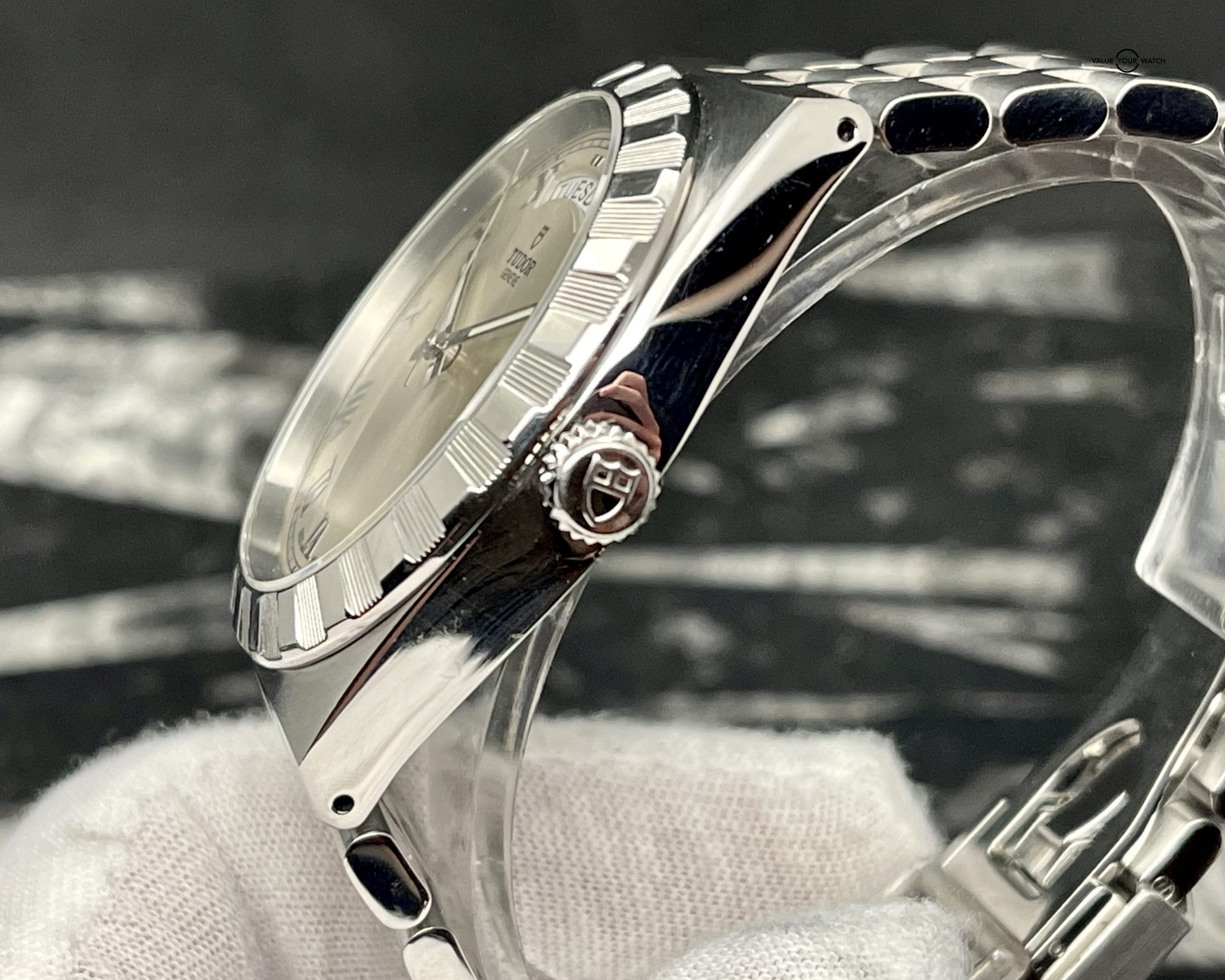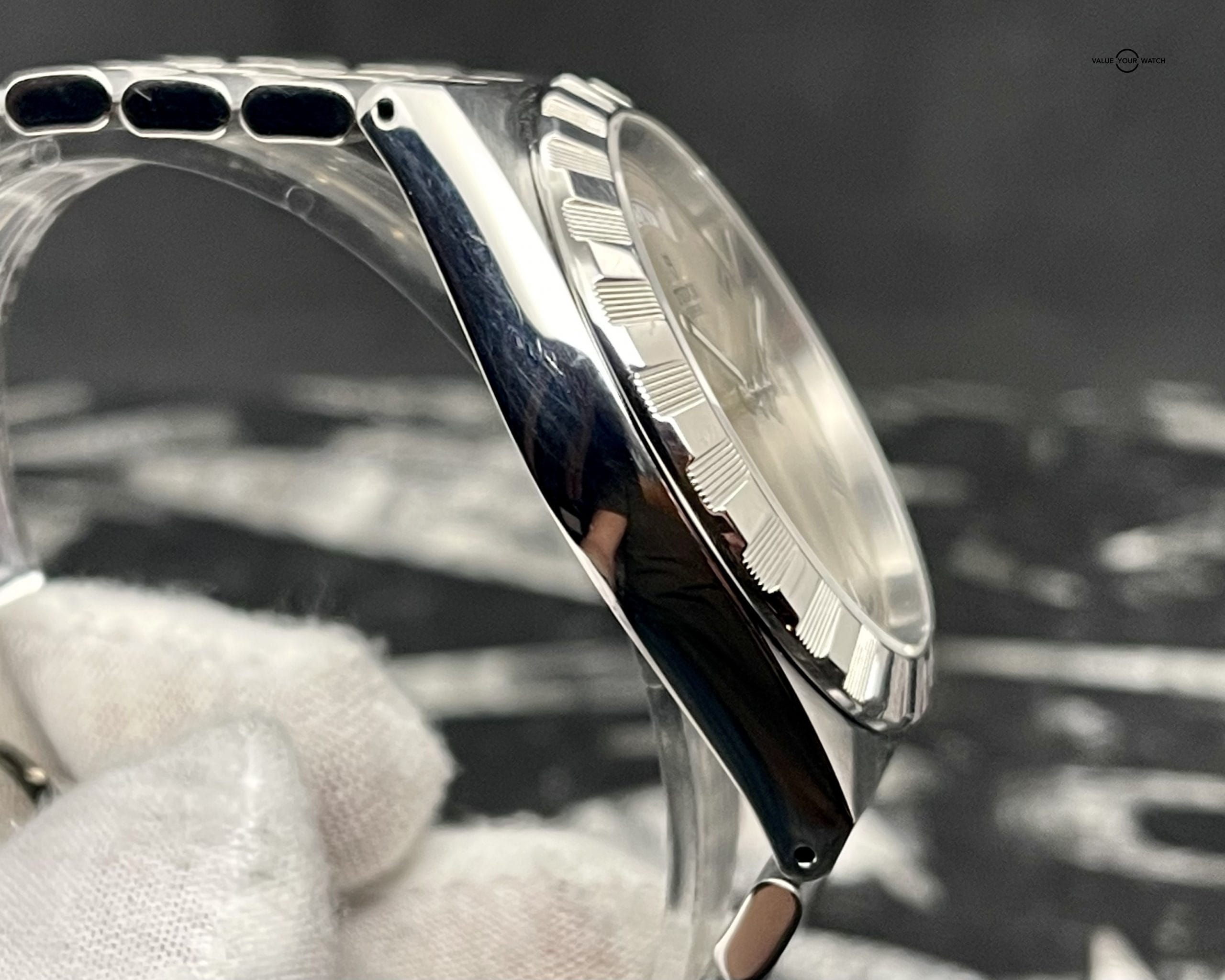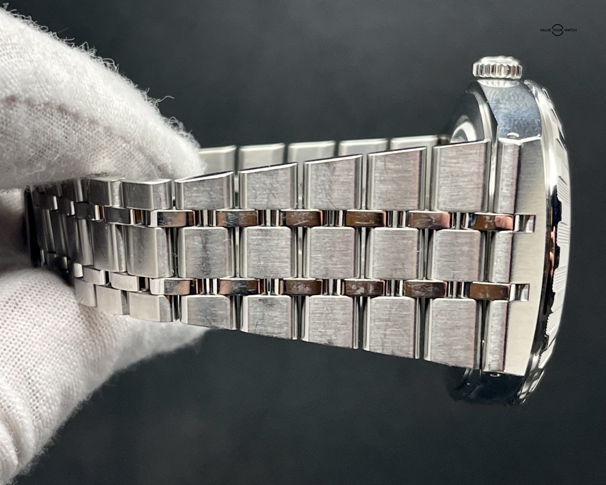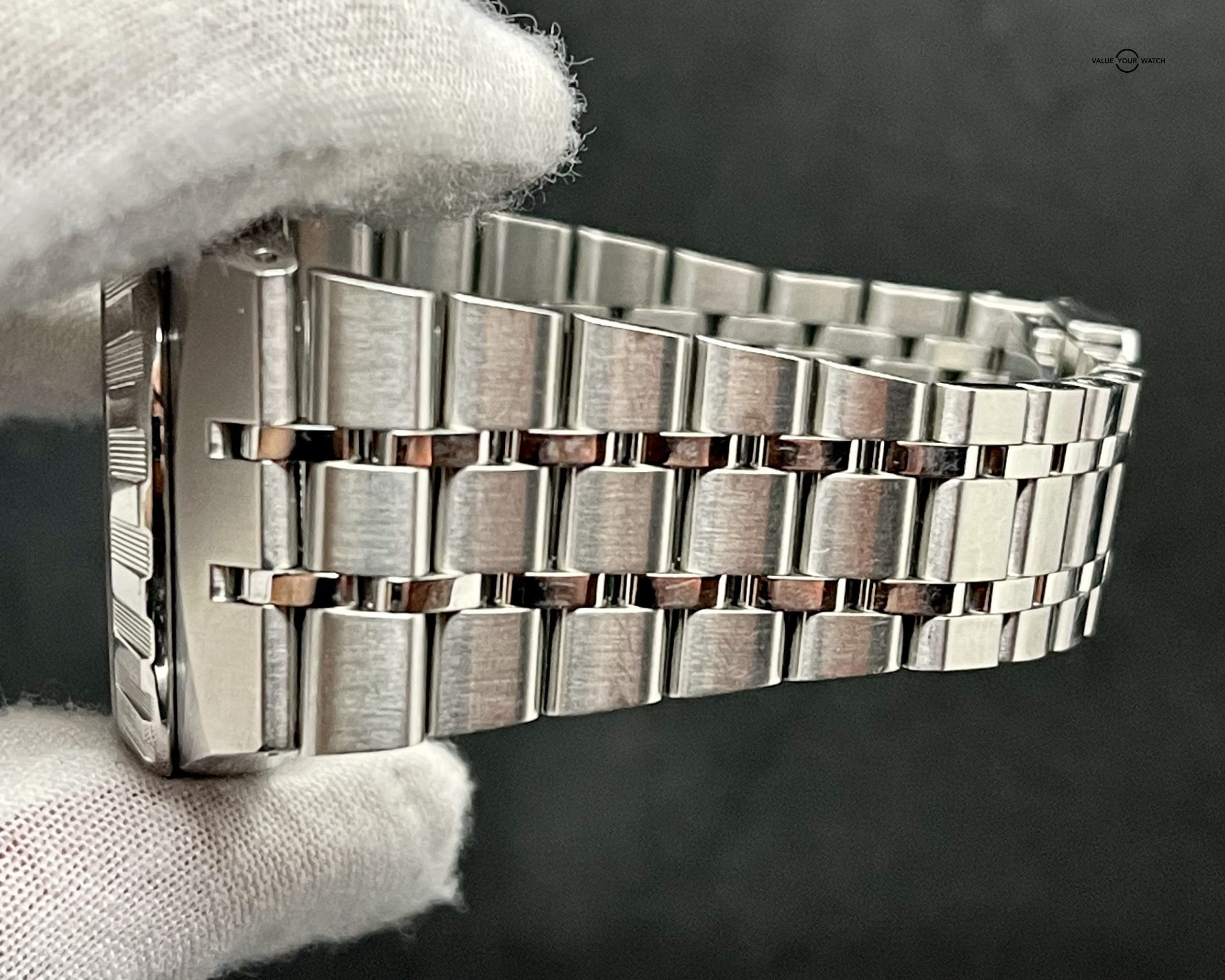 This watch comes with outer box, inner protective foam, inner box, hang tag, extra links, manual, warranty booklet, and filled warranty card. The case shows some slight scratching throughout, the bracelet and buckle show wear from use, and the sapphire crystal is flawless. Get this beautiful pre-owned time piece before it’s gone!